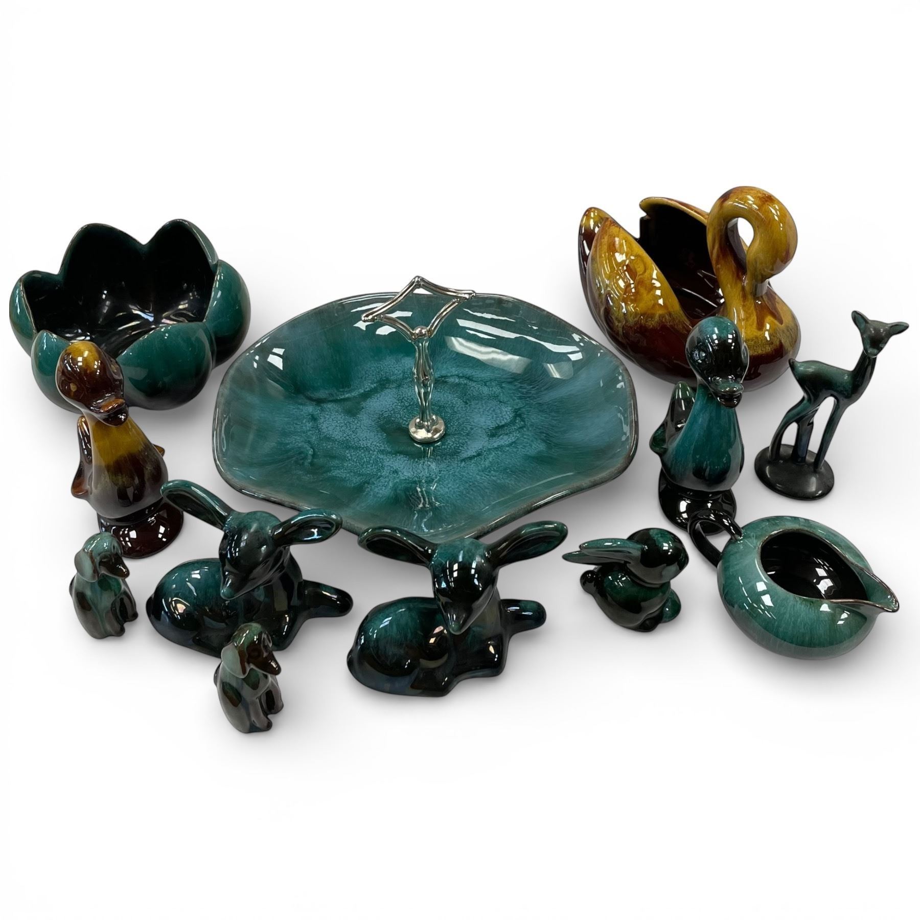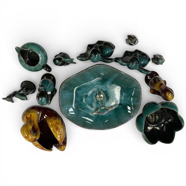 Collection of 12 Blue Mountain Pottery pieces featuring animals including rabbits, dogs, deer, swan, ducks, as well as a bowl, creamer, and additional items. Each piece has distinctive brown or green glazes characteristic of Blue Mountain Pottery. Item is as pictured.