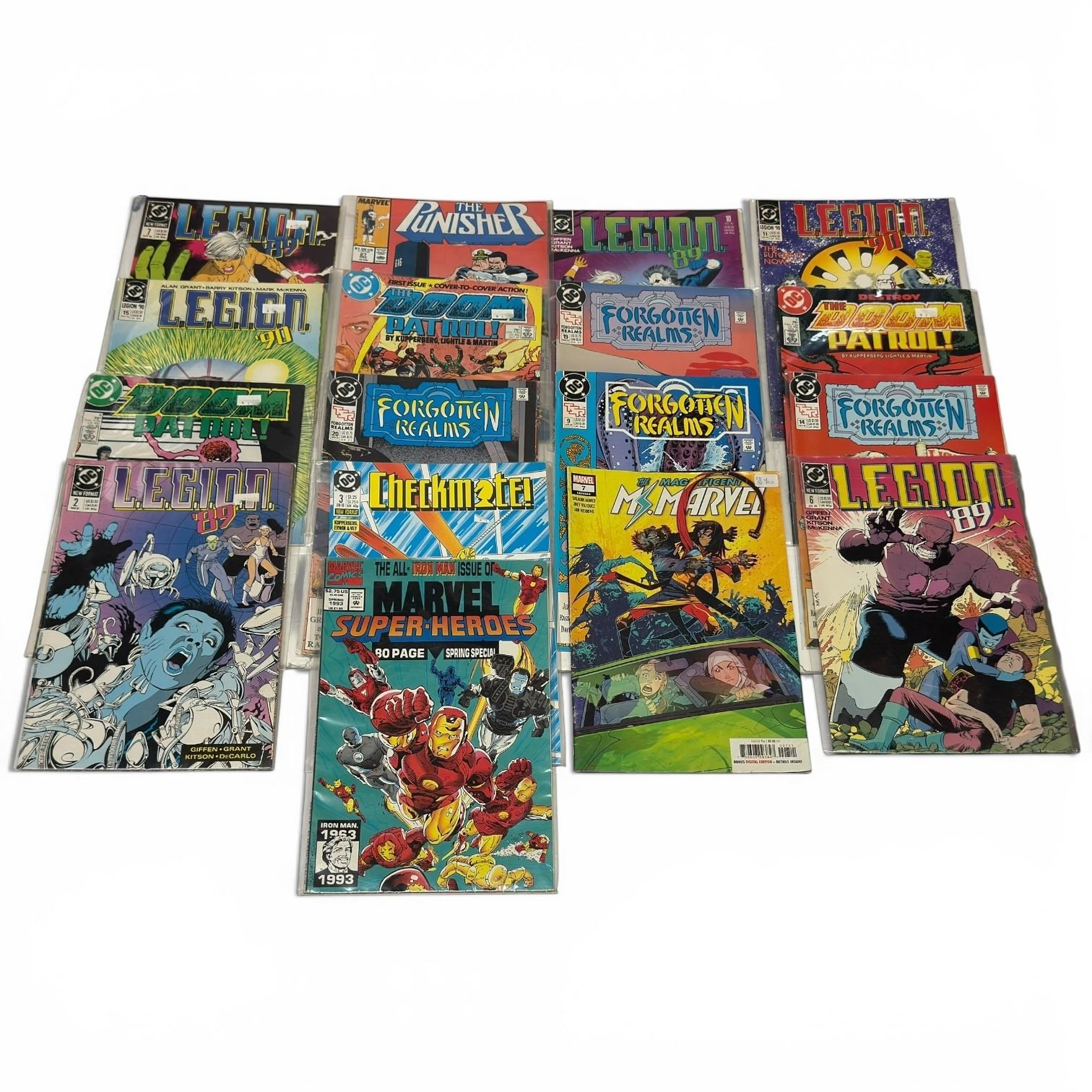 Lot of 17 vintage comics featuring titles such as Legion Doom, Marvel, Checkmate, Punisher and additional unspecified titles. Content variety from multiple publishers and series. Items are as pictured.