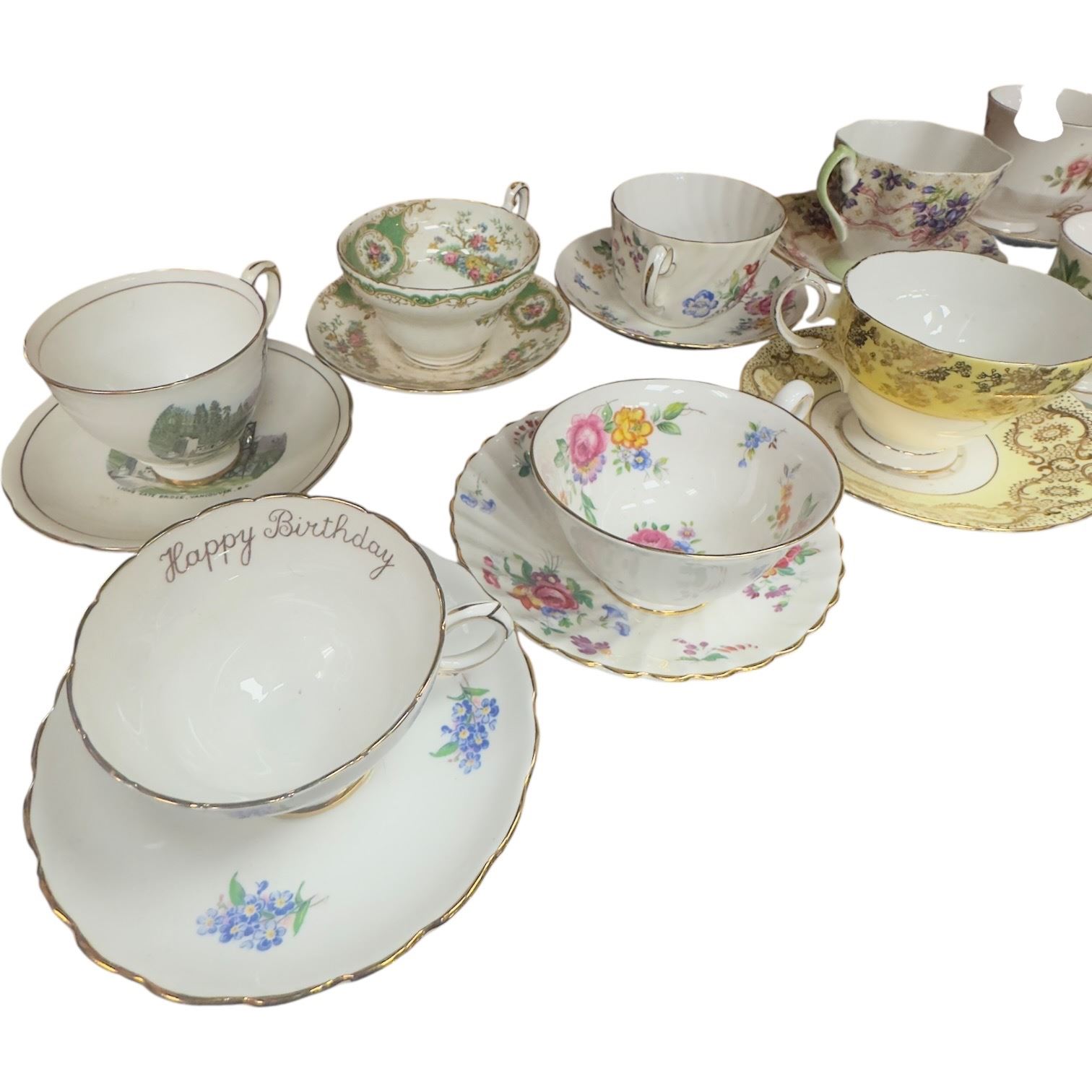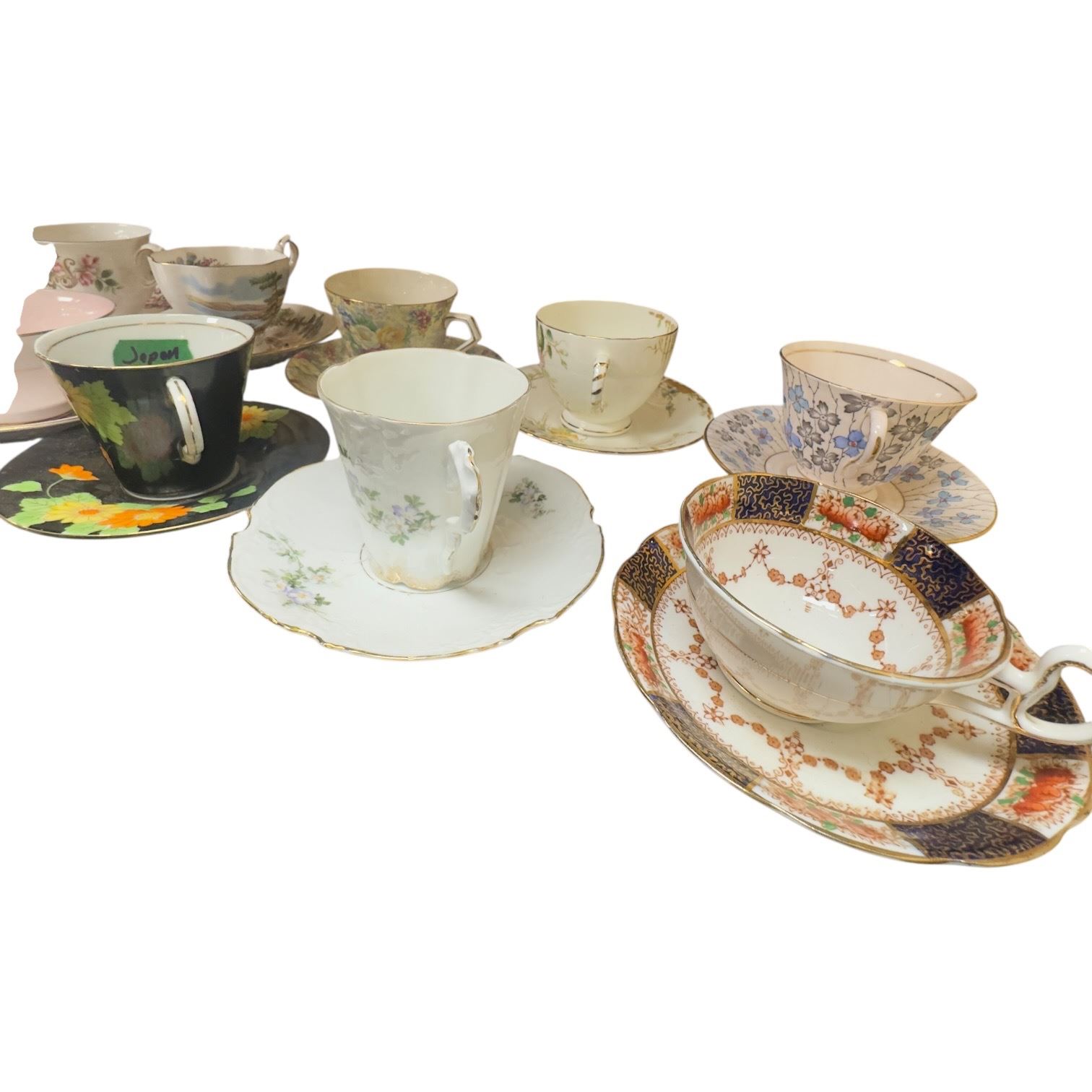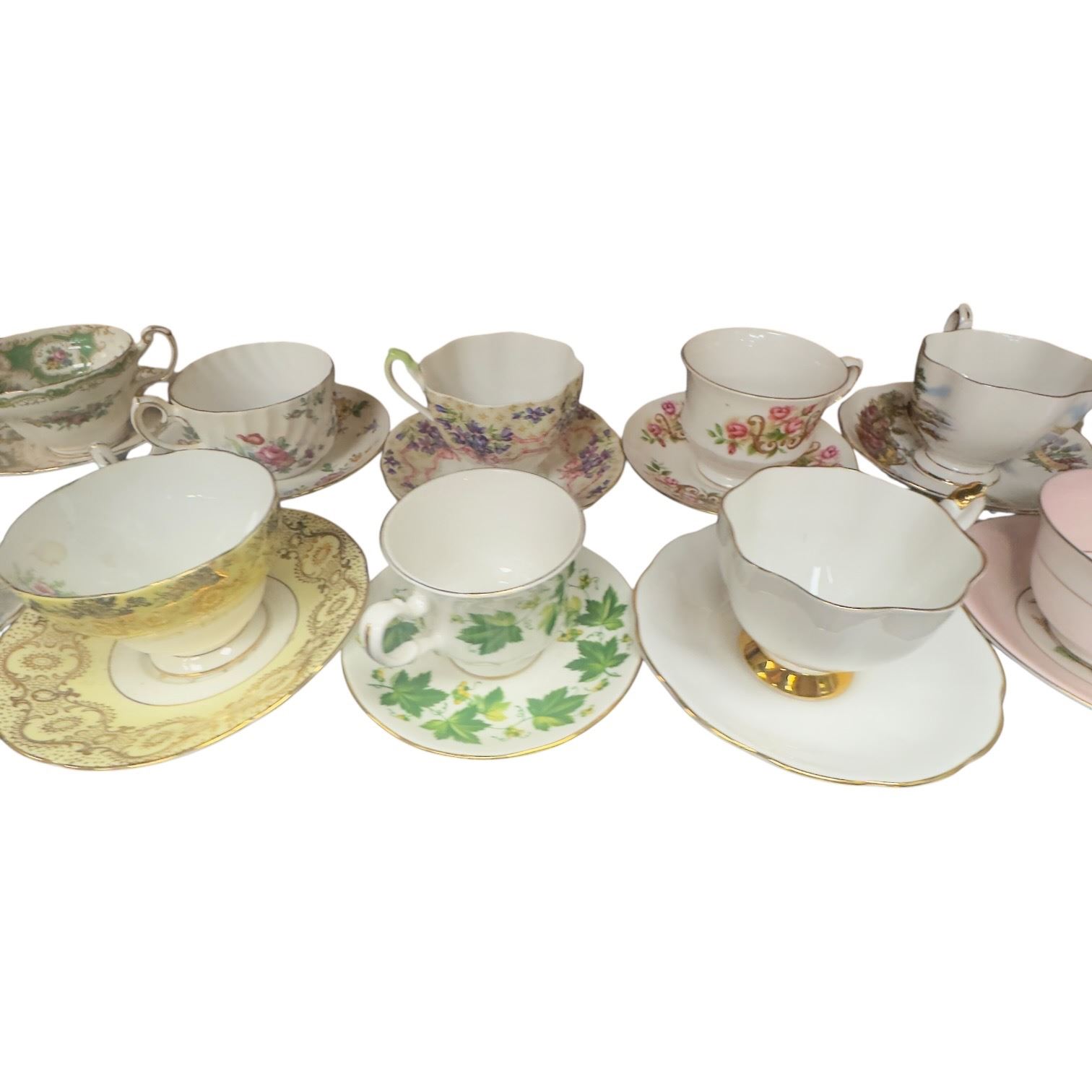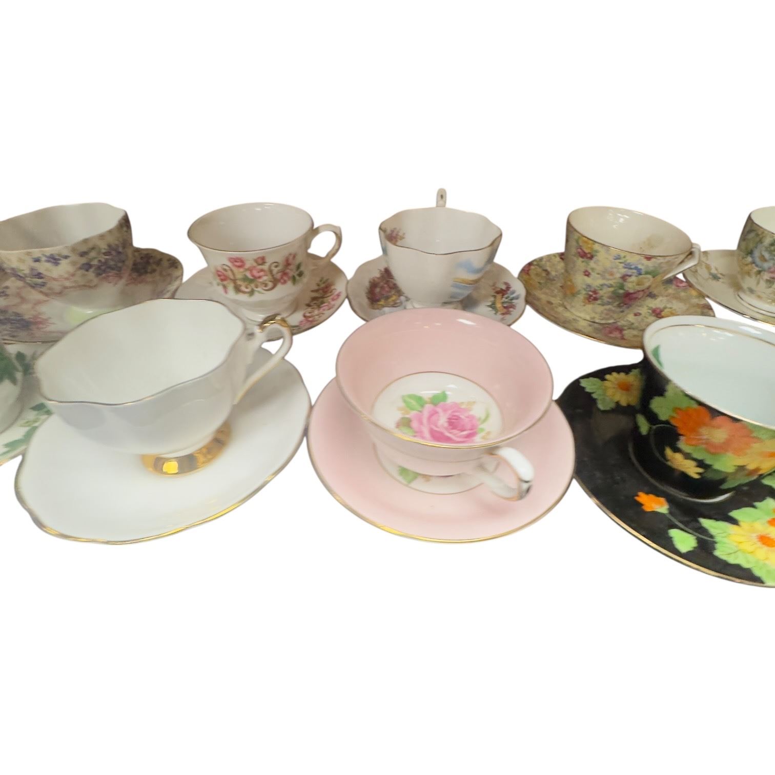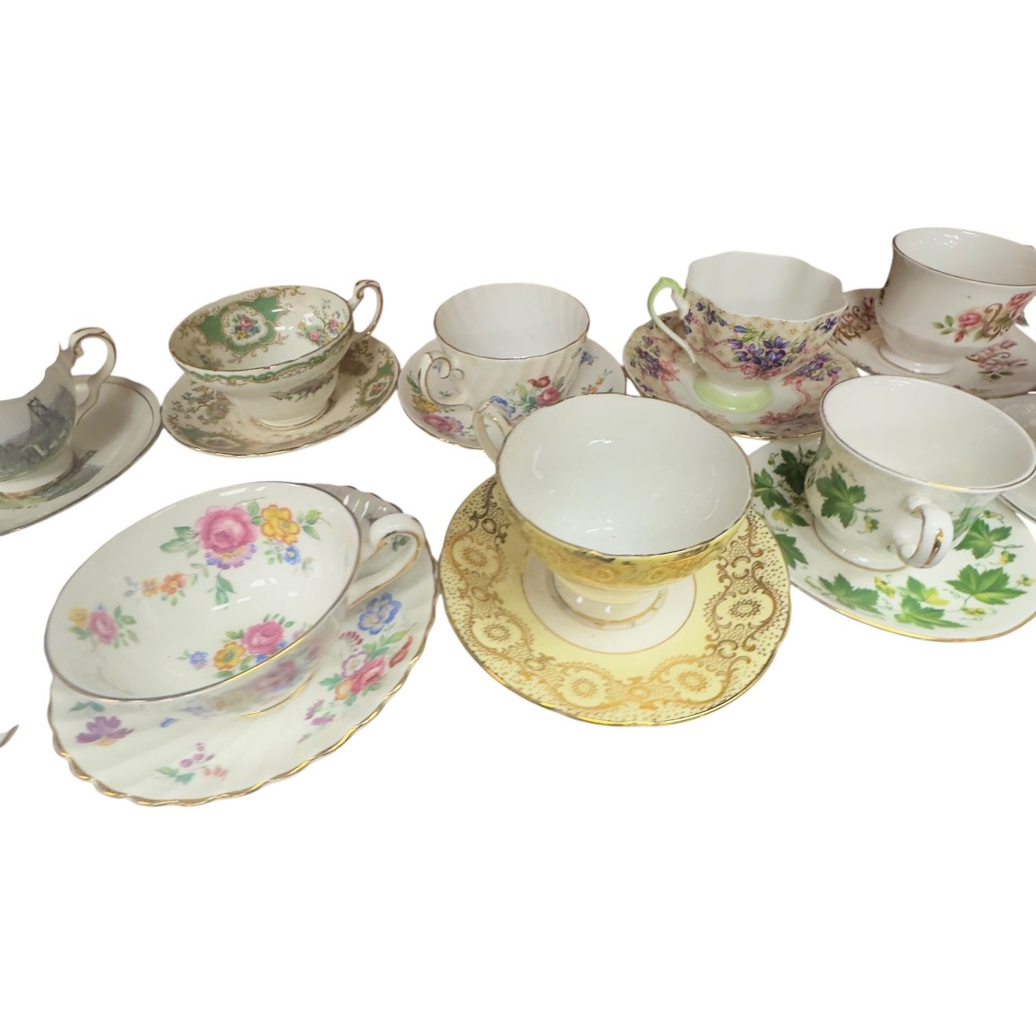 Set of 18 tea cups & saucers featuring brands Rosina, Royal Stafford, E.B., Royal Chelsea, Queen Anne, Taylor & Kent, Lord Nelson Sutherland, Bell and Tuscan. Includes various designs and patterns across the collection. Item is as pictured.
