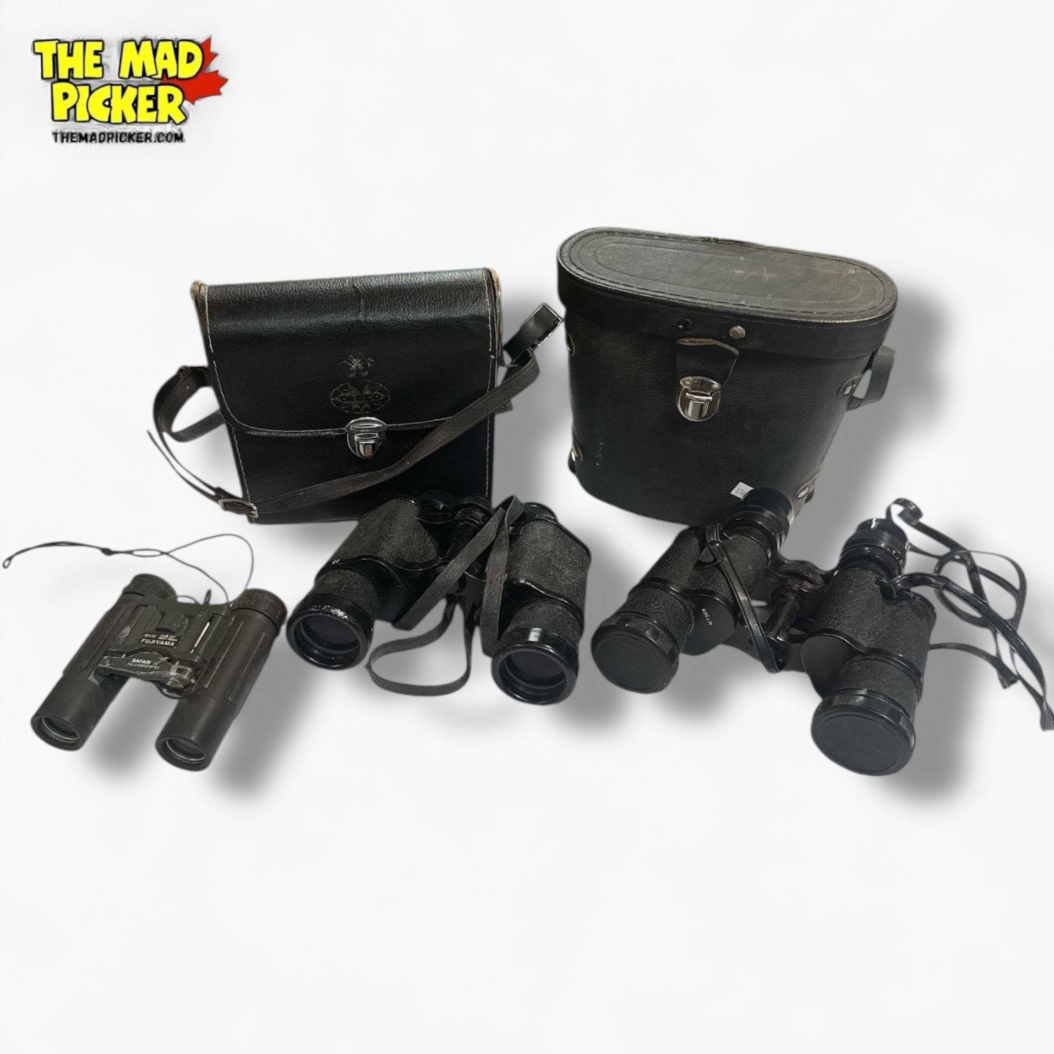 Set of three binoculars including Fujiyama Safari 11, Ensign 7x35, and Tasco Model 305 7x35. Fujiyama Safari features a compact design. Ensign 7x35 offers a wide field of view. Tasco Model 305, also 7x35, is built for general observation. Mixed vintage designs. Condition unverified as stated.