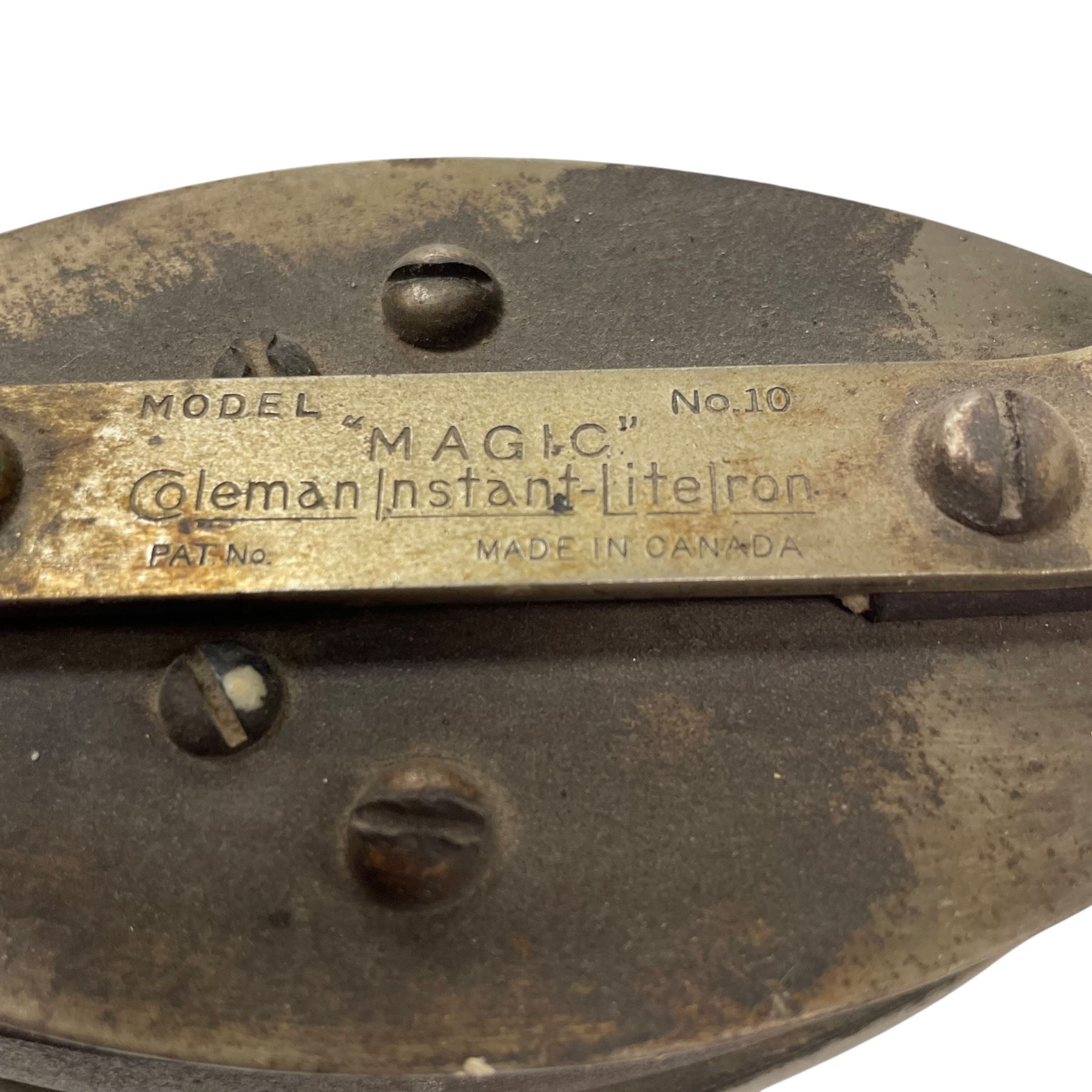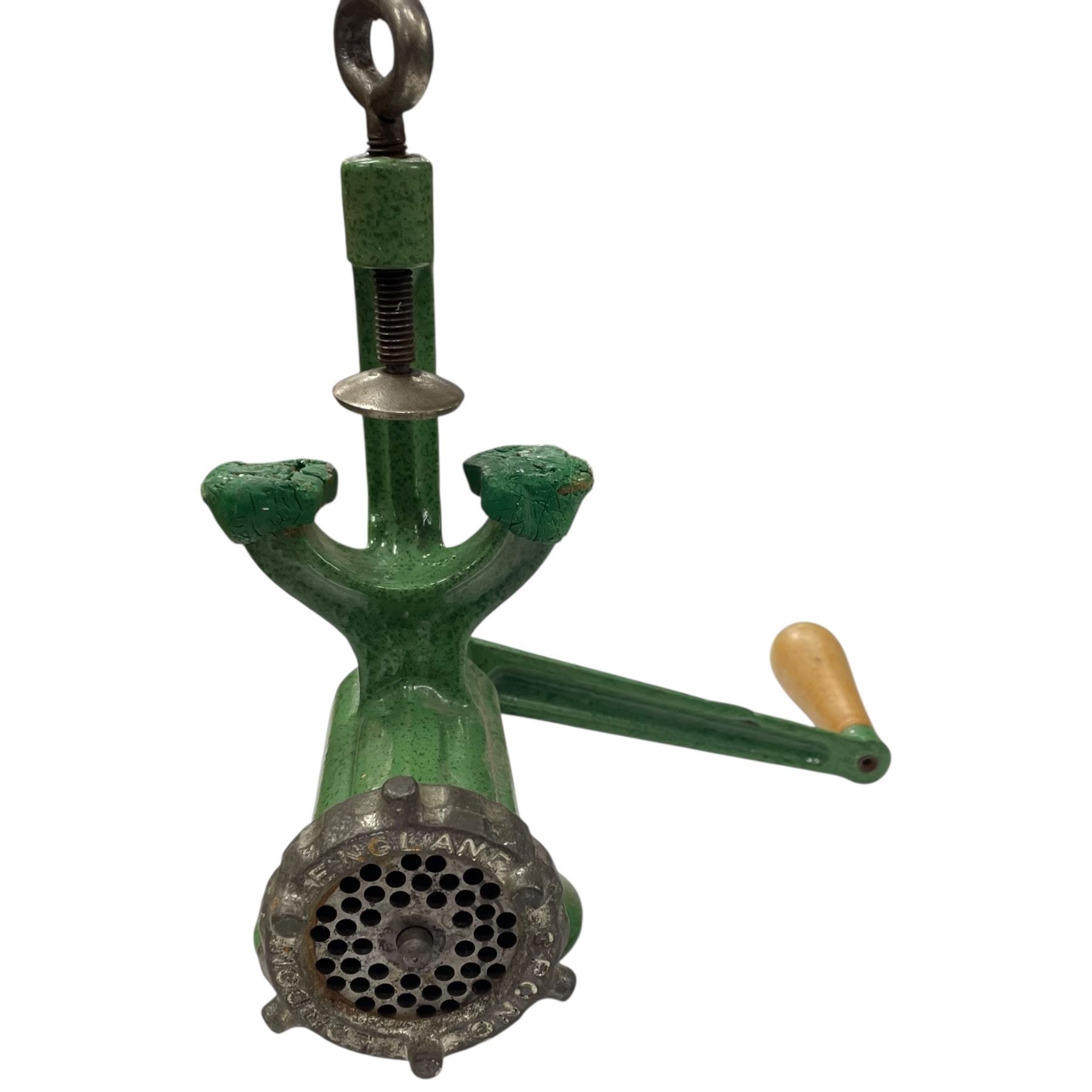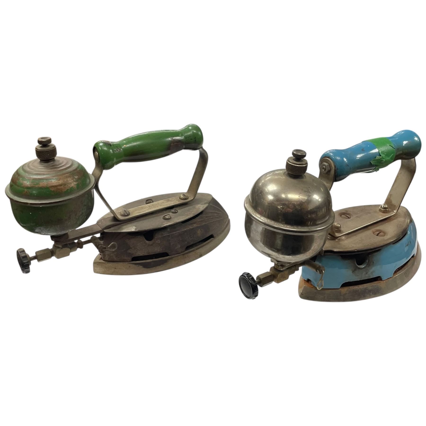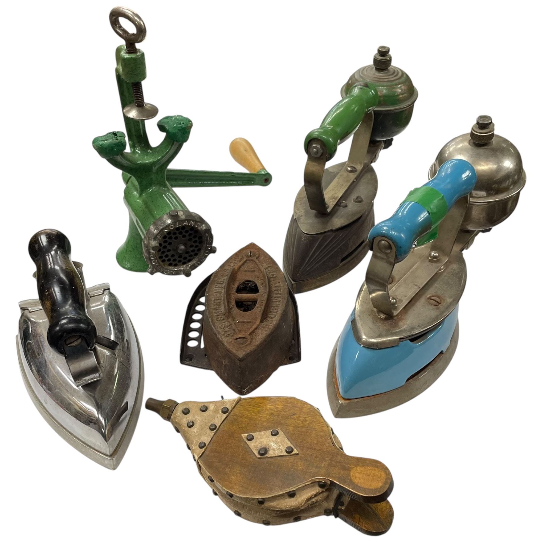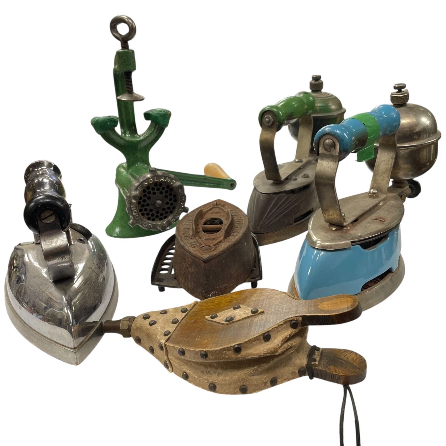 A collection of vintage household items including traditional irons, a meat grinder, and a small bellows. Items feature age-appropriate wear and visible details characteristic of old craftsmanship. Item is as pictured.