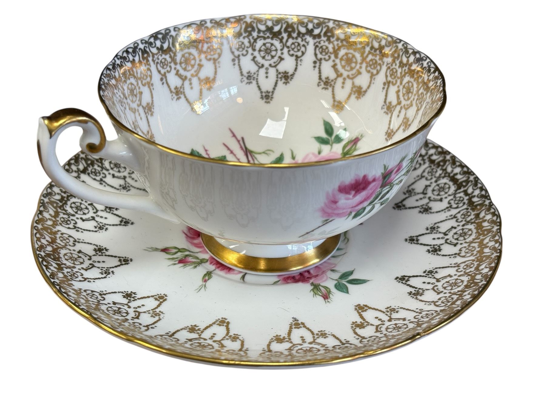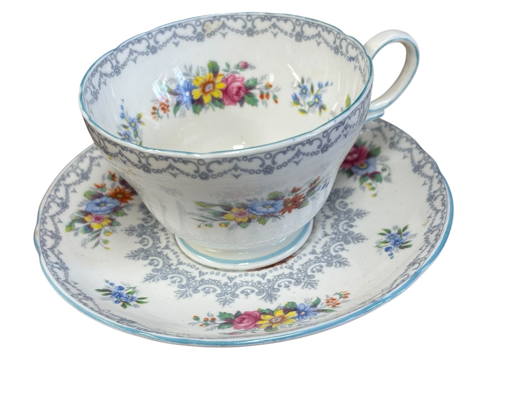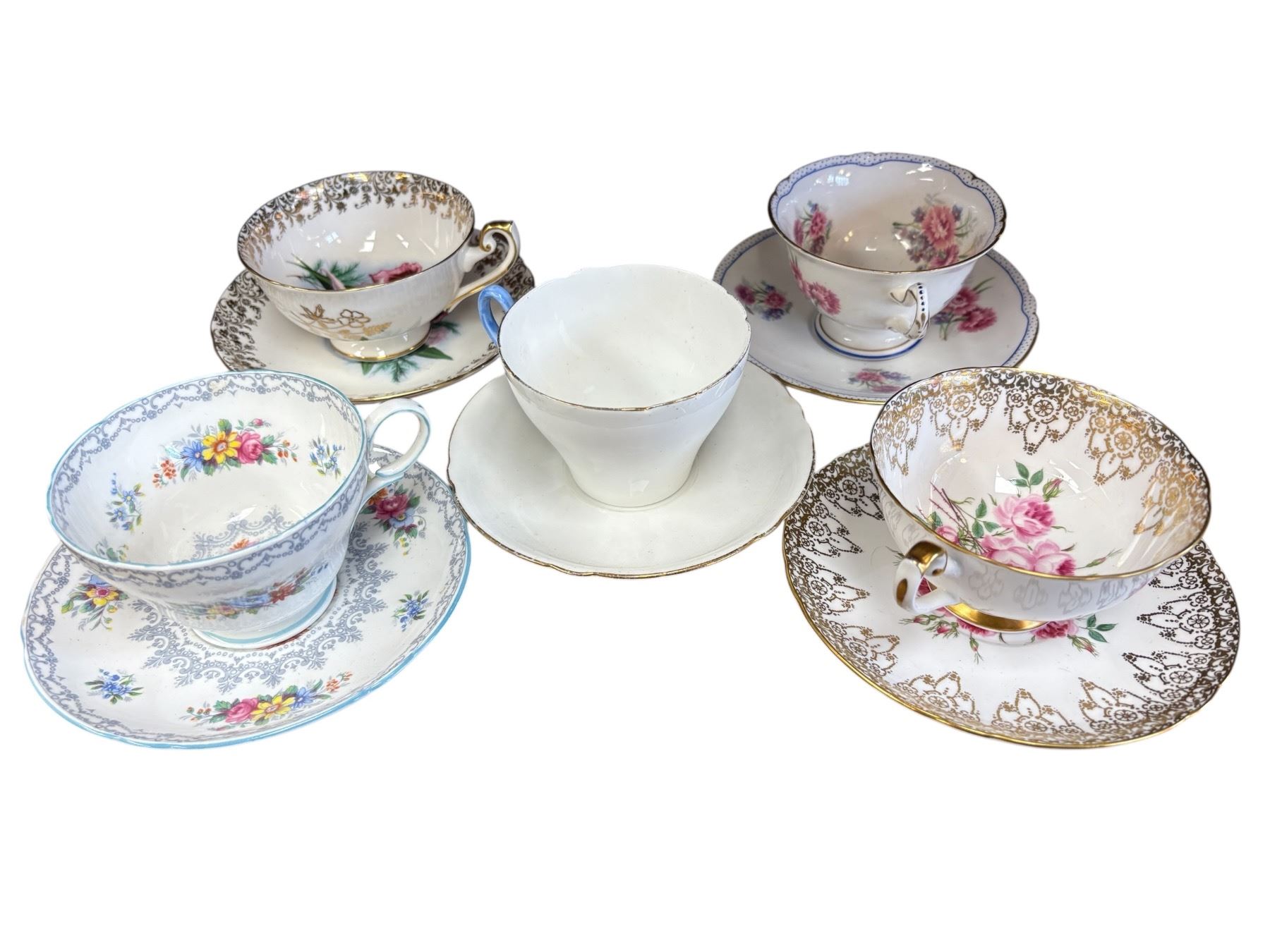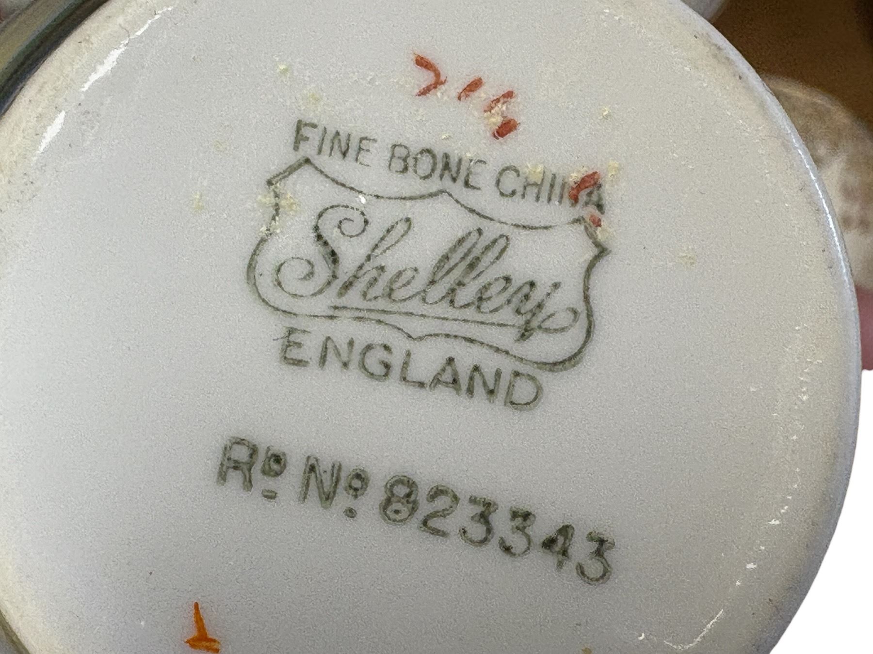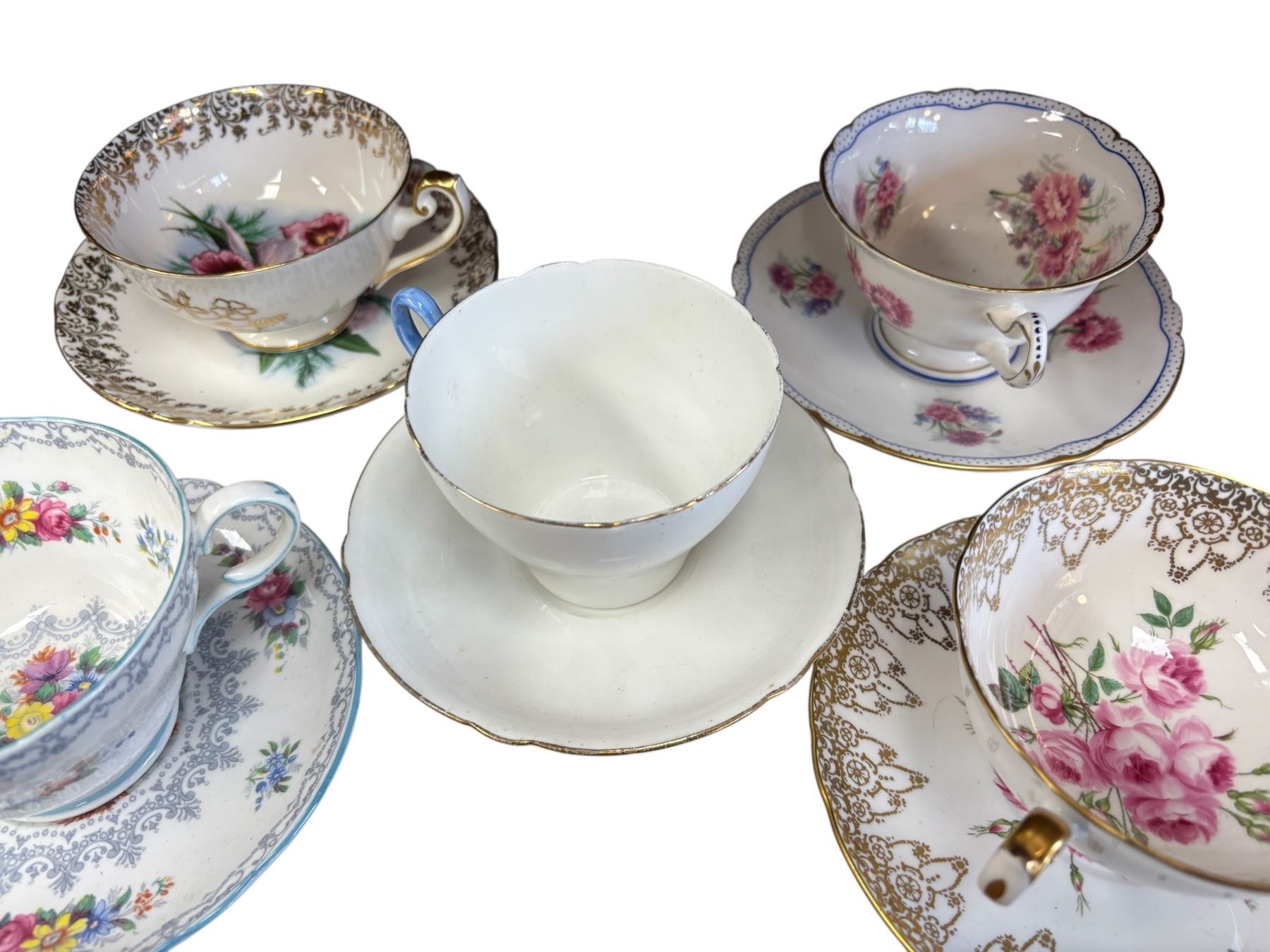 Set of 5 Shelley fine bone china tea cups with matching saucers. Features various floral and geometric patterns, showcasing the brand's signature translucent porcelain. Manufactured in England, mid-20th century. Each piece bears the Shelley backstamp, confirming authenticity.