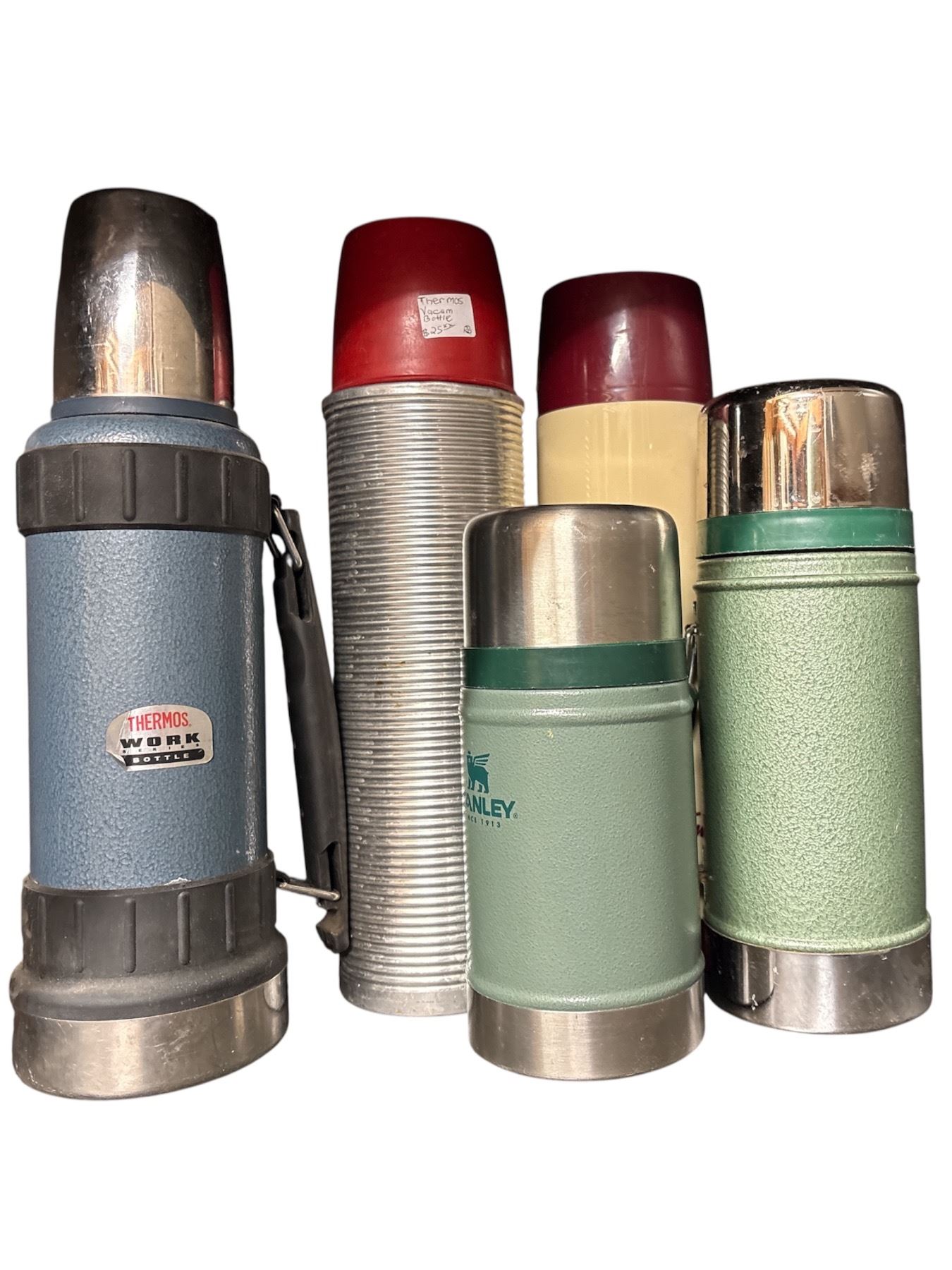 This lot includes a collection of 5 thermoses in vintage and modern styles, featuring brands such as Stanley, Thermos, Tim Hortons, and others. Items are as pictured, showcasing various designs and functional features. Ideal for use or display in a variety of settings.