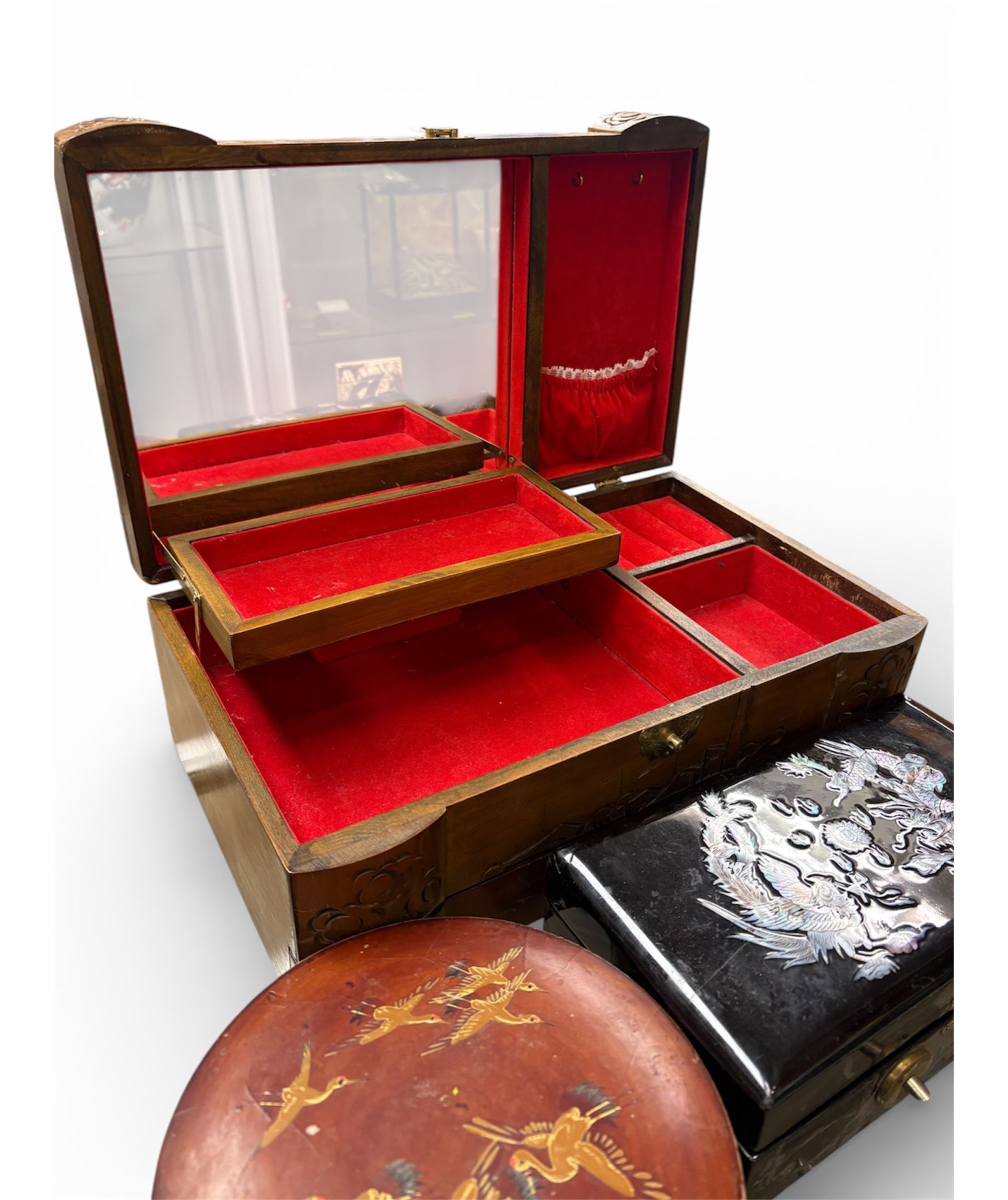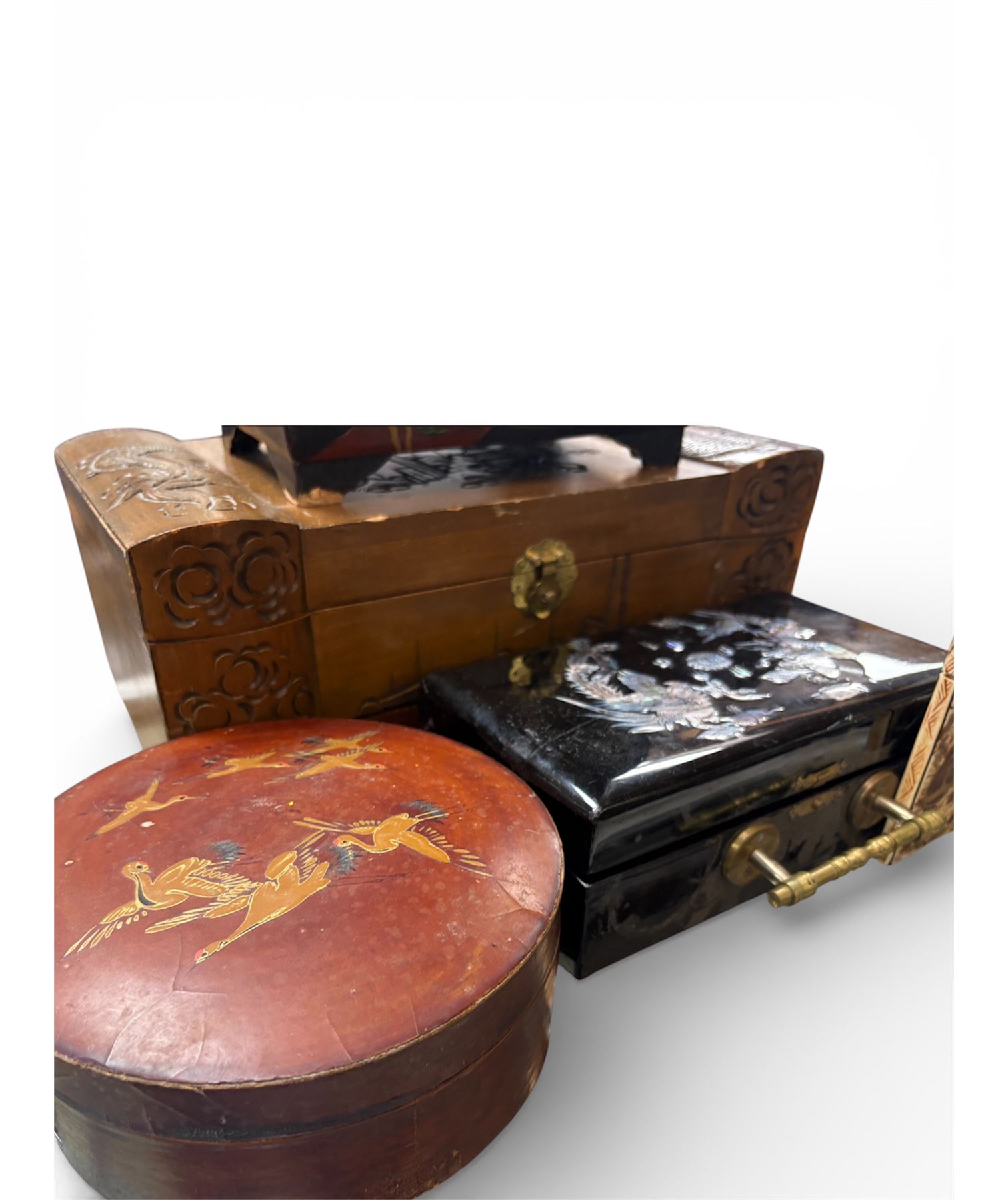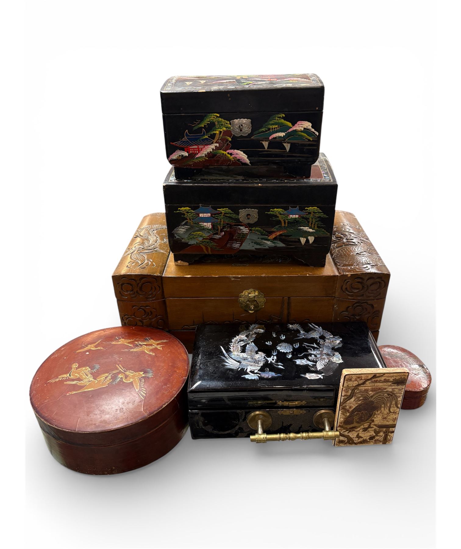 Set of 7 assorted Asian jewelry and decorative boxes. Includes various designs and materials, such as lacquer, wood, and metal with inlays or painted motifs. Features a mix of traditional Asian patterns and decorative elements. Sizes and shapes vary within the collection.