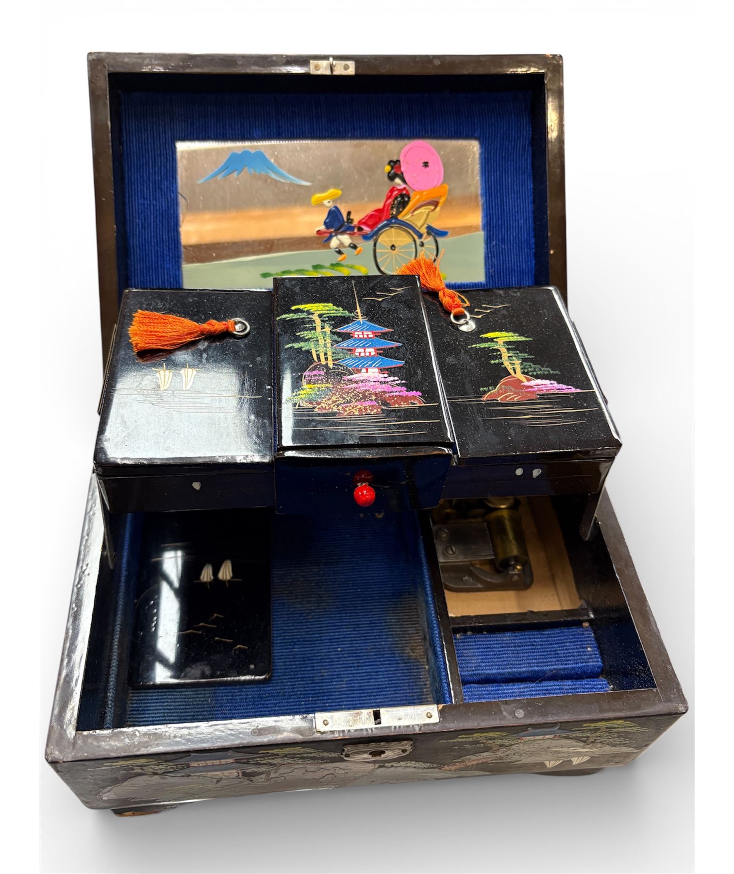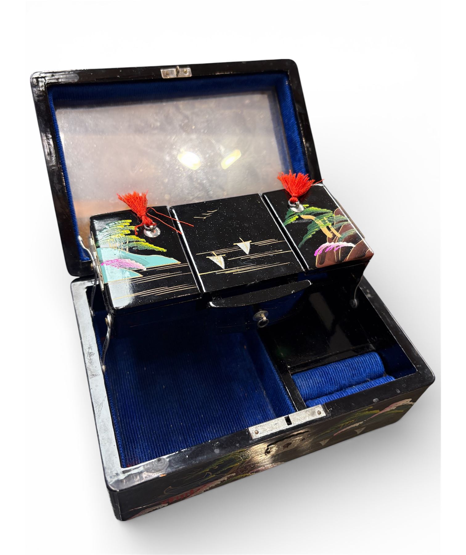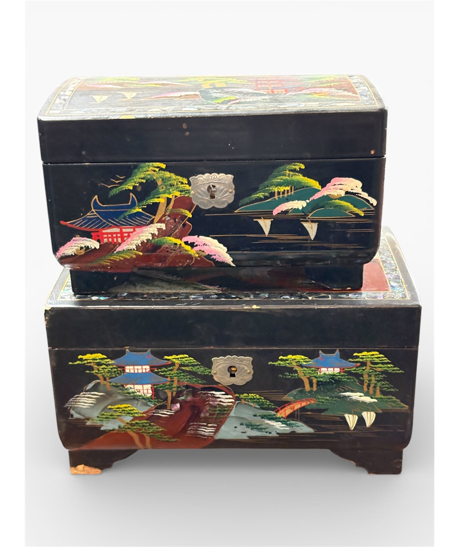Set of 7 assorted Asian jewelry and decorative boxes. Includes various designs and materials, such as lacquer, wood, and metal with inlays or painted motifs. Features a mix of traditional Asian patterns and decorative elements. Sizes and shapes vary within the collection.