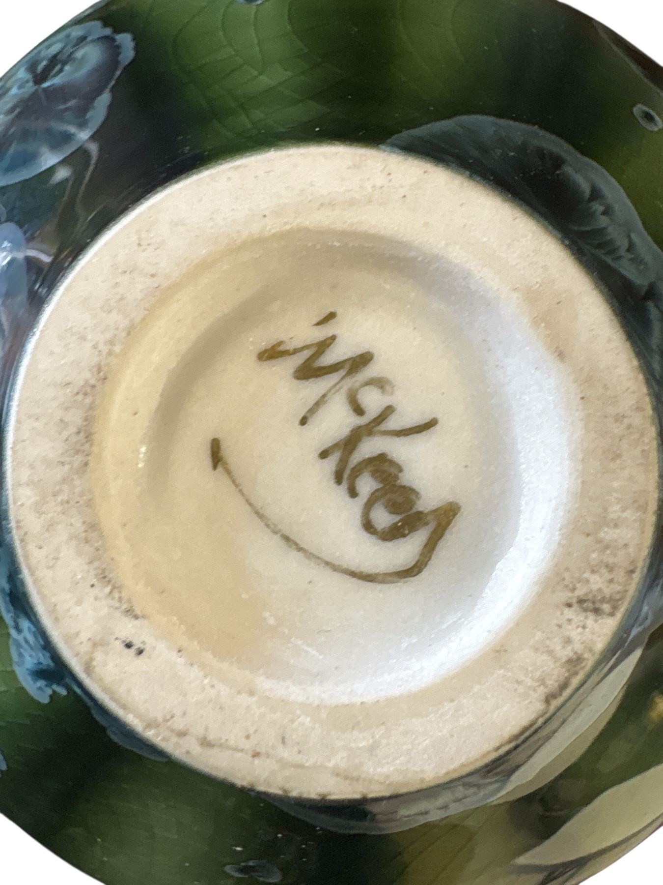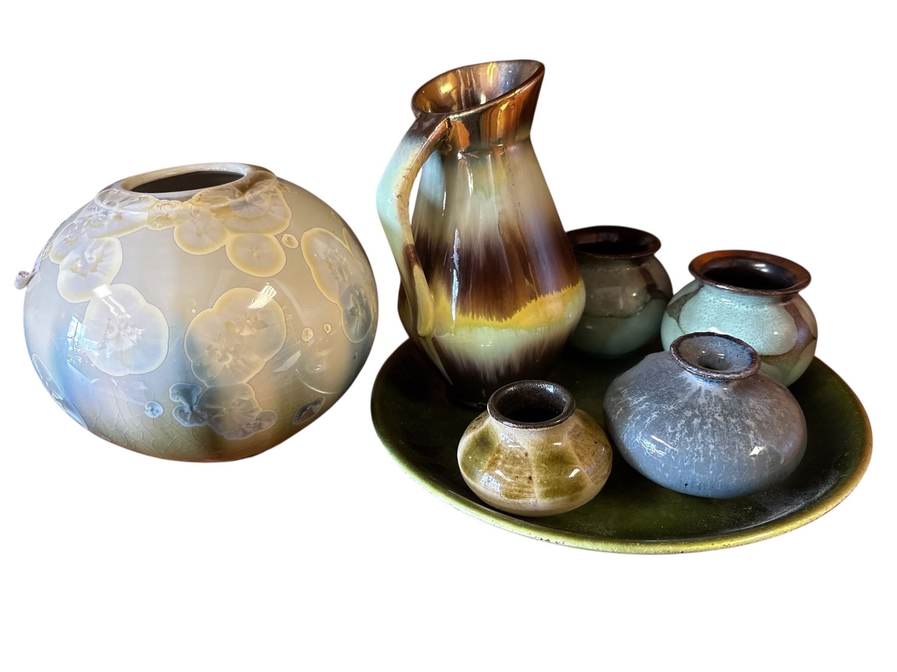 Seven-piece collection of glazed ceramics featuring a crystalline vase by Holly McKeen and items of German origin. Tallest piece measures 5.5 inches. Includes various styles and glazes as pictured. Distinctive craftsmanship in diverse ceramic designs. Item is as pictured.