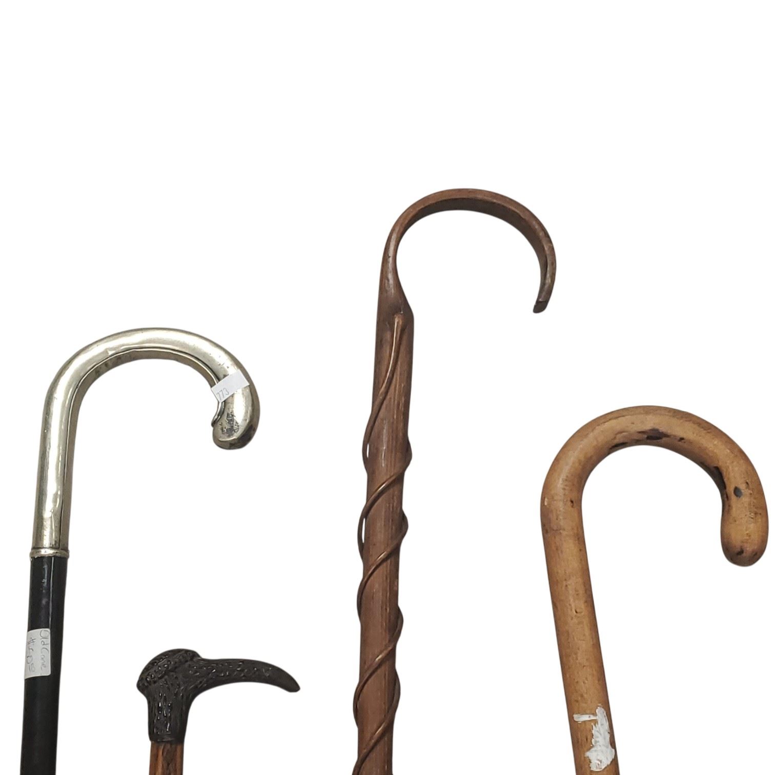 Set of 7 walking sticks and canes, vintage and antique examples. Includes various designs and materials, showcasing craftsmanship from differing eras. Item is as pictured.