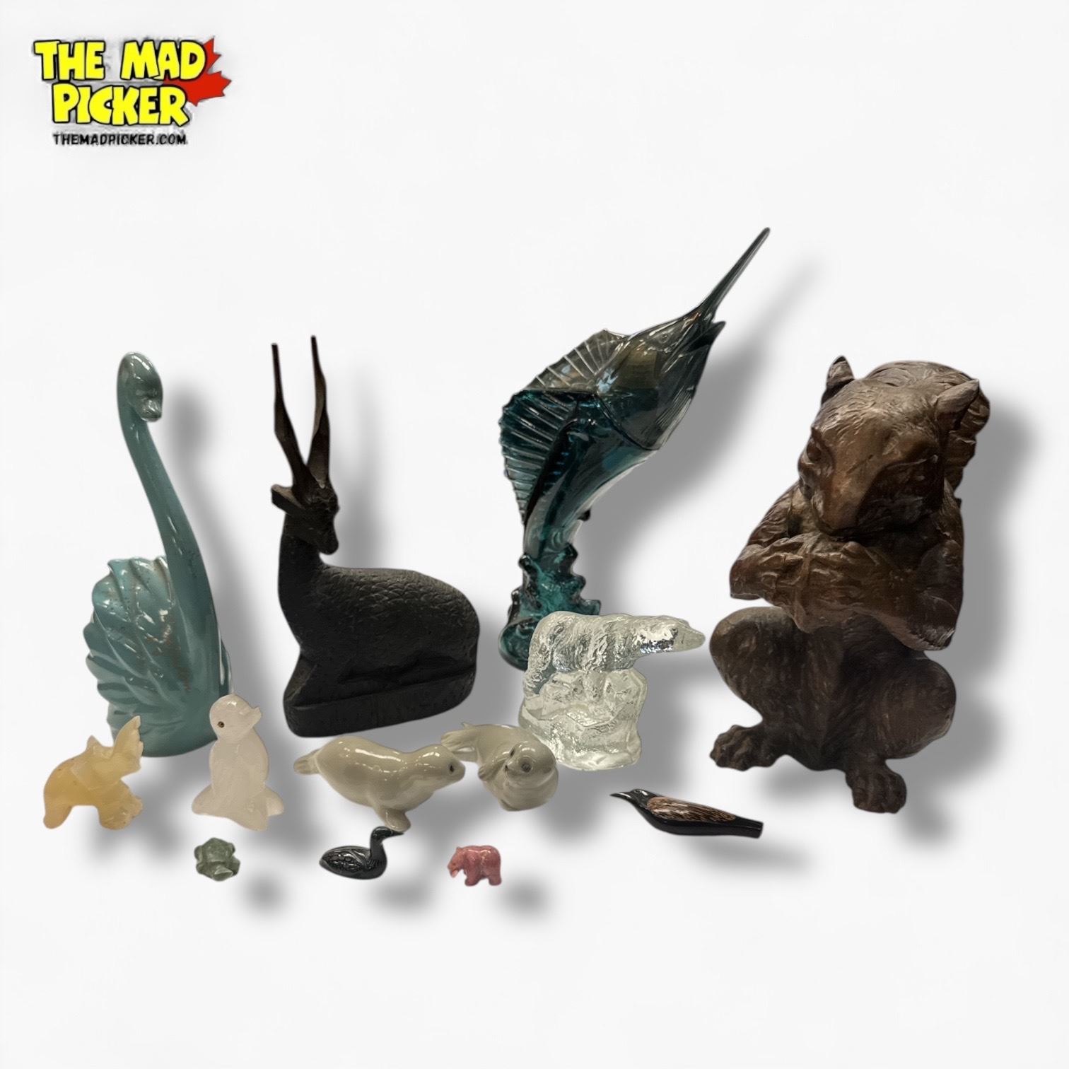 Diverse collection featuring animal figurines crafted in materials such as glass, marble quartz, jade, wood, and porcelain. Includes multiple animal types and designs, showcasing varying techniques and styles from different periods and origins. Specific maker and measurements not specified.