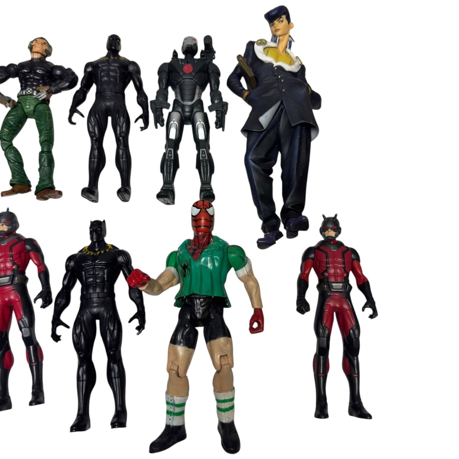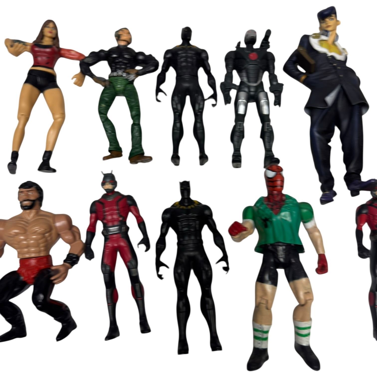 Collection of assorted action figures featuring Spider-Man, Black Panther, Wolverine and a Battlestar Galactica Bend-Ems figure of Starbuck (packaged). Includes additional figures. Items are as pictured and includes various brands and eras.