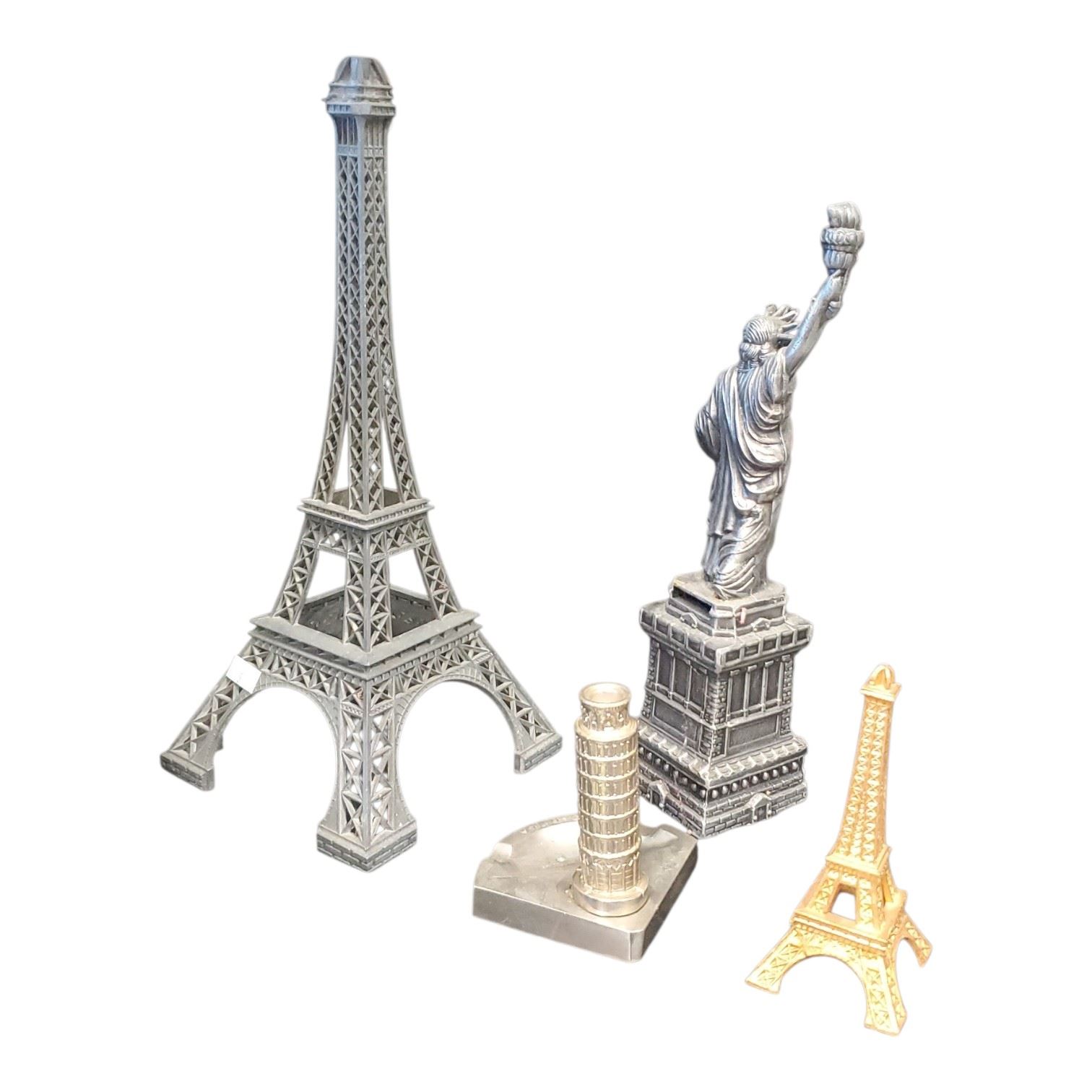 Collection of cast metal souvenir replicas including the Eiffel Tower, Statue of Liberty, and Leaning Tower of Pisa. Tallest piece measures 13-Inch in height. Each item is crafted in metal with intricate detailing. Items are as pictured.