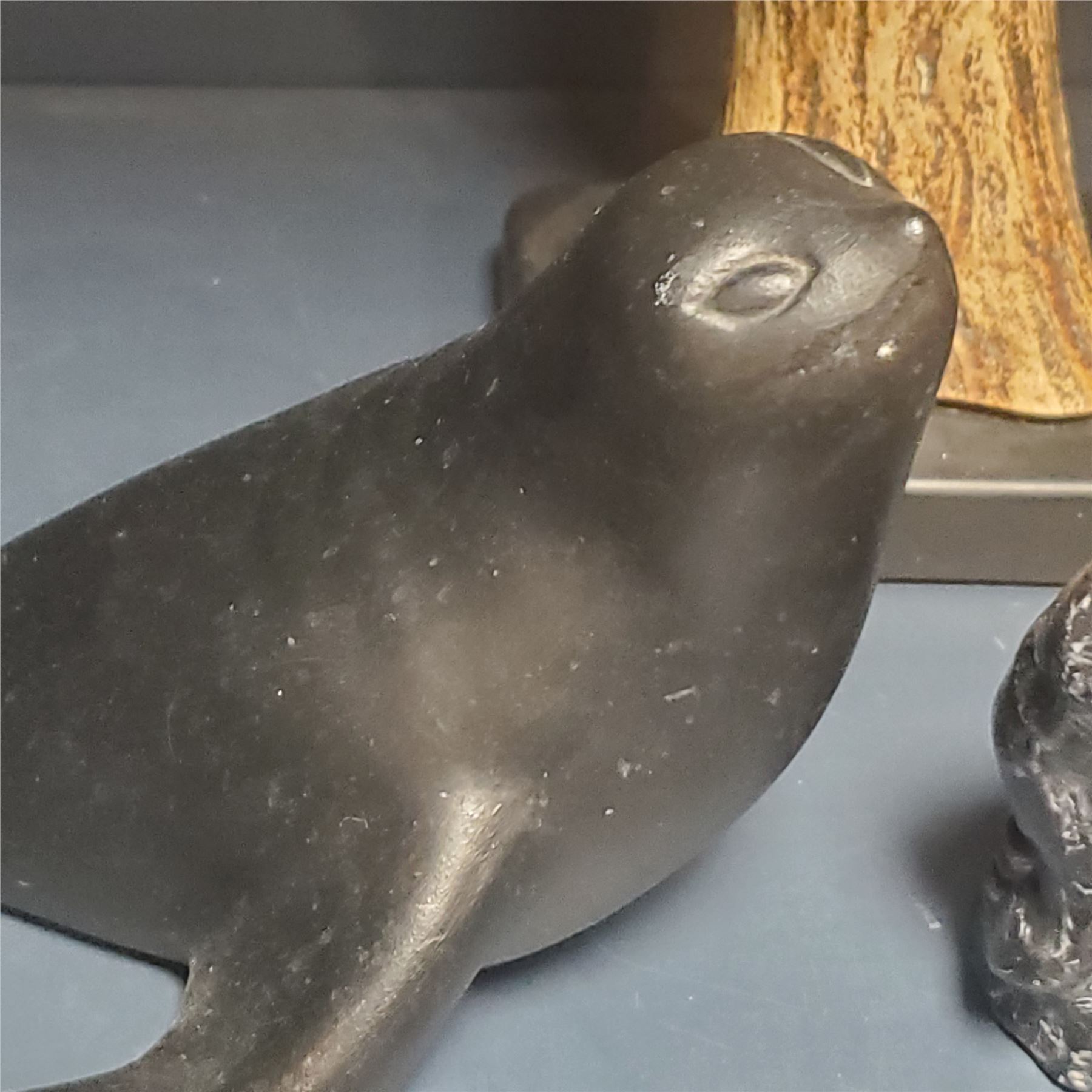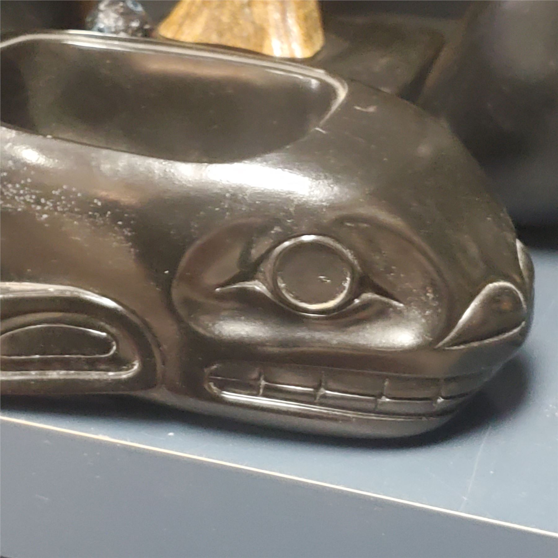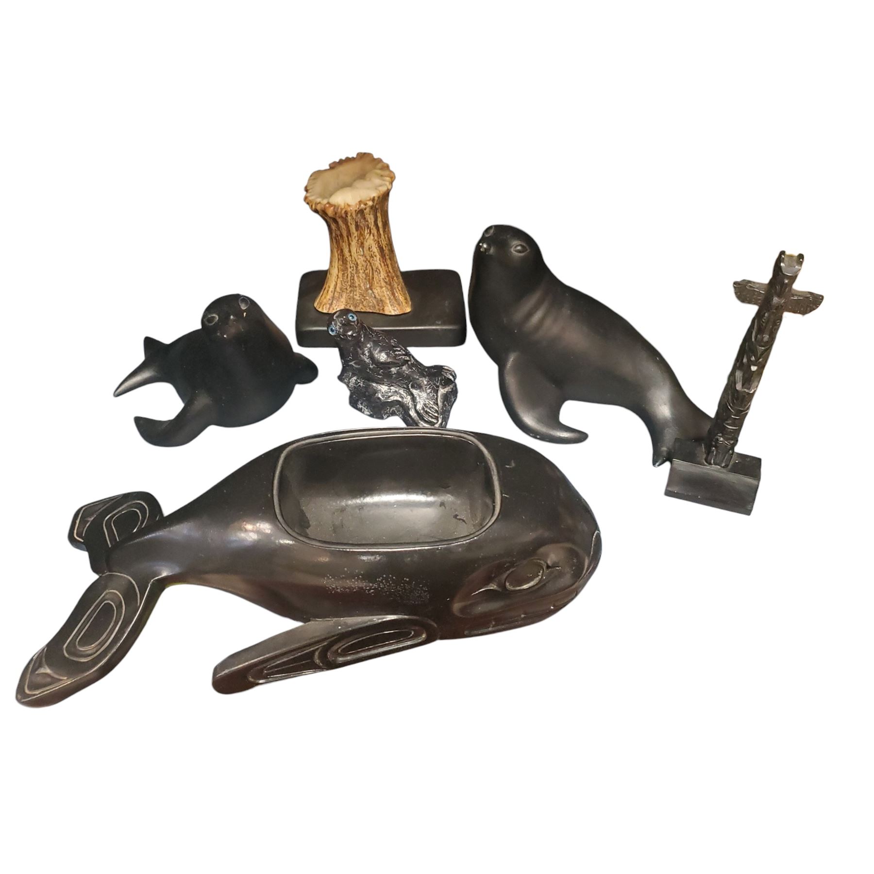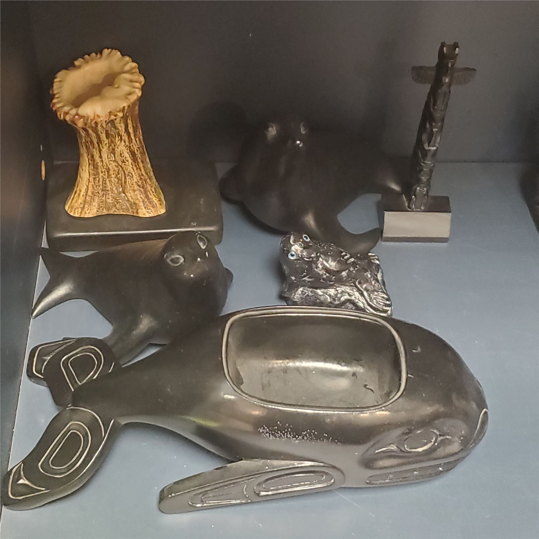 Assorted decorative collectibles featuring varied materials and designs. Includes First Nations Boma items, pearlite pieces, antler crafts, ceramics and additional elements. Item is as pictured.
