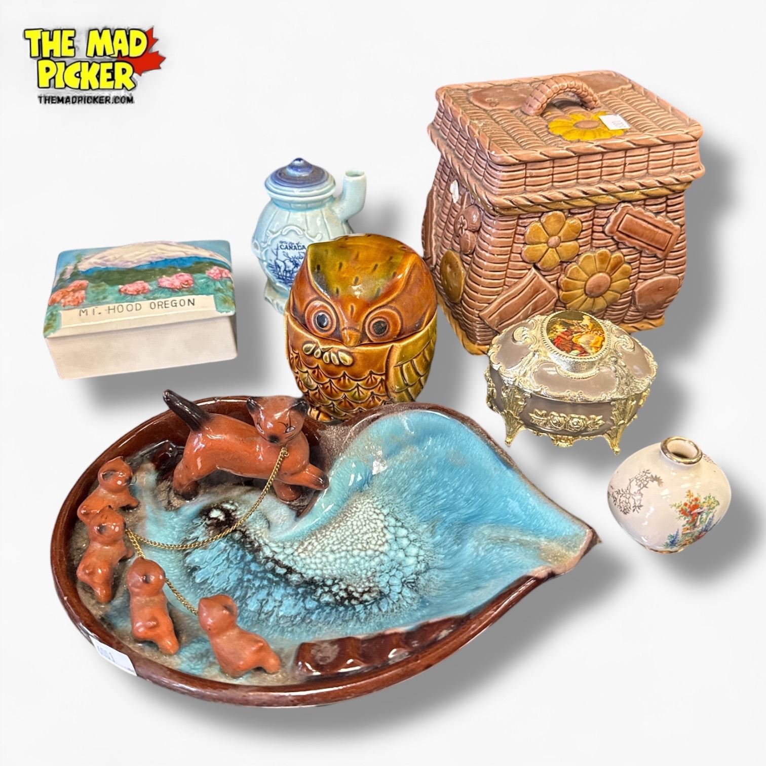 A mixed collection of porcelain boxes and dishes, including pieces marked as made in Japan and various souvenir items. Features diverse designs and motifs. Multiple shapes and sizes included. Ideal for decorative use or display collections.