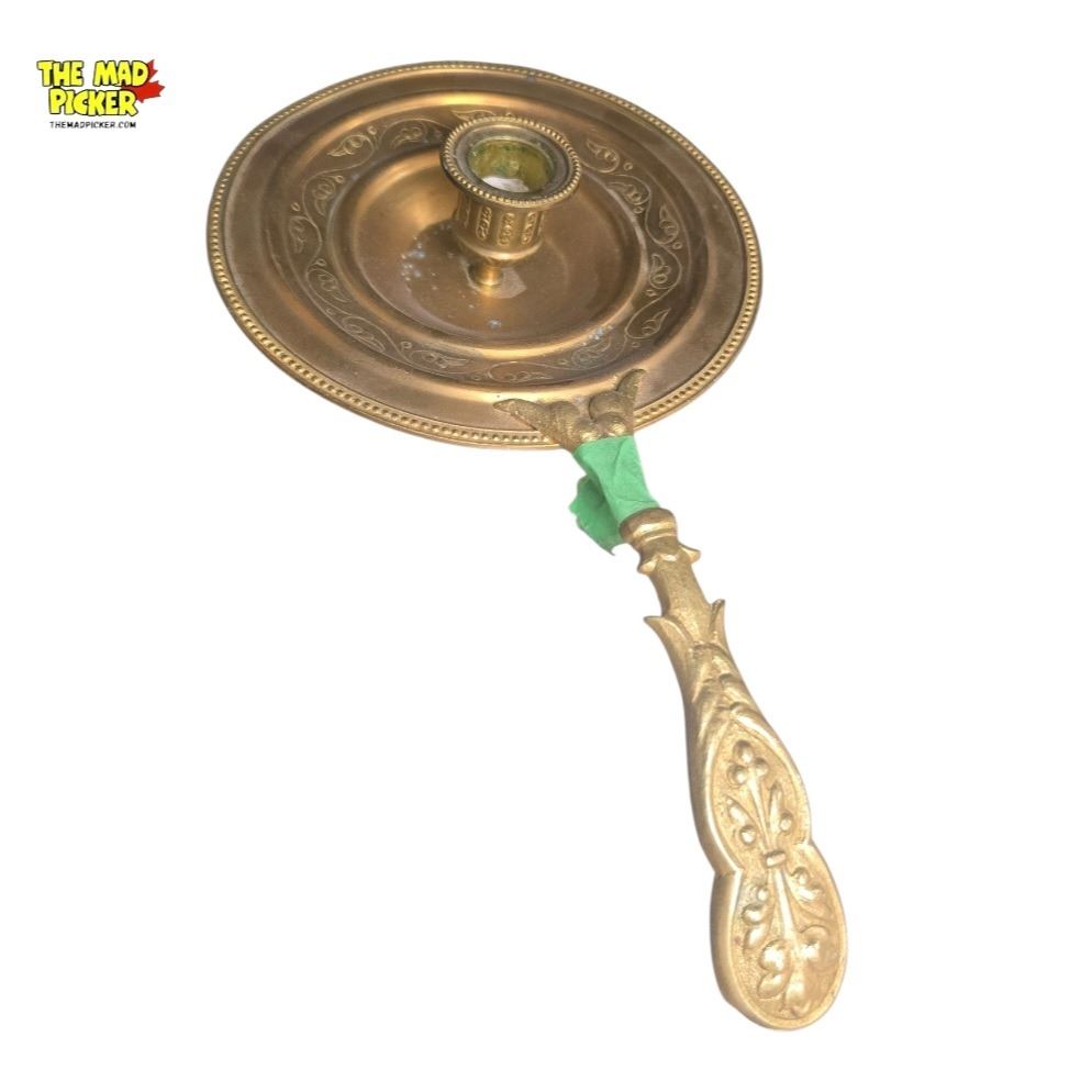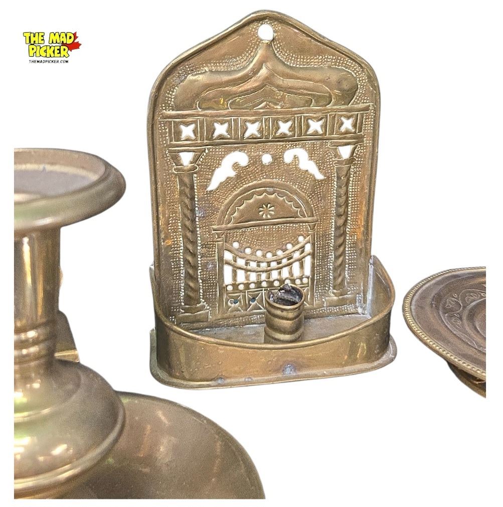 Set of brass candlestick holders in varying designs and heights. Tallest piece measures 11.5 inches. Made of solid brass with polished finishes. Suitable for both decorative and functional use. Age and origin unspecified, condition consistent with use and patina typical of brass items.