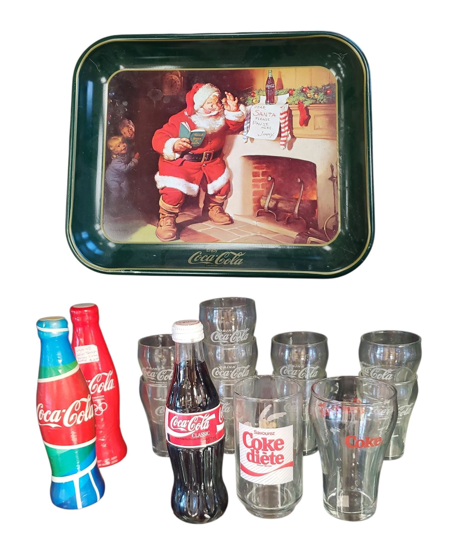 Collection of Coca Cola branded items including Olympics-themed memorabilia, glasses, trays and additional merchandise. Items feature Coca Cola's iconic branding and designs associated with promotional campaigns. All items are as pictured and include a mix of collectibles.