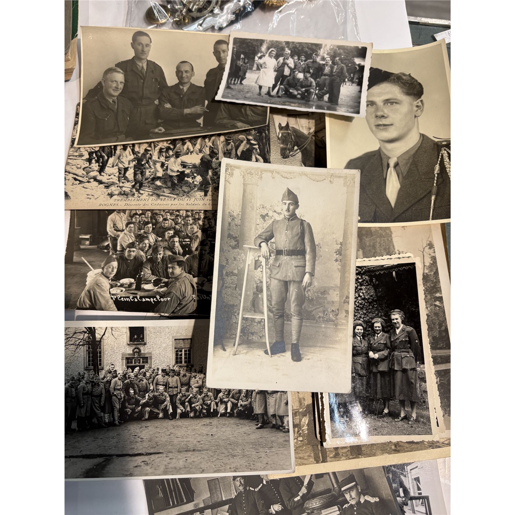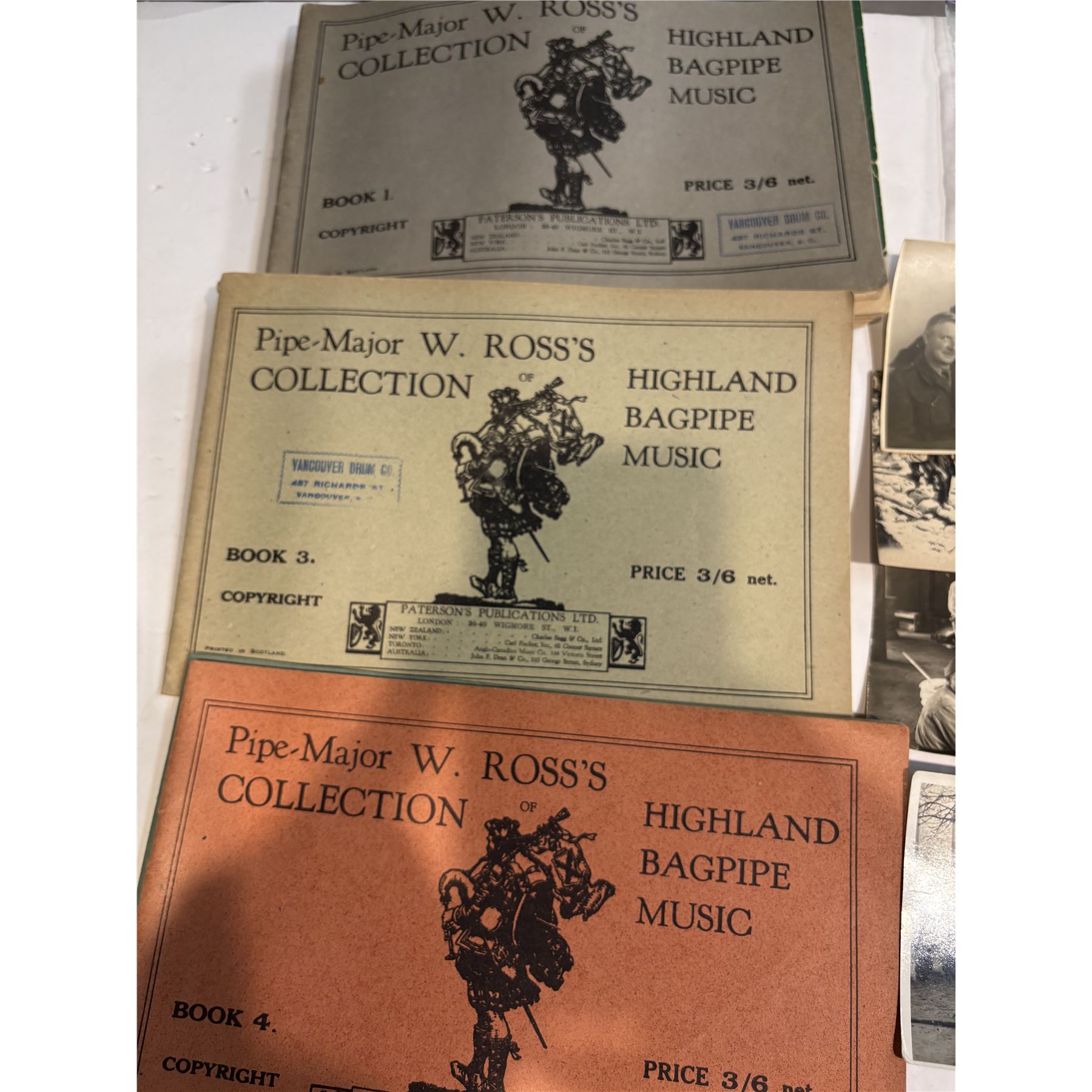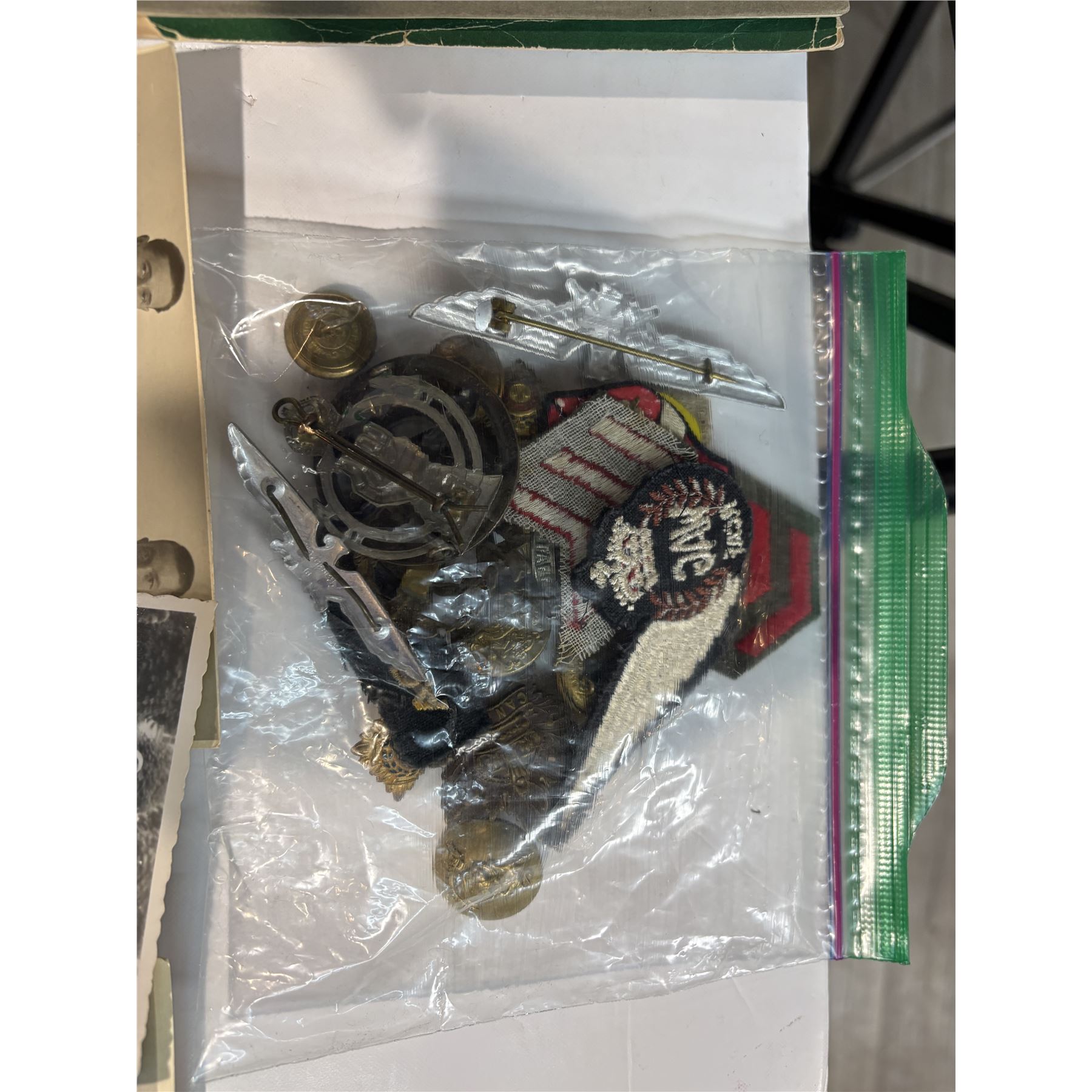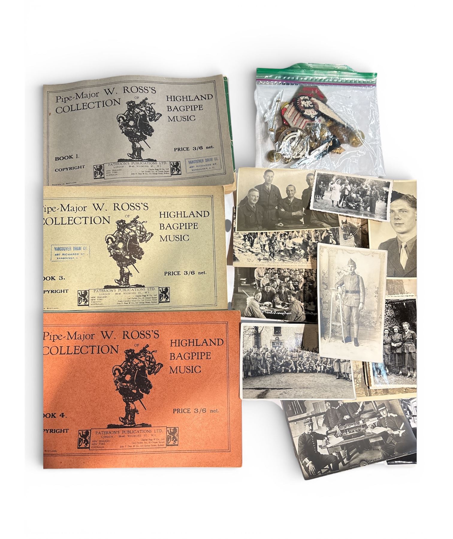 This lot includes a collection of military-related items: military photos, bagpipes sheet music, and assorted pins and badges. Photos depict military themes, bagpipes sheet music features compositions, and pins and badges represent varied military insignias. Items are as pictured.