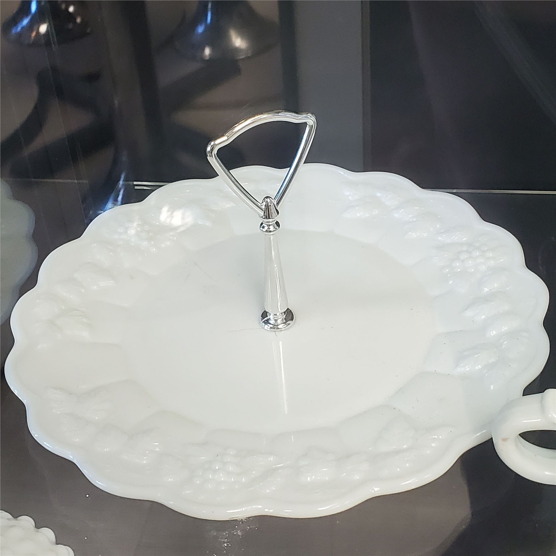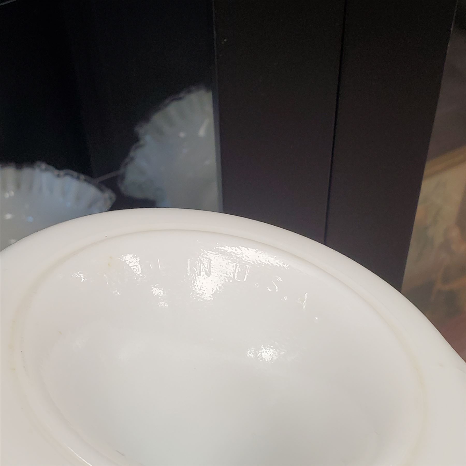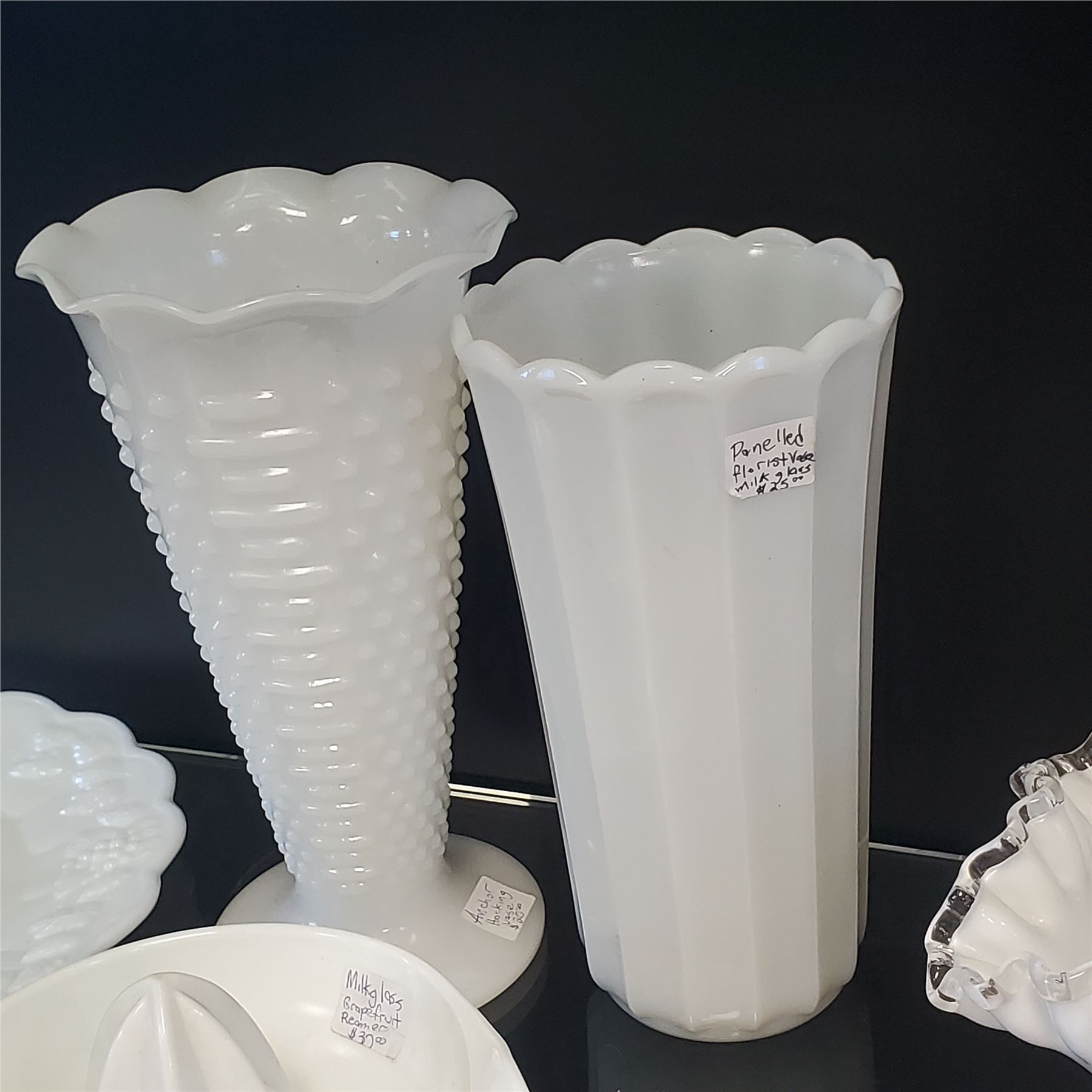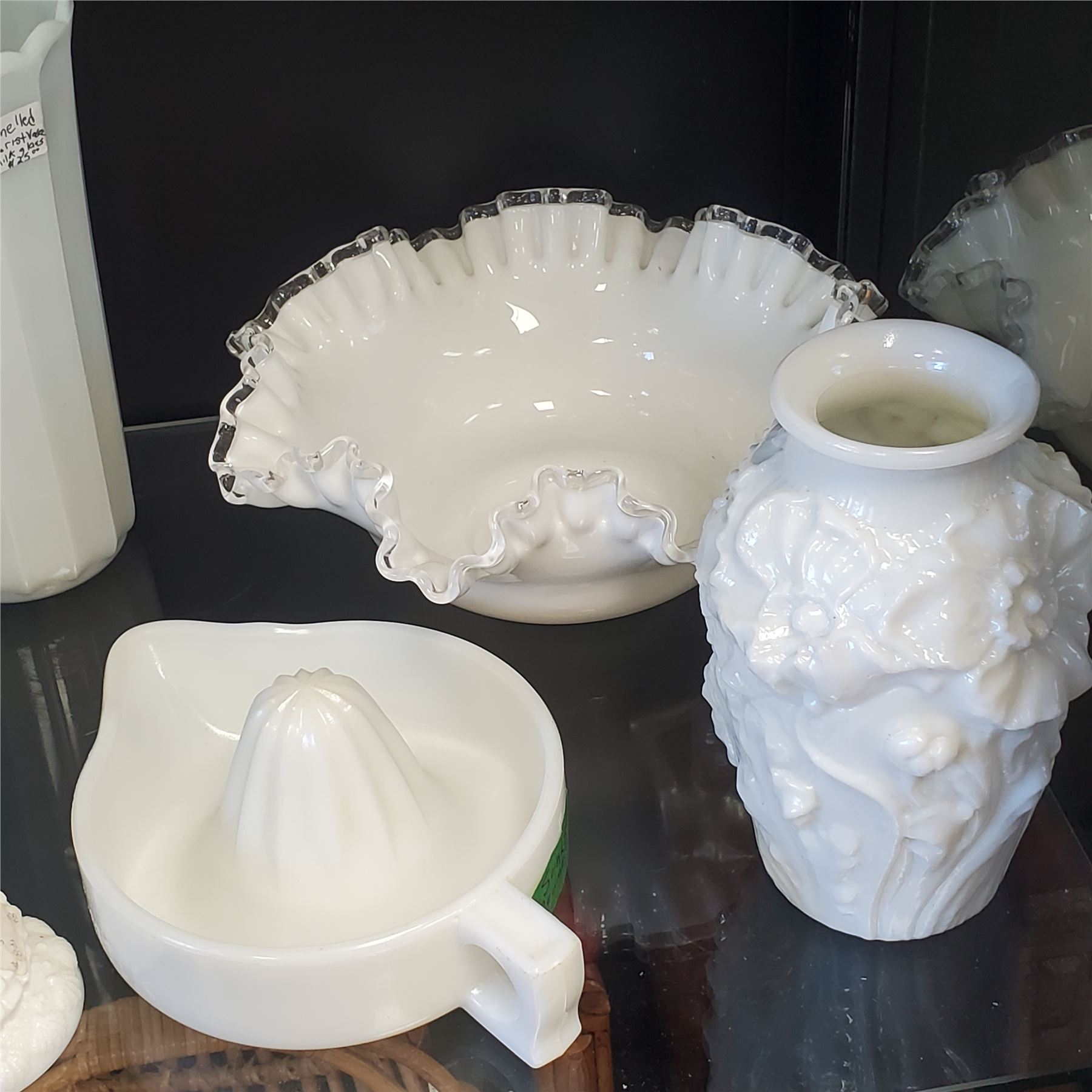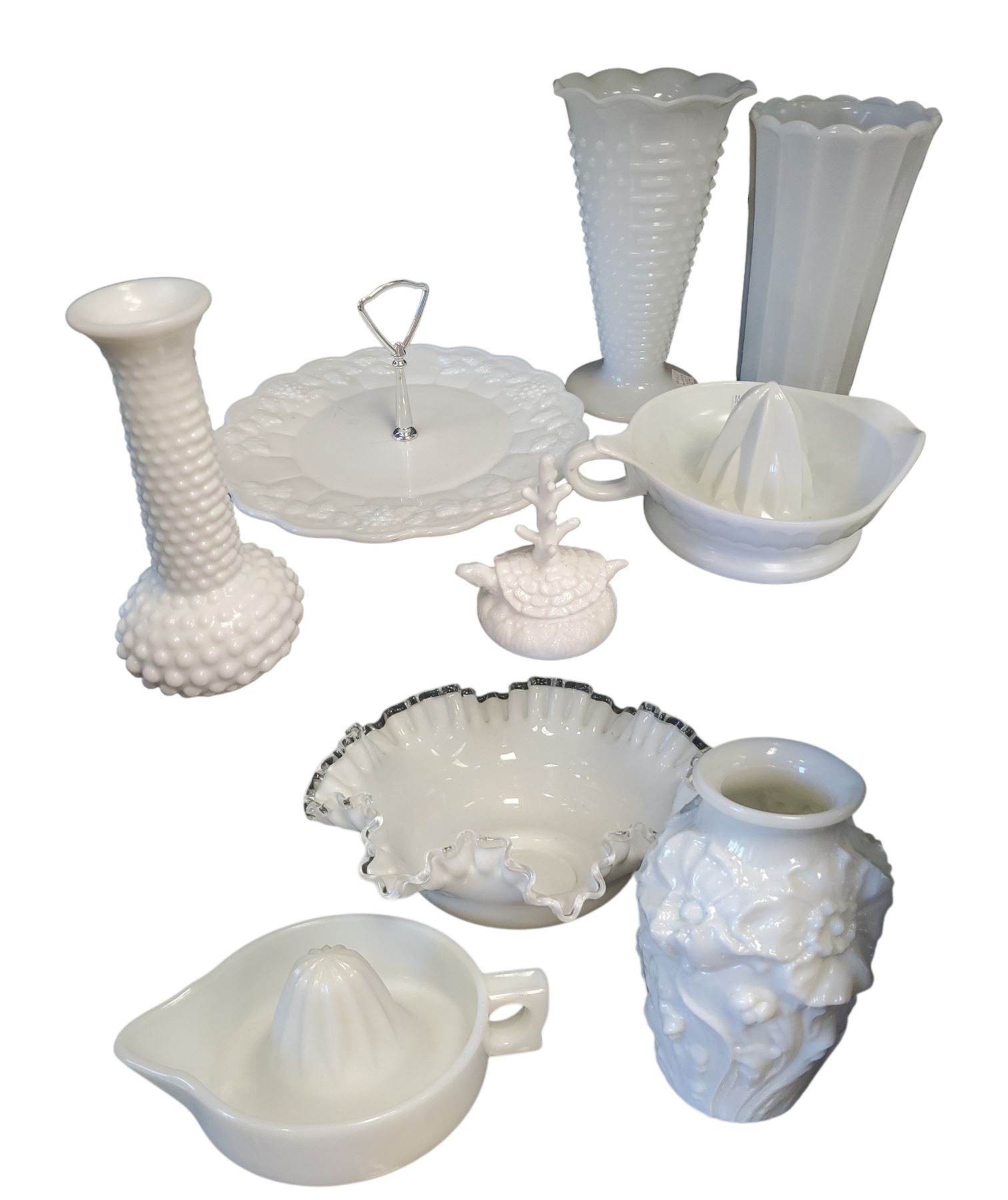 A collection of milk glass items including pieces by Brody, Sunkist, Anchor Hocking, Lancaster, and others. Various designs and patterns characteristic of these makers. Items are as pictured.