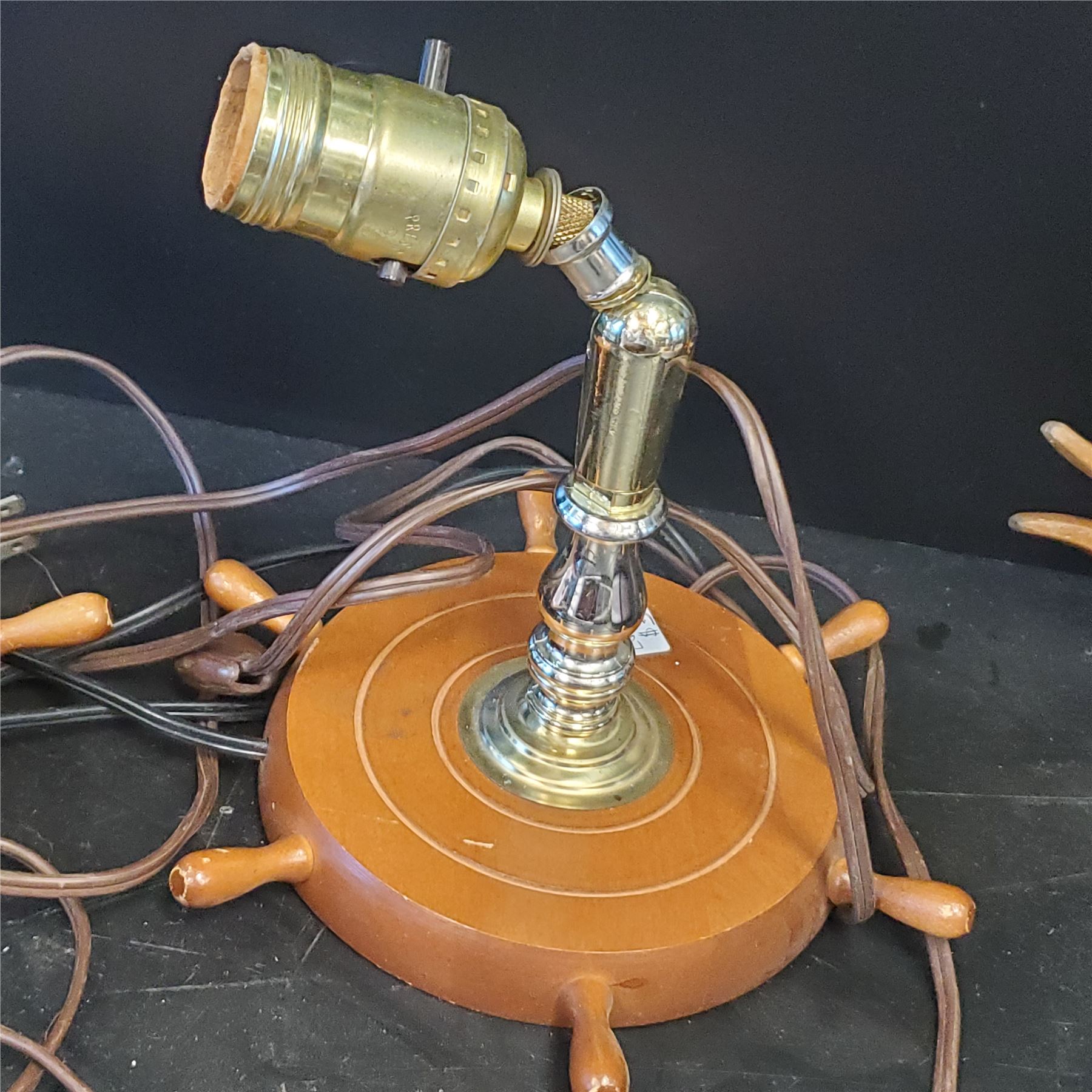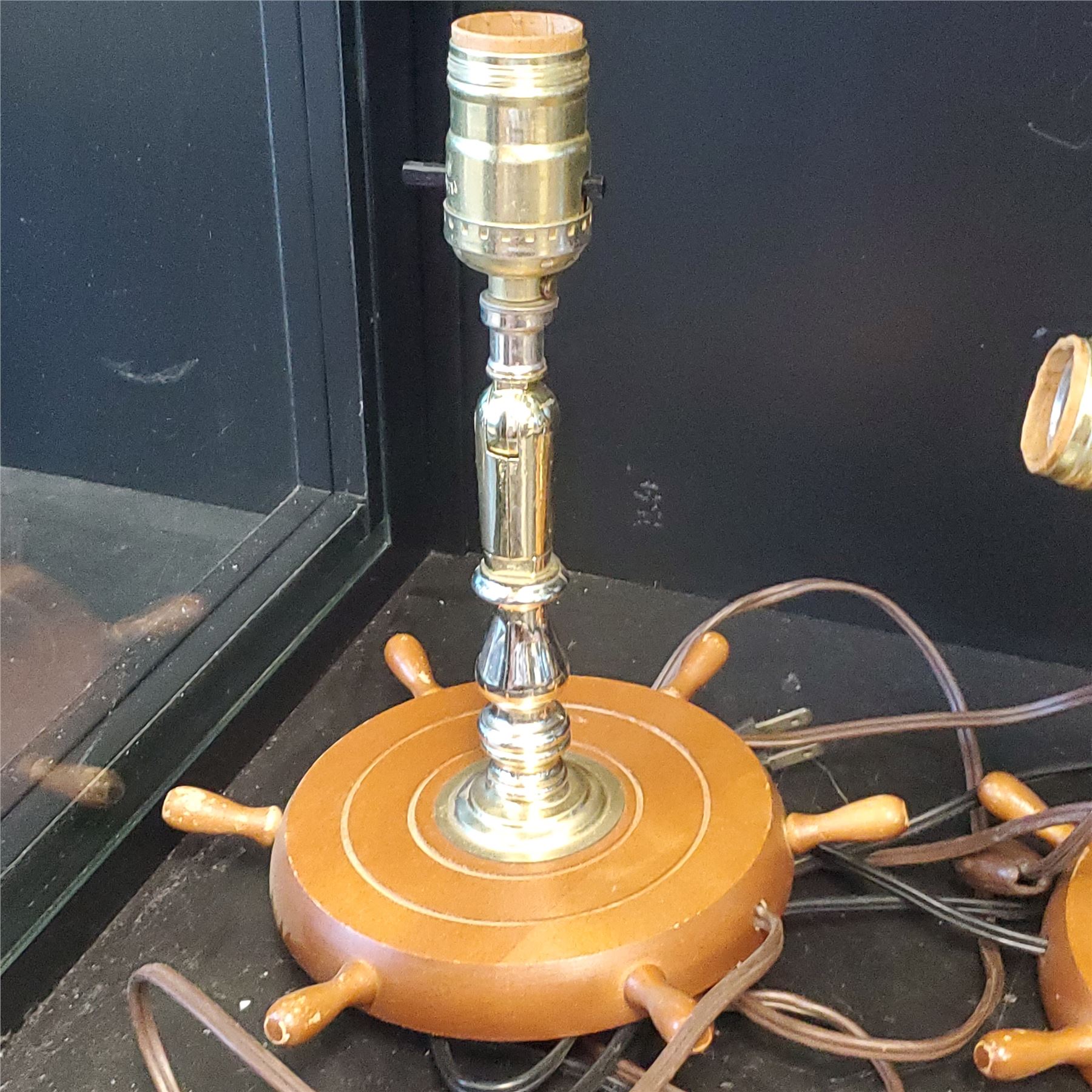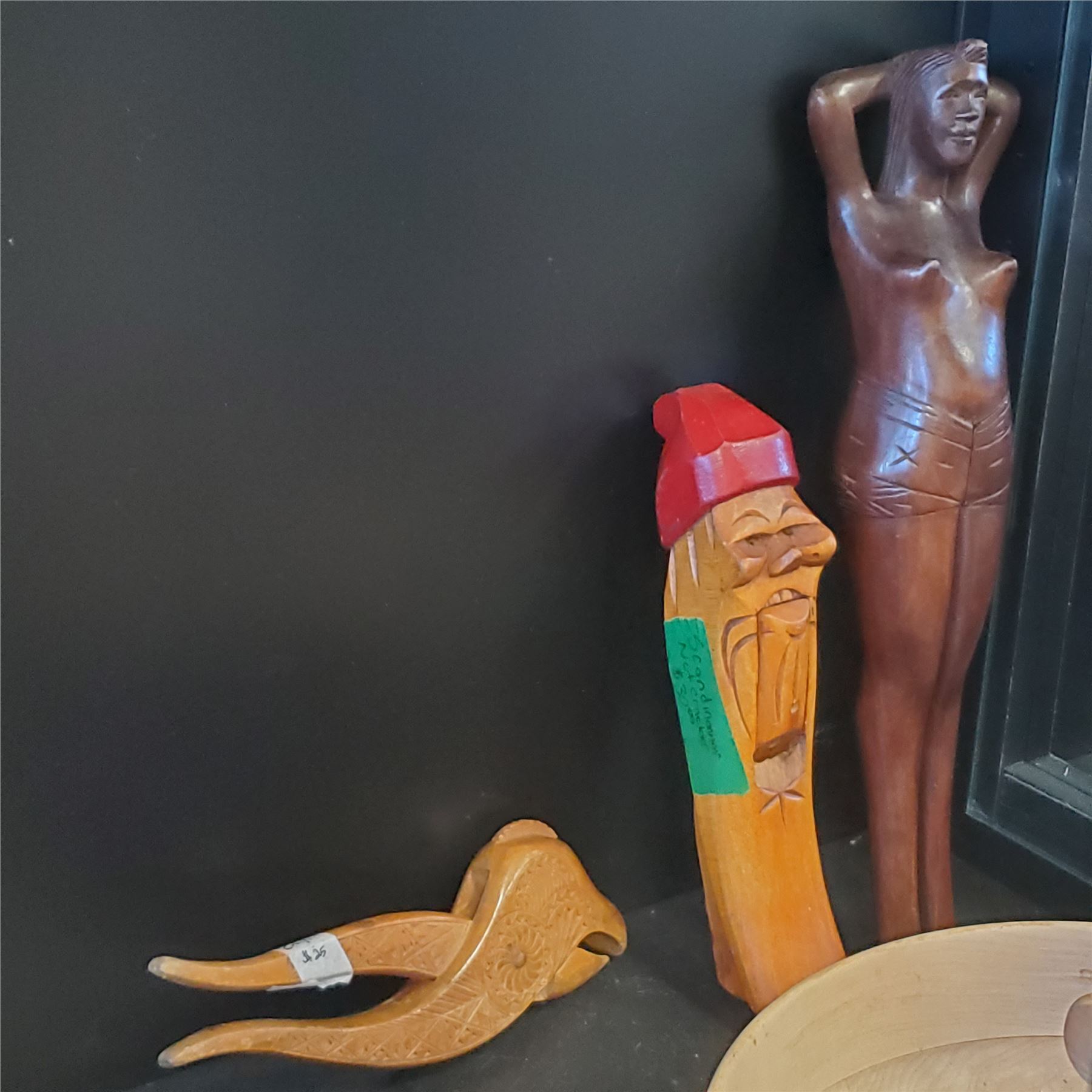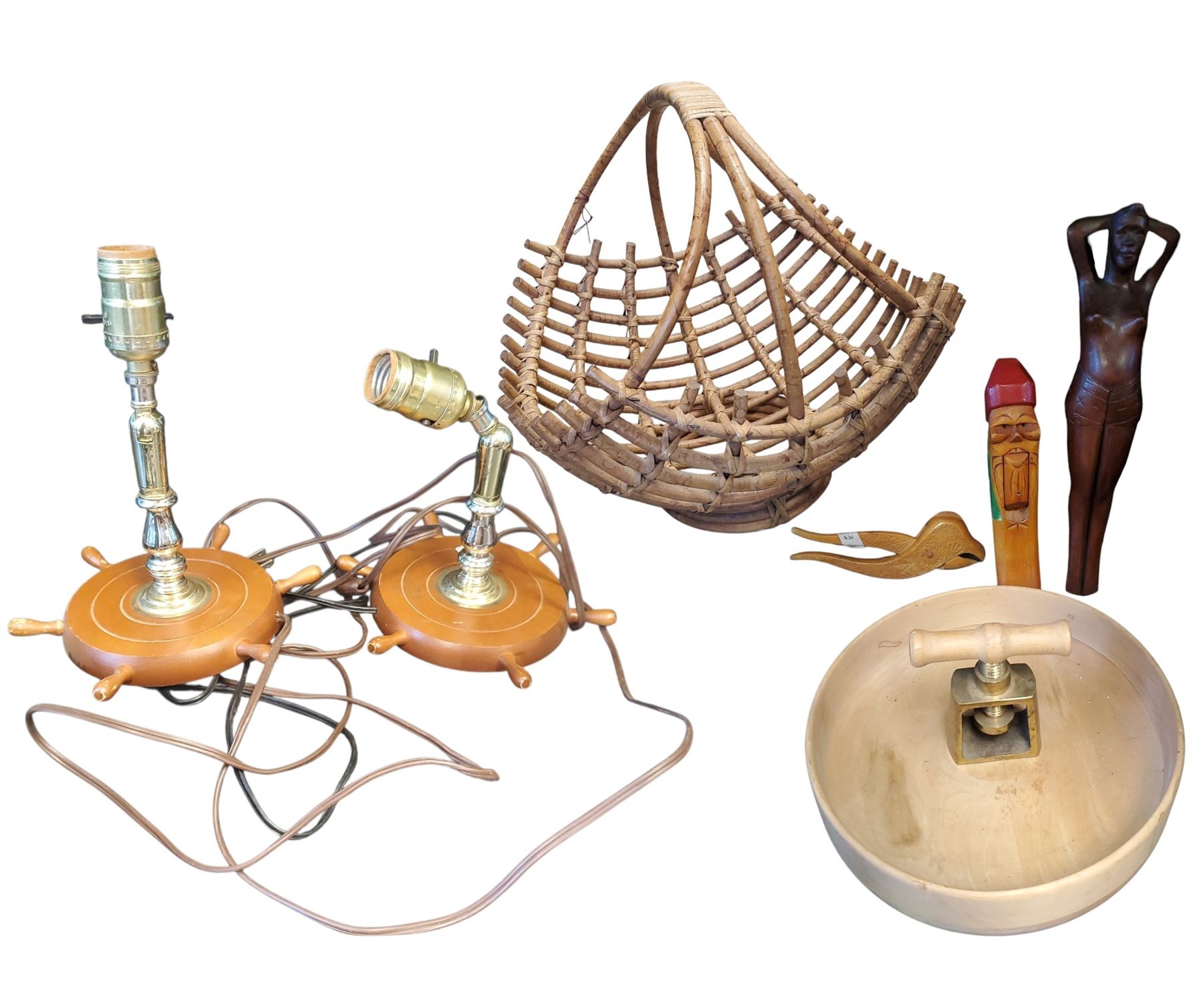 Mixed lot featuring a collection of nutcrackers, two nautical themed lamp bases and a large rattan basket. Lamp bases feature maritime motifs. Items are in assorted sizes and styles. Item is as pictured.
