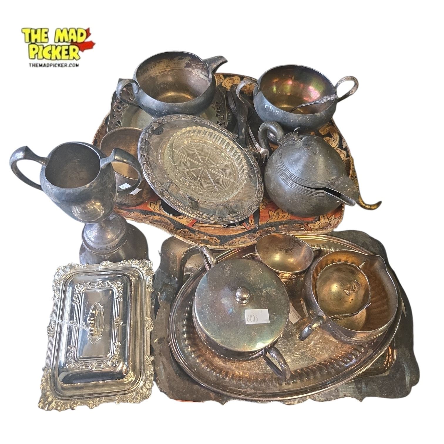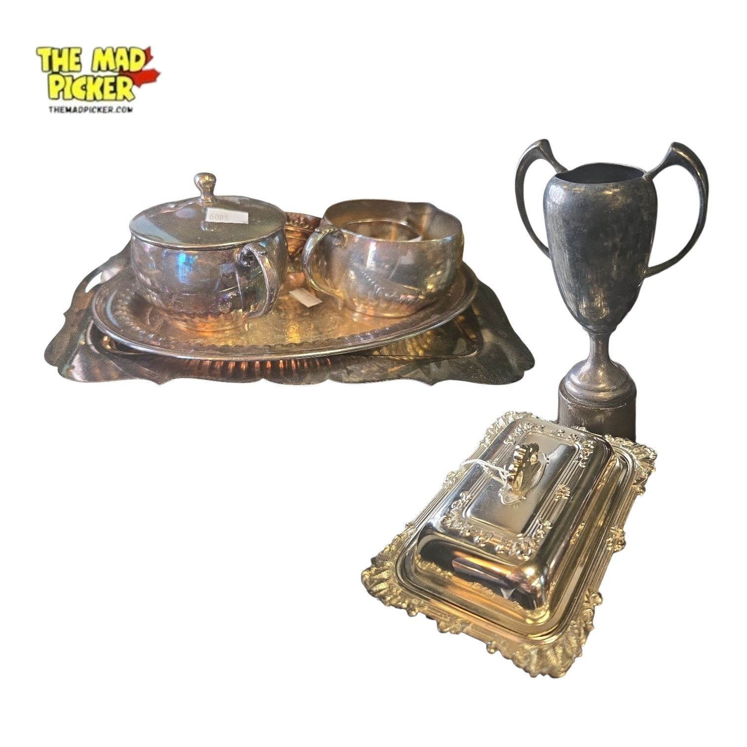 Assorted collection of silverplate collectibles including tableware and decorative items. Features pieces such as trays, teapots, candlesticks, and more. Likely from various makers and eras, showcasing different designs and patterns. Exact origins or manufacturers not specified.