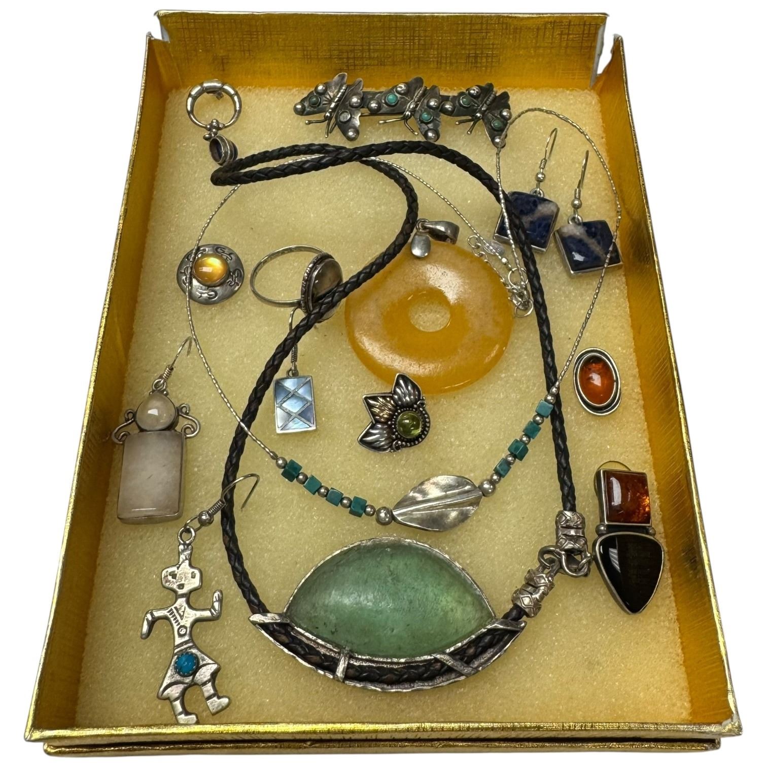 Collection of Single Sterling Earrings, .925 Butterfly Barrette, & 2 Natural Stone Necklaces with .925 Settings (all marked .925)