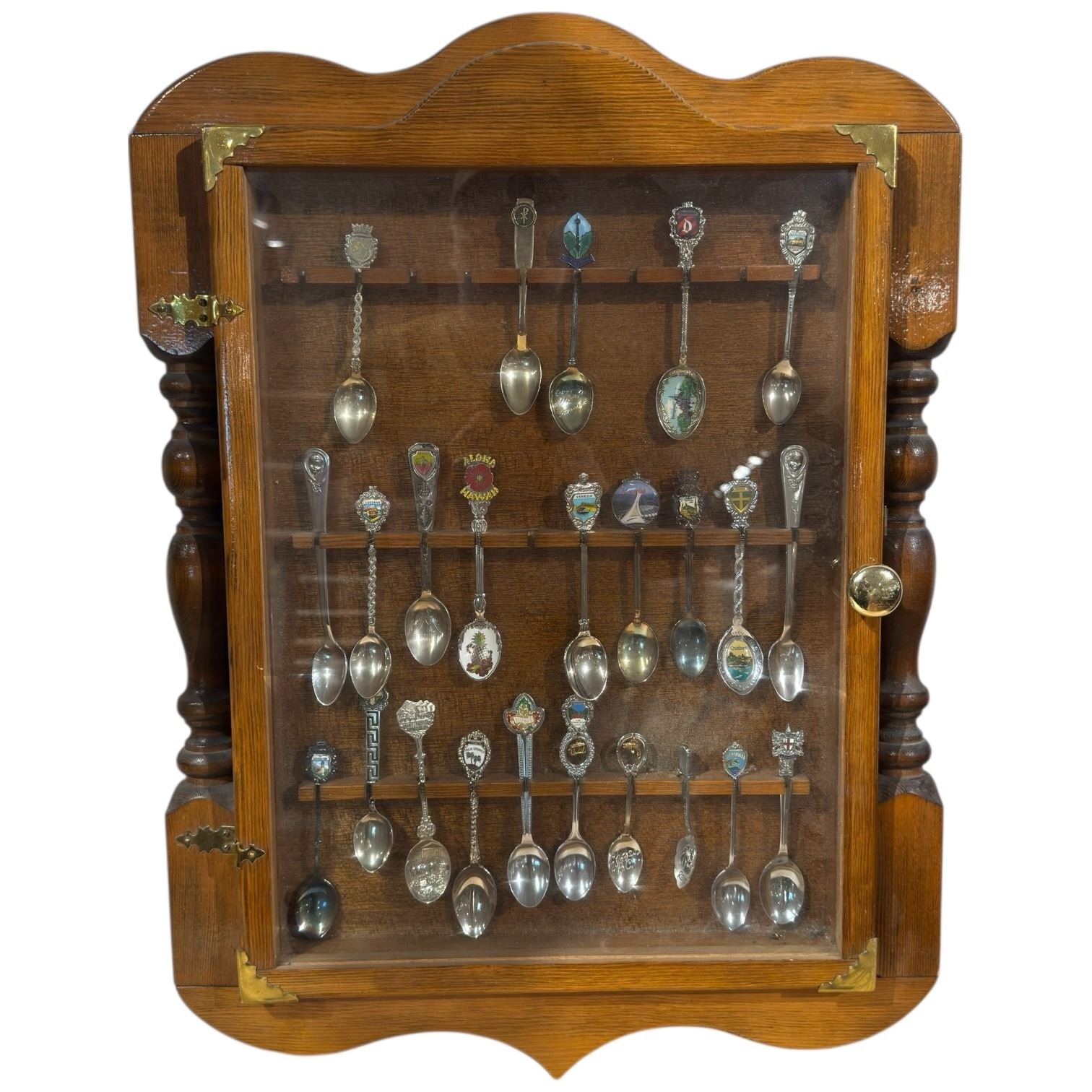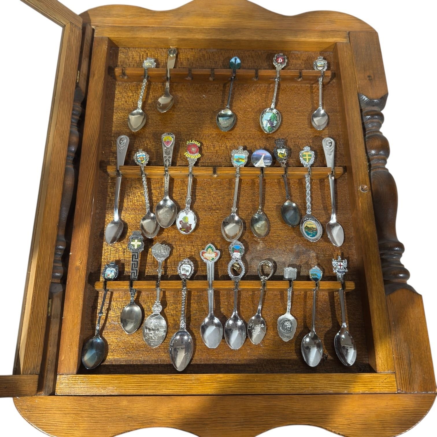 Collection of souvenir spoons with ornate designs housed in a wooden display case. Includes assorted spoons from various locations and themes. Display case provides organized storage and presentation for the spoons. Item is as pictured.