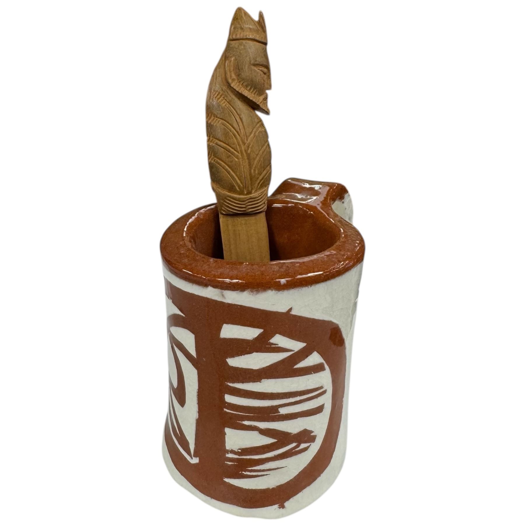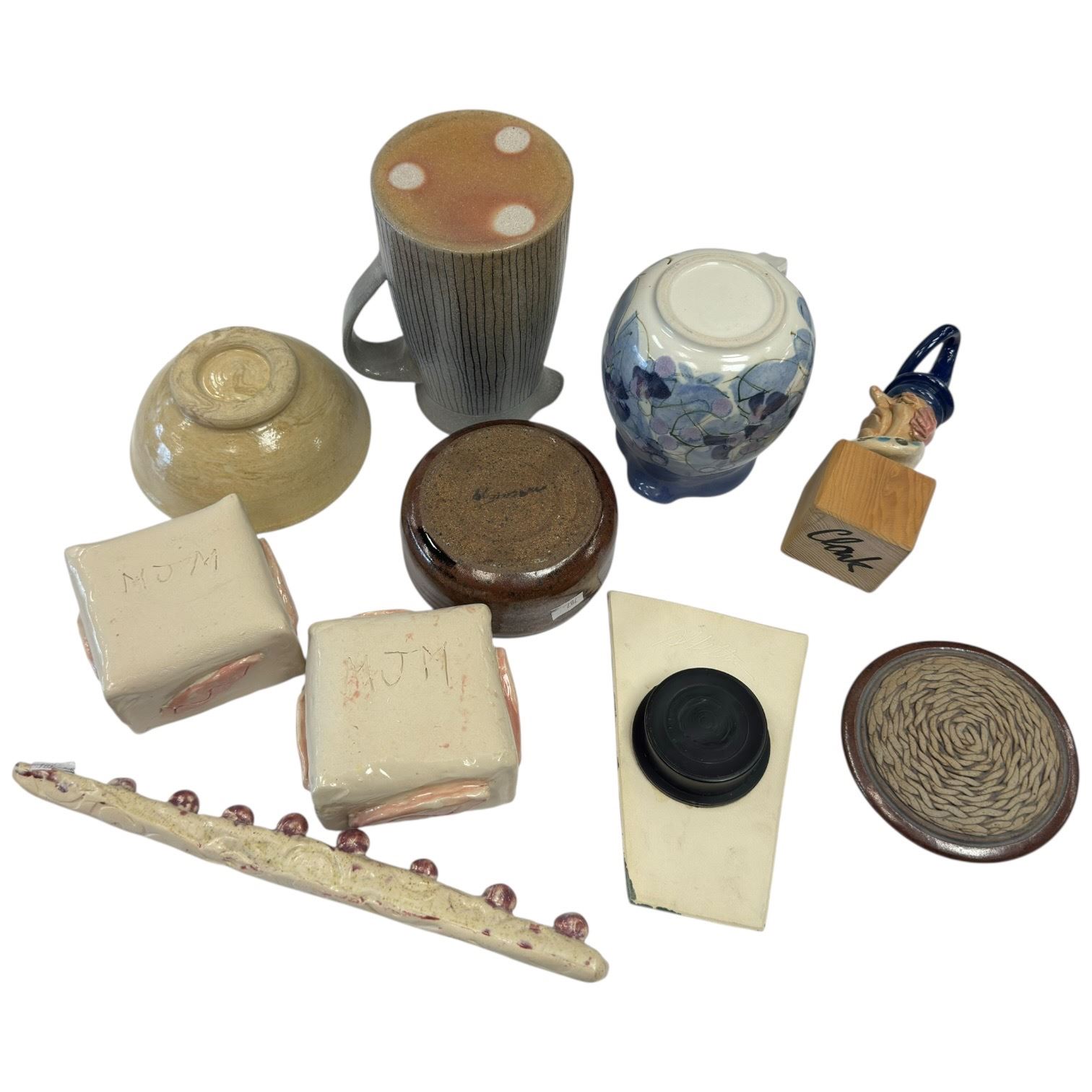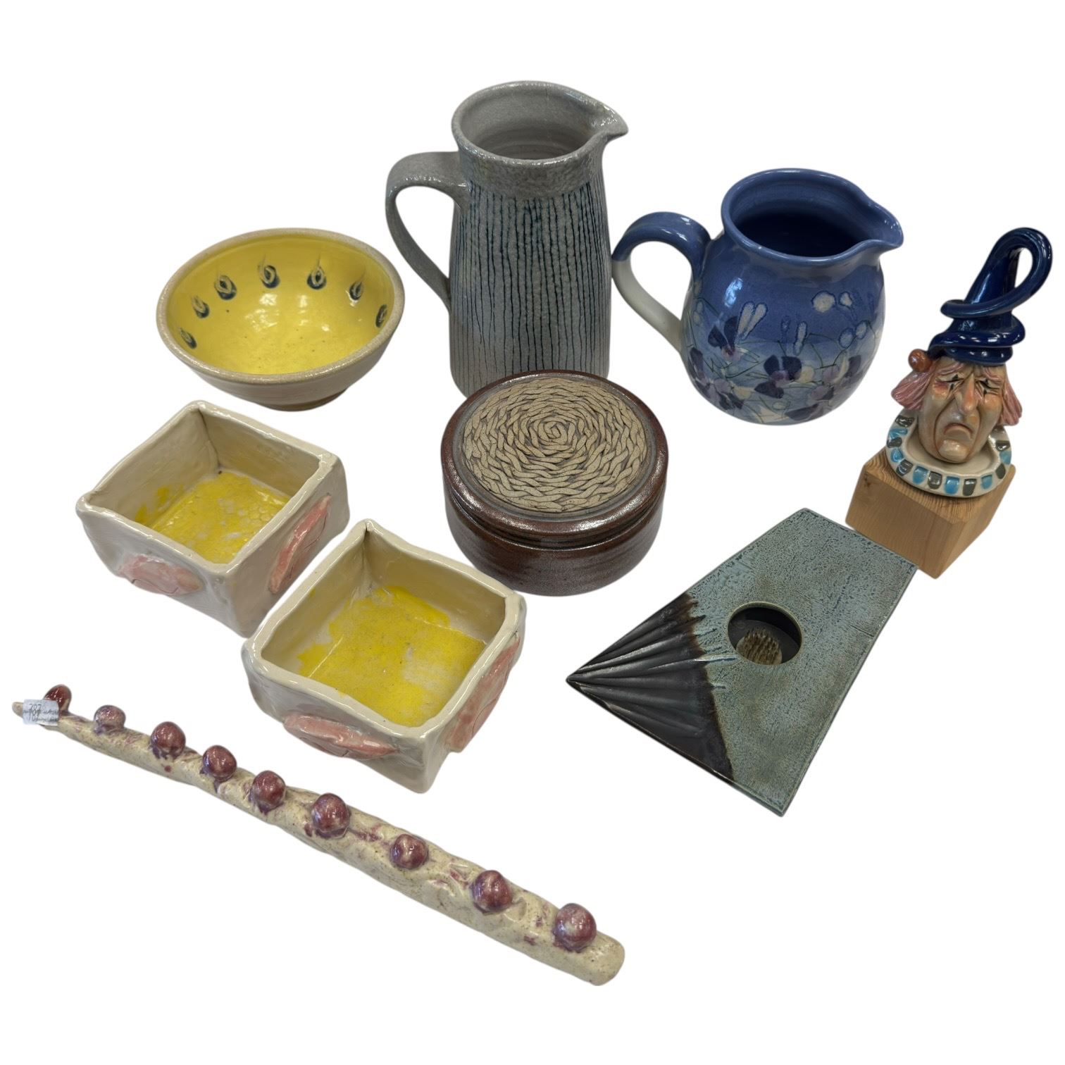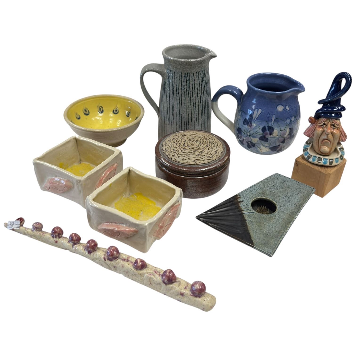 Collection of studio pottery pieces including jugs, bowls, boxes, a clown figurine and a planter. Various shapes and designs across the set, with the tallest piece measuring 7-Inch. Item is as pictured.