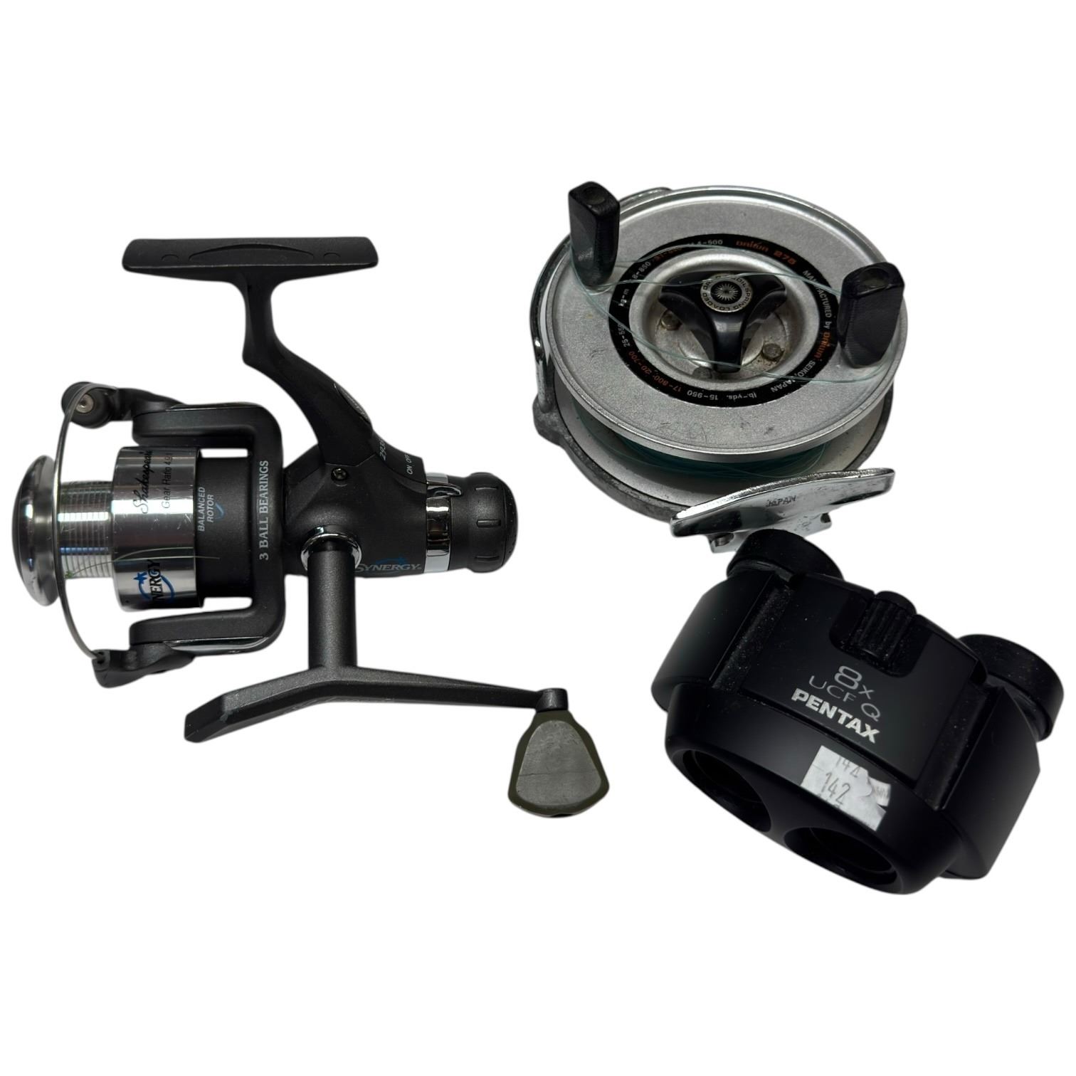 This lot includes two fishing reels - Shakespeare Synergy and Daiwa 275 - alongside Pentax UFC Q binoculars. Item is as pictured.