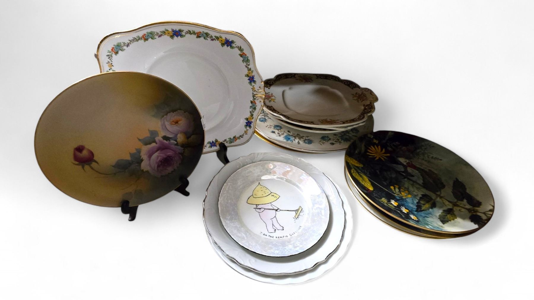 Collection includes various chinaware and collectible plates from brands such as Arabia, Noritake, Royal Winton, Tuscan, and others. Features diverse designs and patterns. Includes items made by renowned ceramics manufacturers. Item is as pictured.
