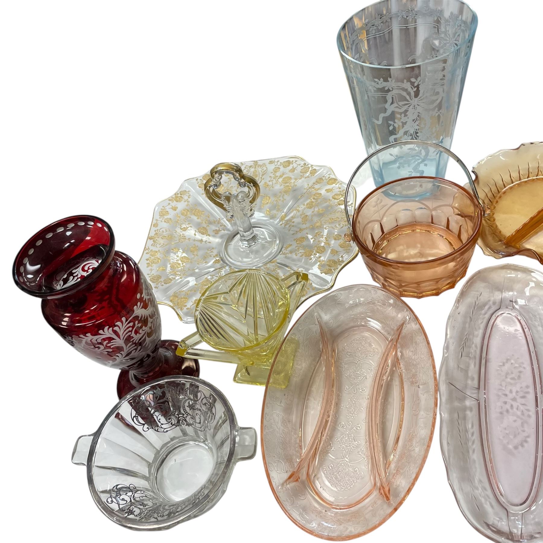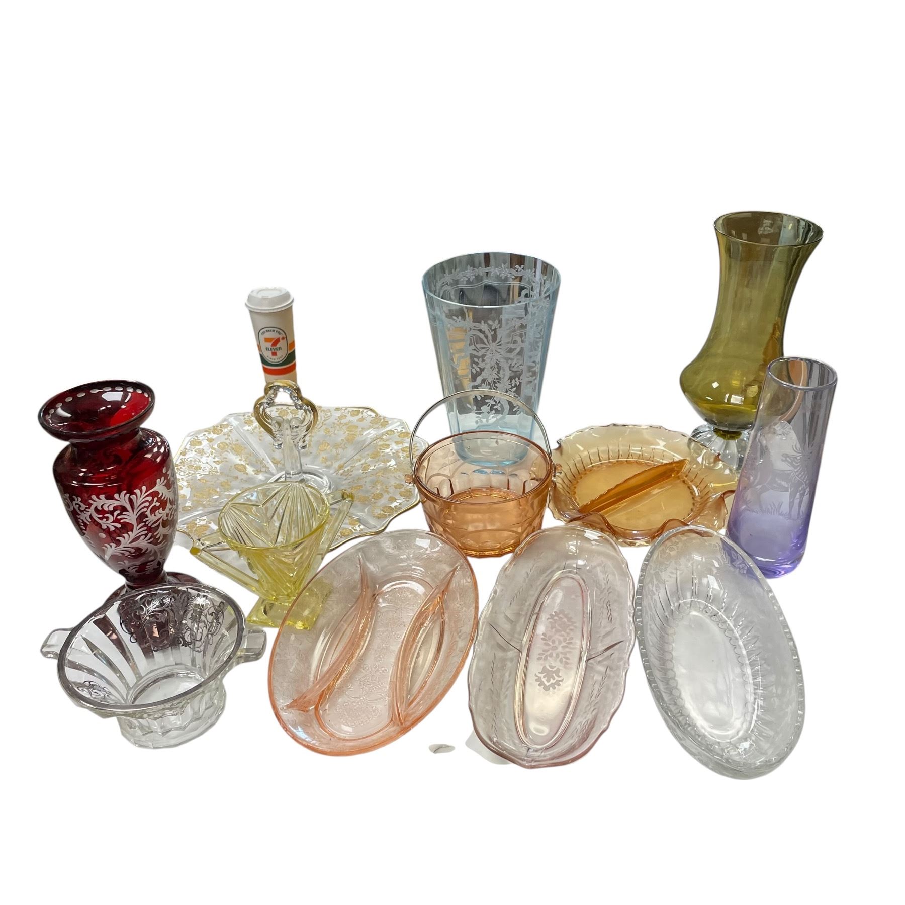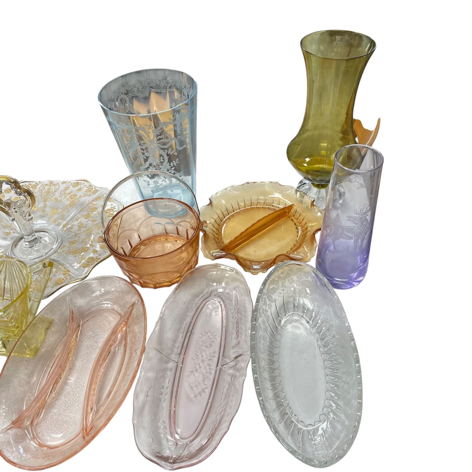 Mixed collection of decorative glass items including vases, depression glass pieces, and other assorted glassware. Items vary in design, style, and color. Includes a range of glass types for display or use. Item is as pictured.