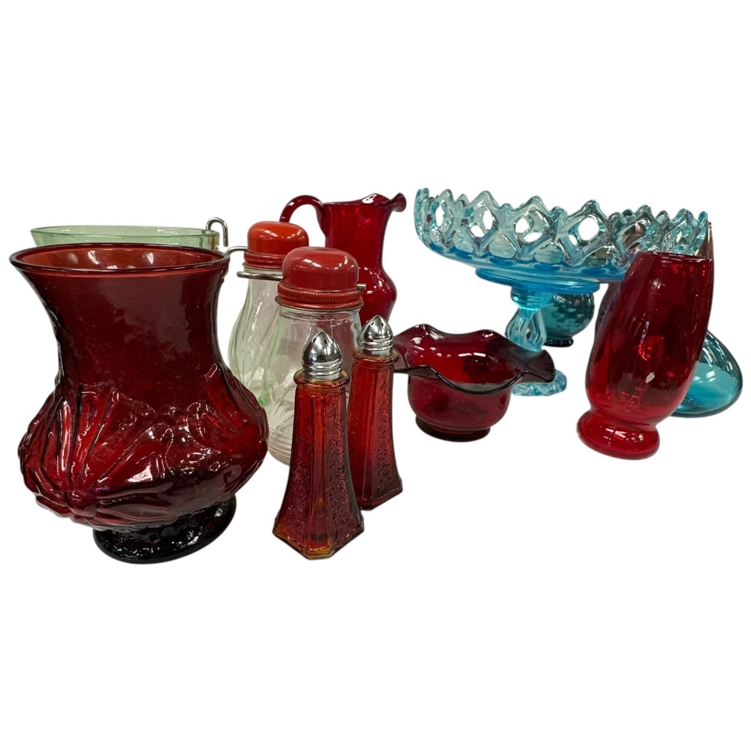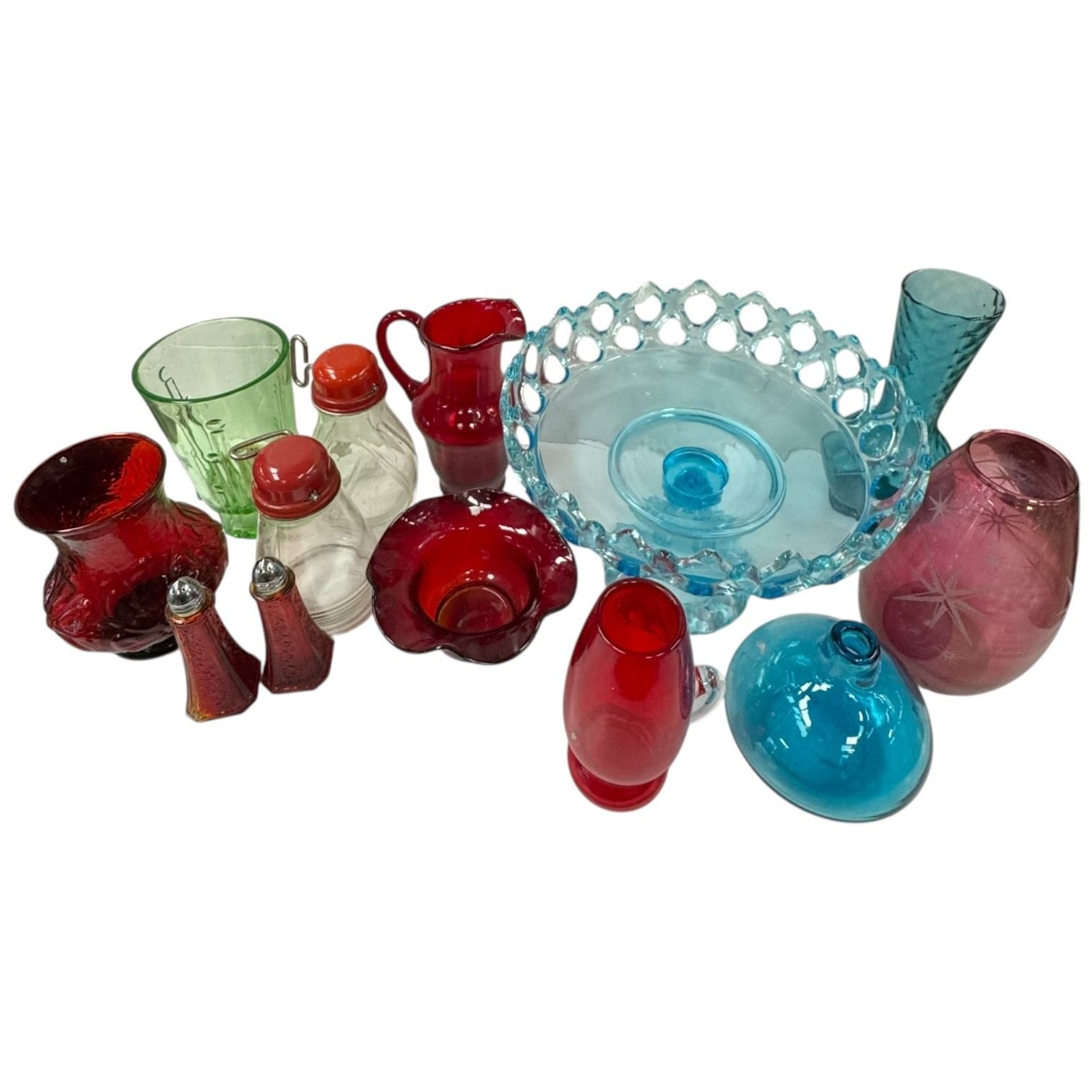 A collection of mid-century vintage coloured glass pieces. Includes various forms and designs typical of artistry from the era.