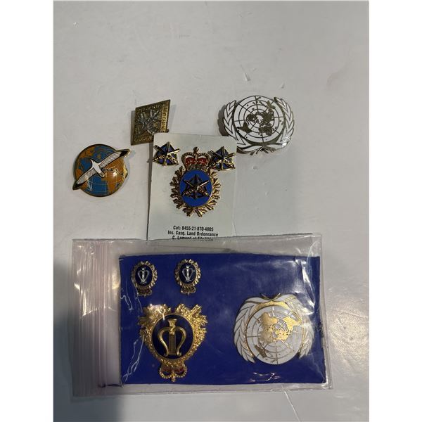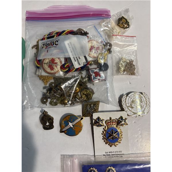 Assorted collection of military pins and patches representing various branches and units. Includes items with embroidered designs and metal badges, as pictured. Specific details about origins or era not provided. Item is as pictured.