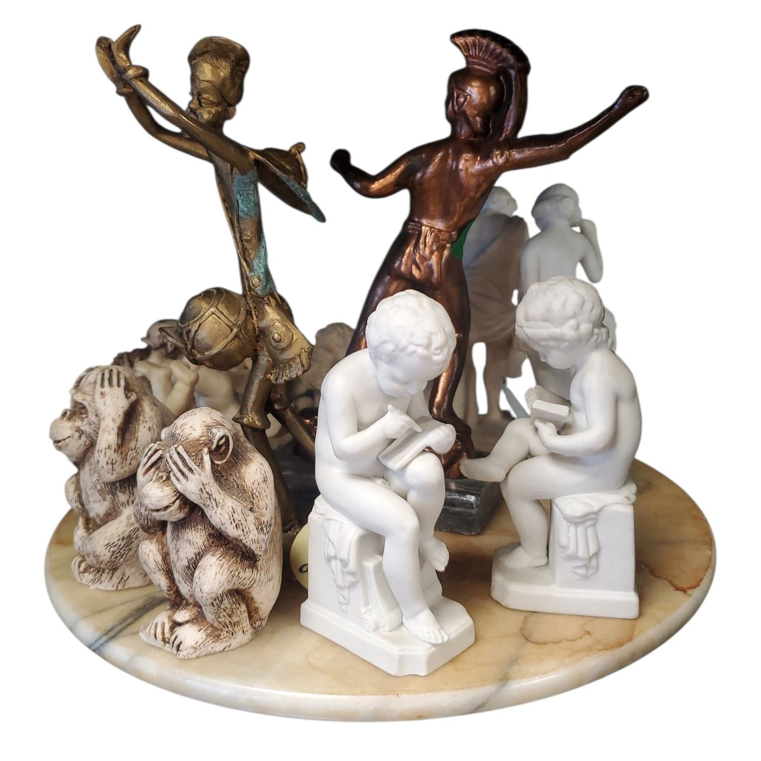 Collection includes various small sculptures made of ceramic, brass, bronze, and resin, along with a marble lazy Susan tray. Items showcase diverse materials and forms. The marble tray features a rotating design. All items are as pictured. Tallest piece is 9" tall.