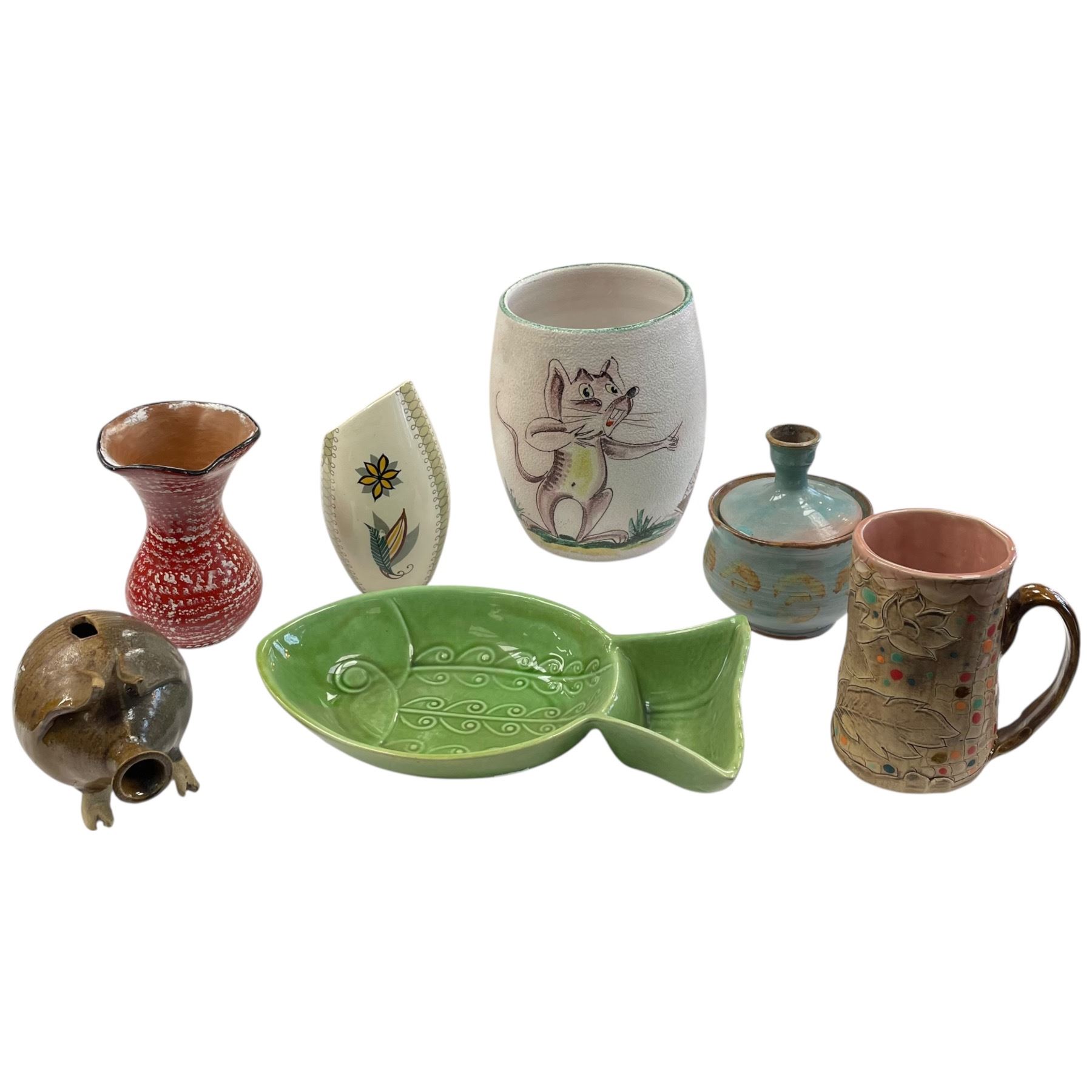 Collection includes assorted studio and commercial pottery pieces of unspecified makers and designs. Includes vases and potentially other pottery forms. Tallest vase measures 8-Inch in height. Variety of shapes as pictured. Item is as pictured.