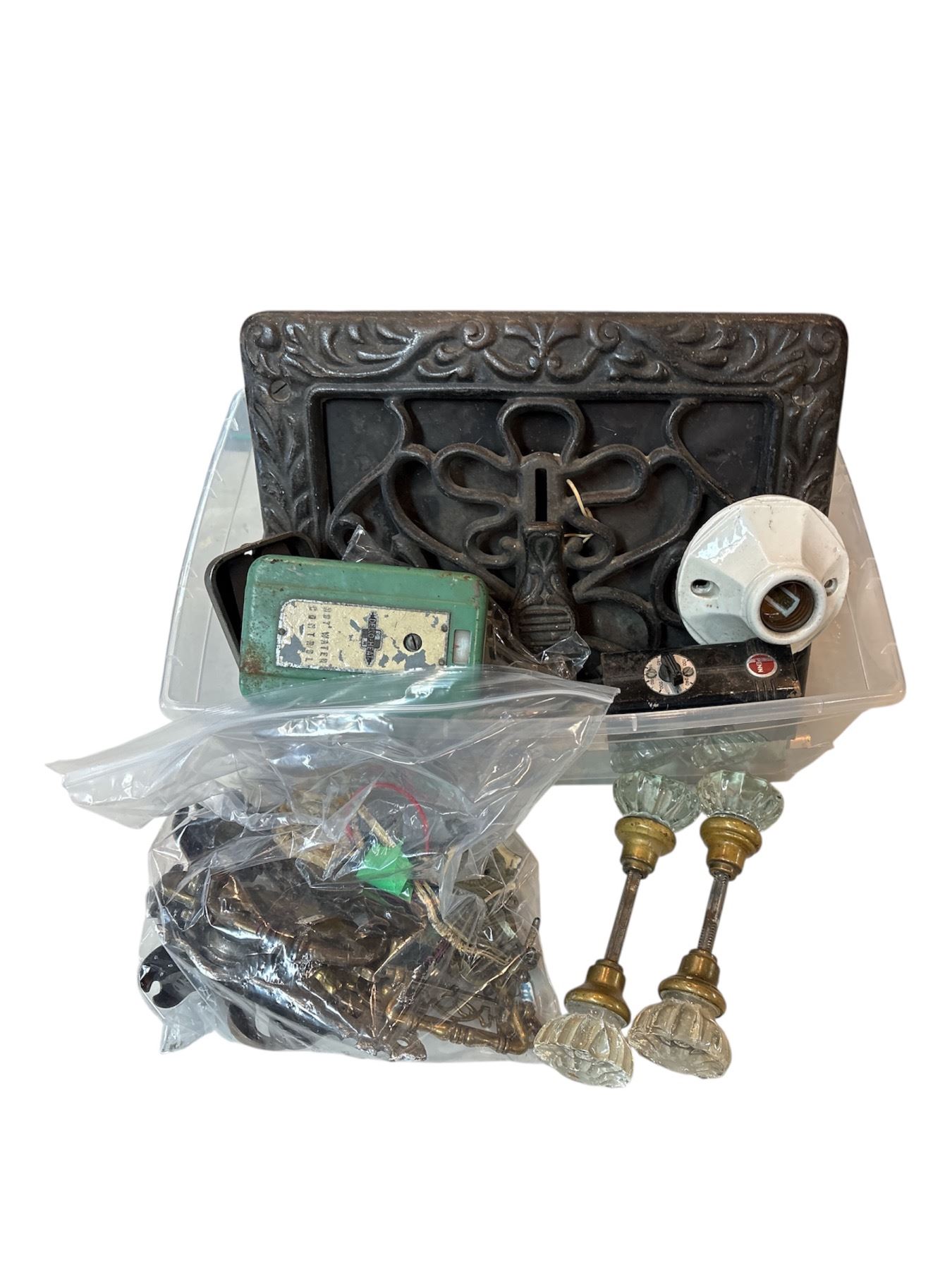 This collection includes various vintage and antique home improvement hardware such as pulls, door handles, a cast iron vent, switch covers, and additional items. Items showcase diverse materials and styles, reflecting historic craftsmanship. All pieces are as pictured.