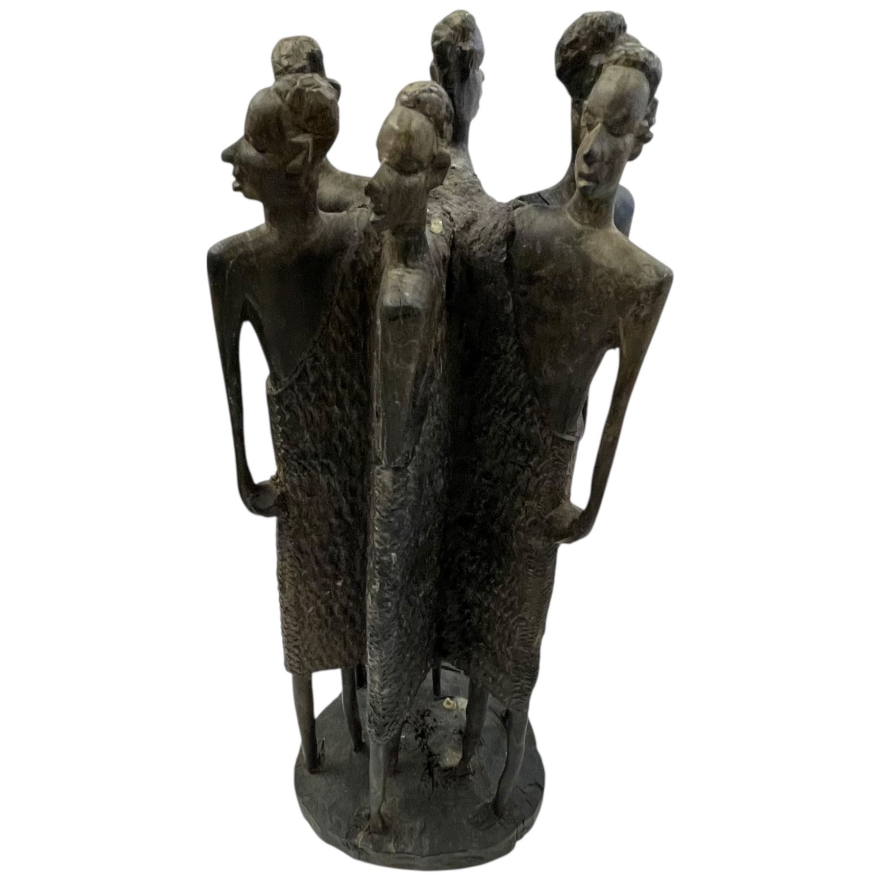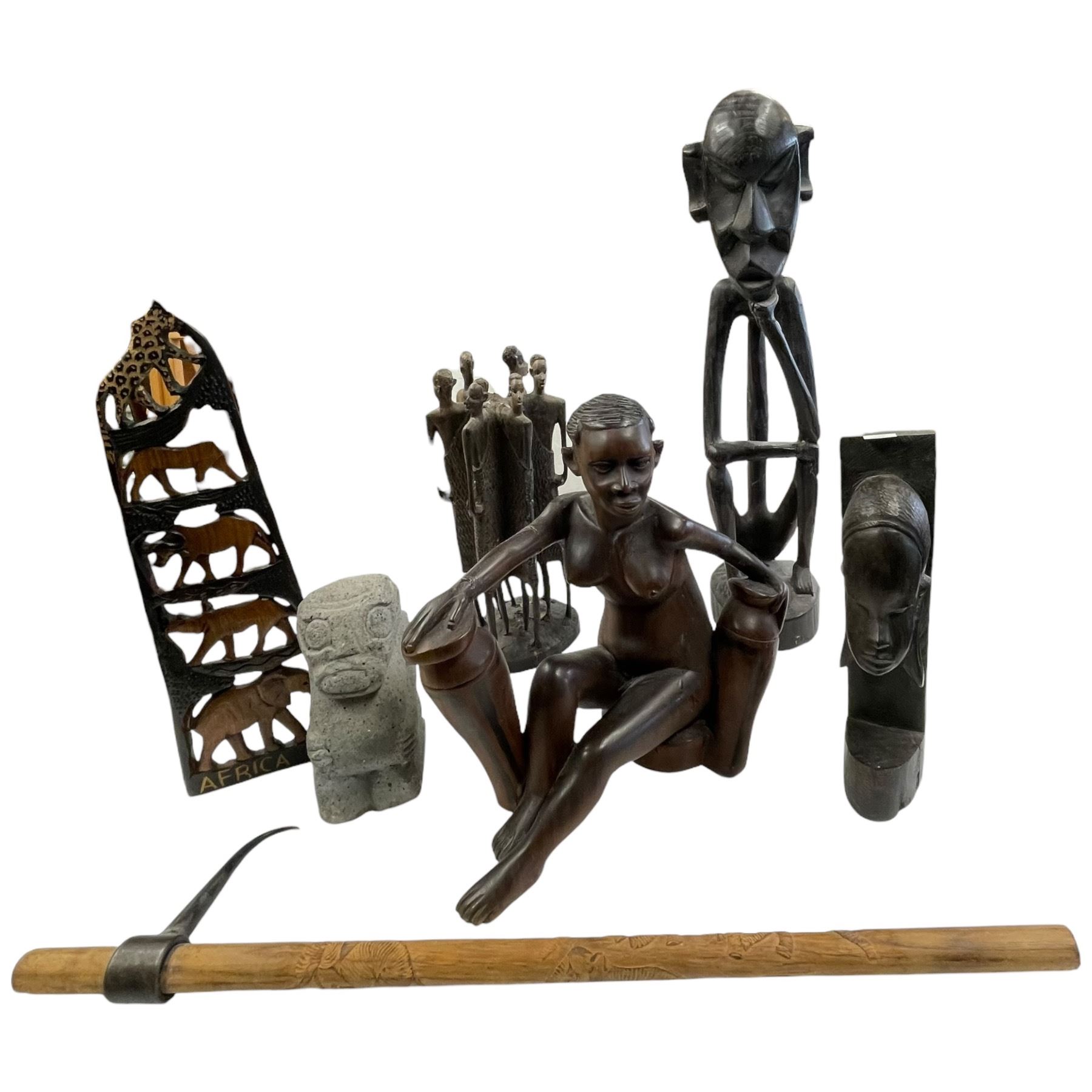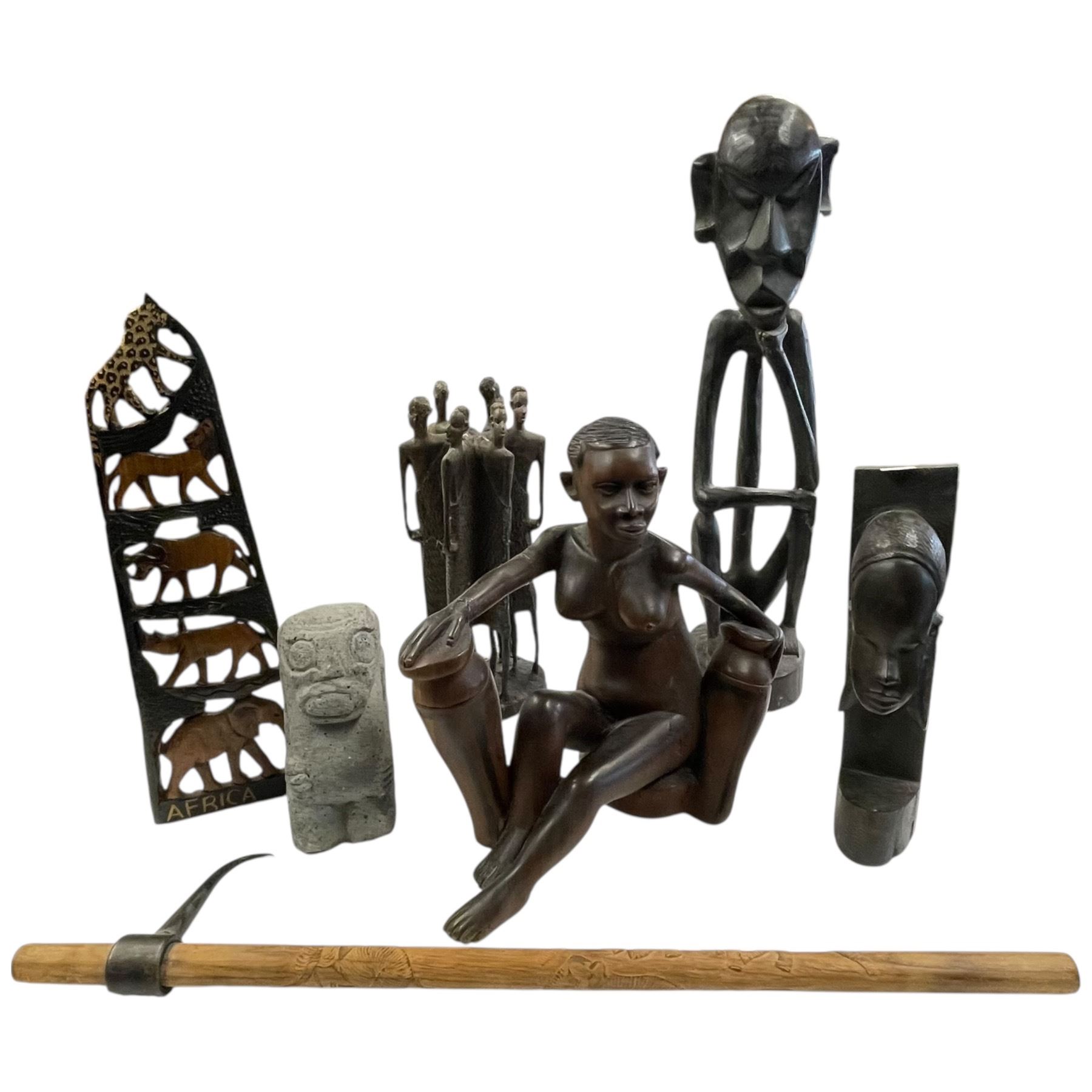 Collection of vintage African carved wood art includes several tribal figures, a 'Tree of Life' style sculpture, a seated figure with a large head, a vertical panel featuring animal motifs, and a carved staff. Some pieces are Tanzanian Makonde carvings made of various wood, reflecting East African tribal art traditions and folklore.