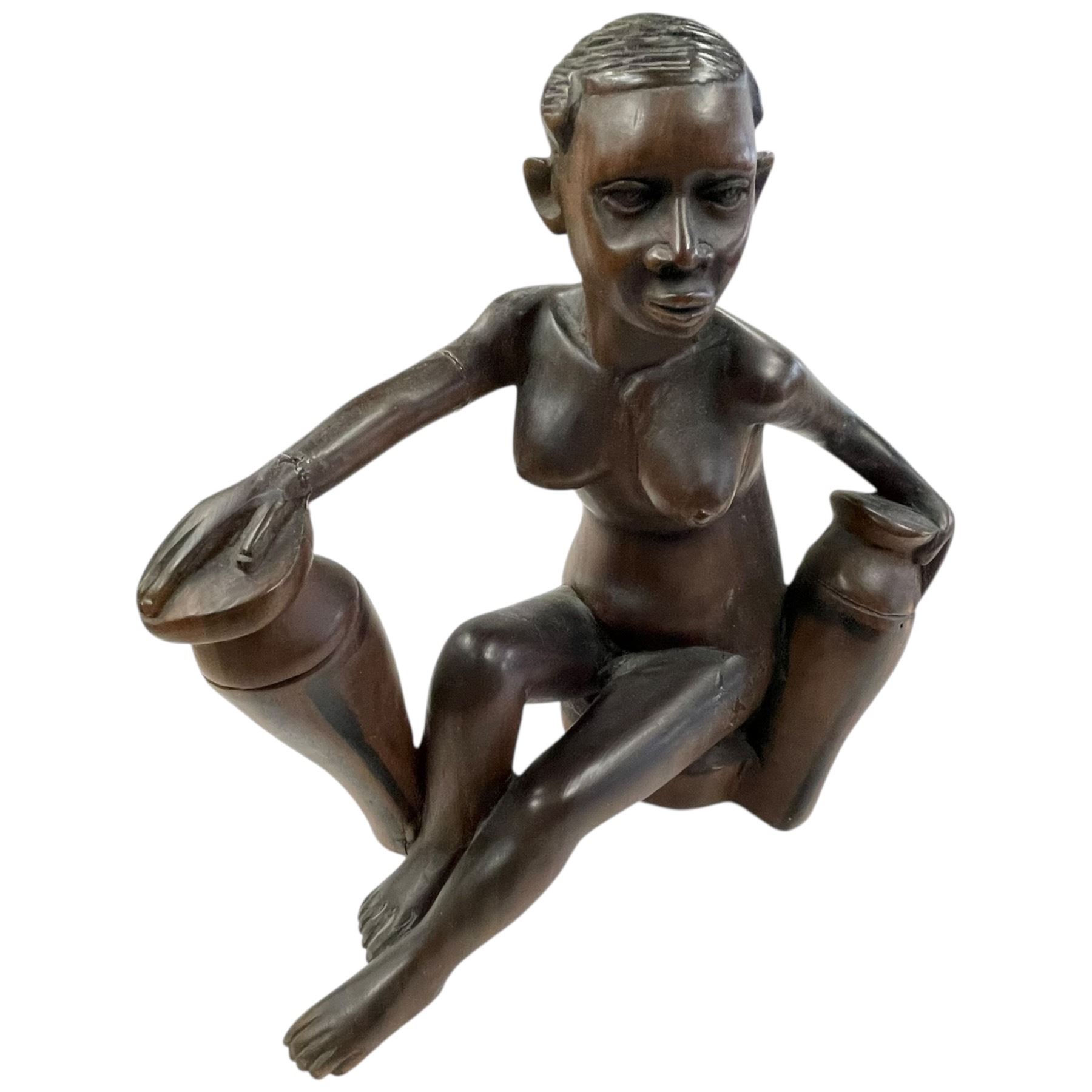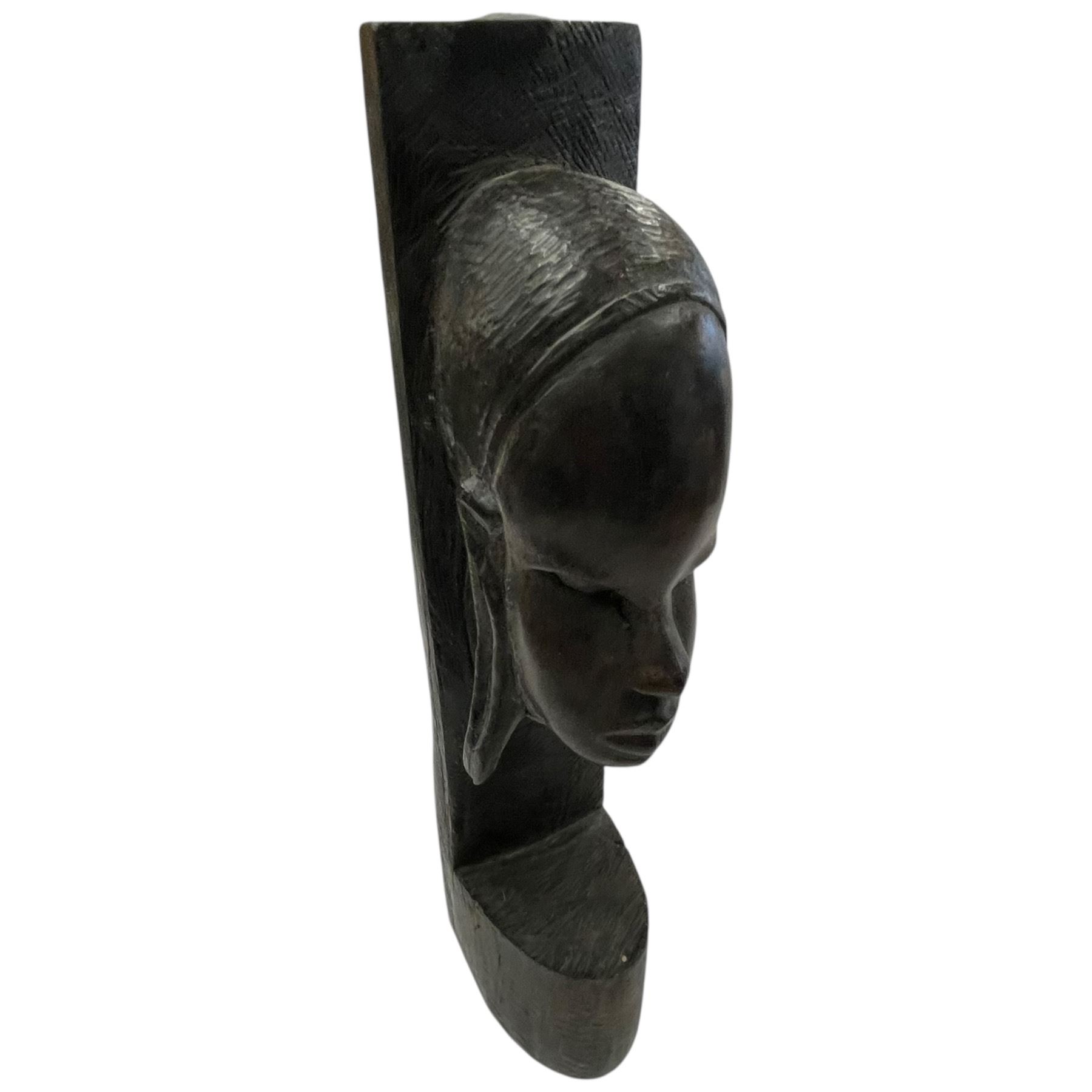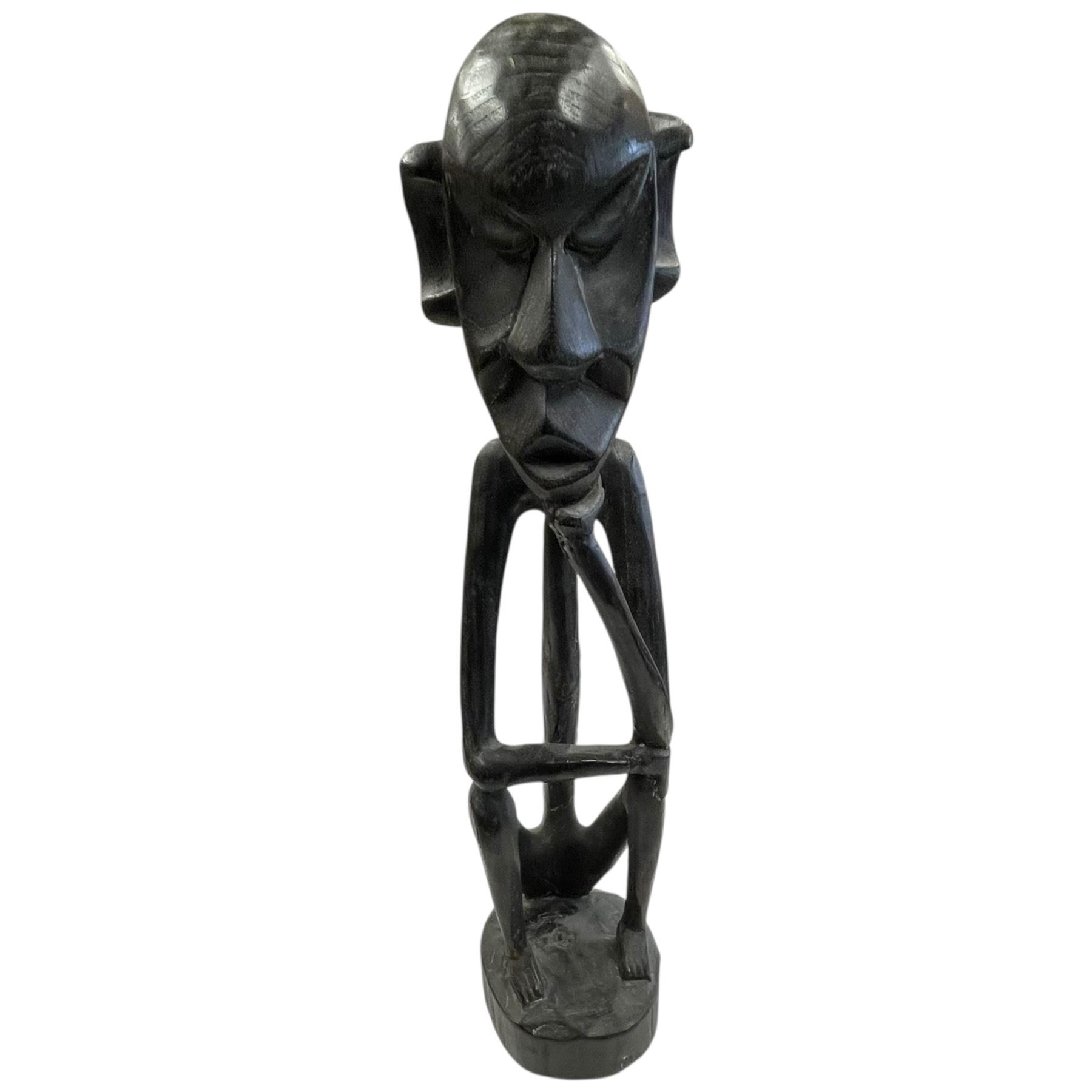 Collection of vintage African carved wood art includes several tribal figures, a 'Tree of Life' style sculpture, a seated figure with a large head, a vertical panel featuring animal motifs, and a carved staff. Some pieces are Tanzanian Makonde carvings made of various wood, reflecting East African tribal art traditions and folklore.
