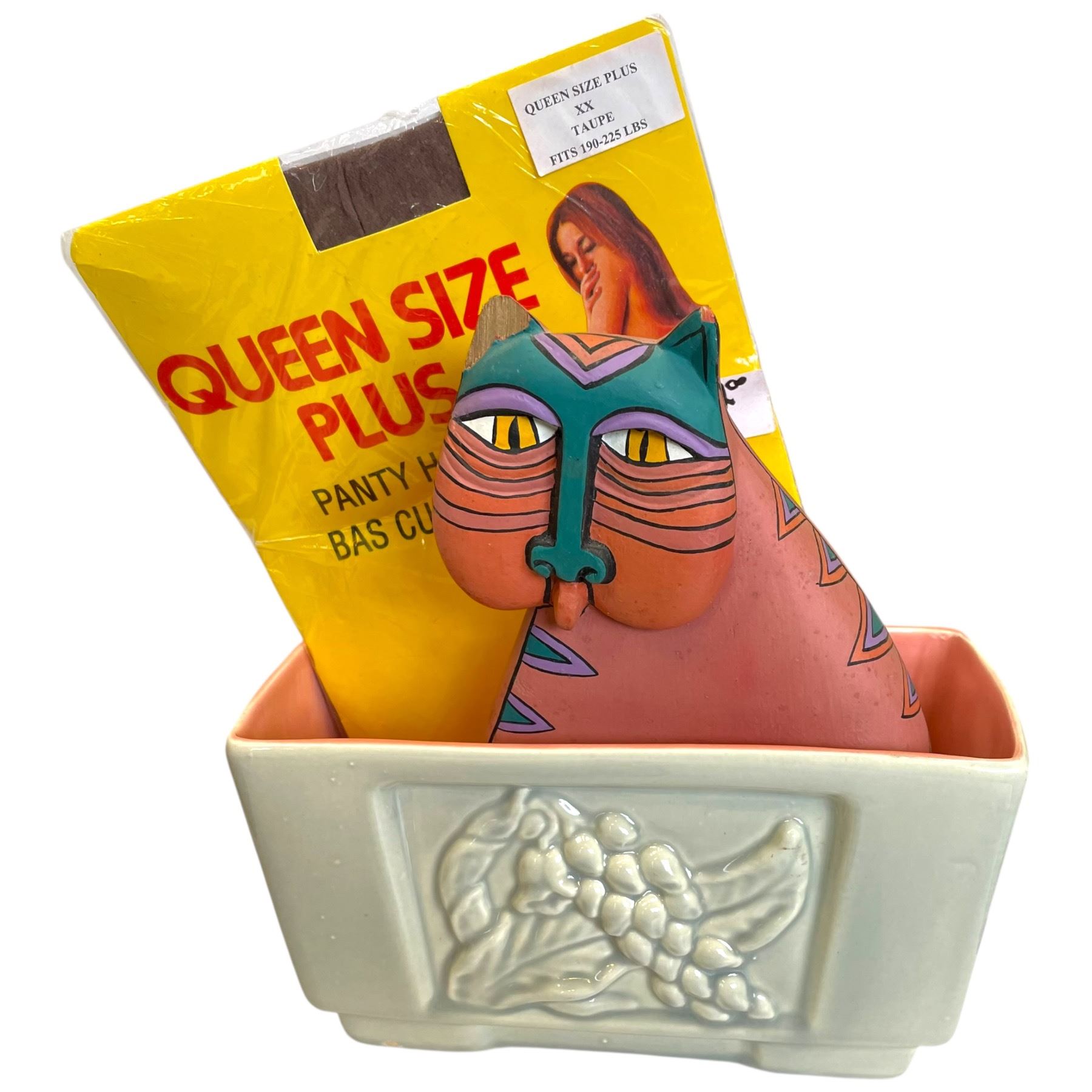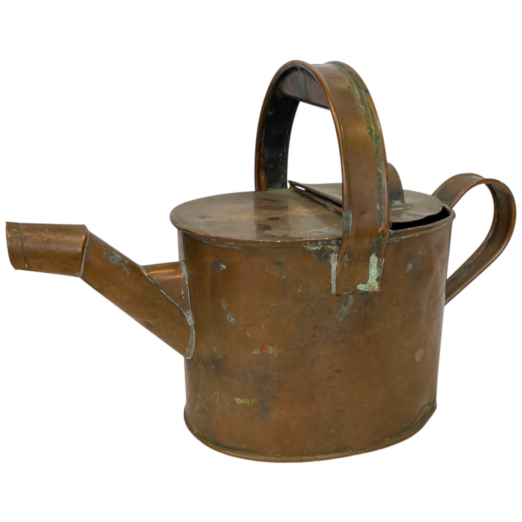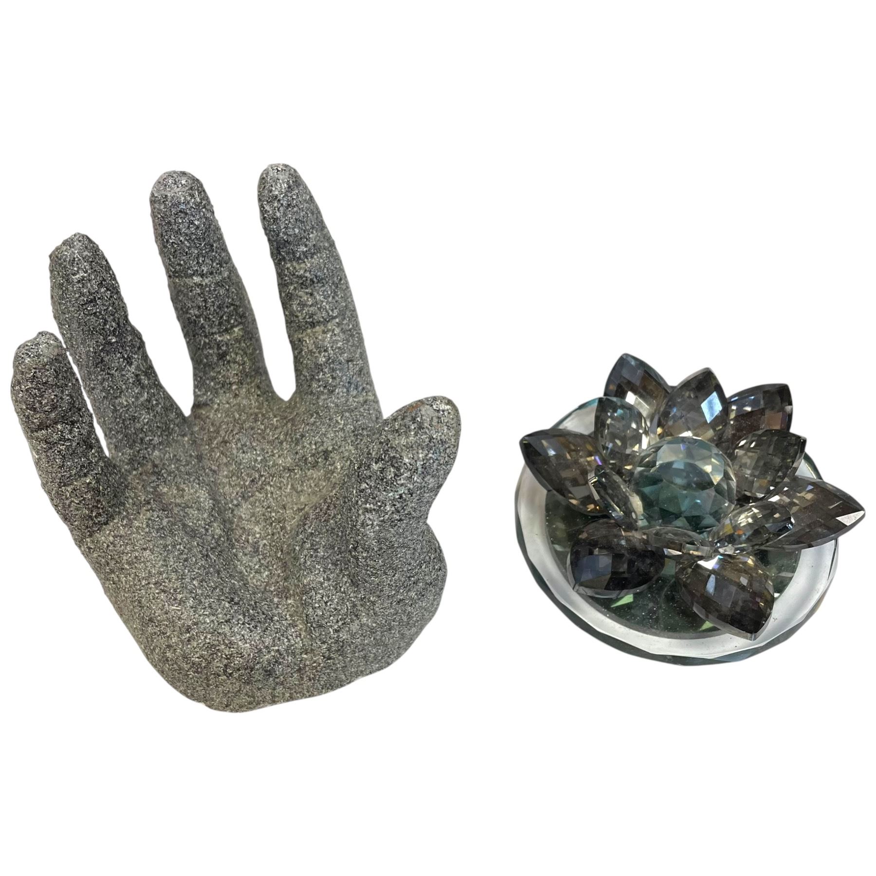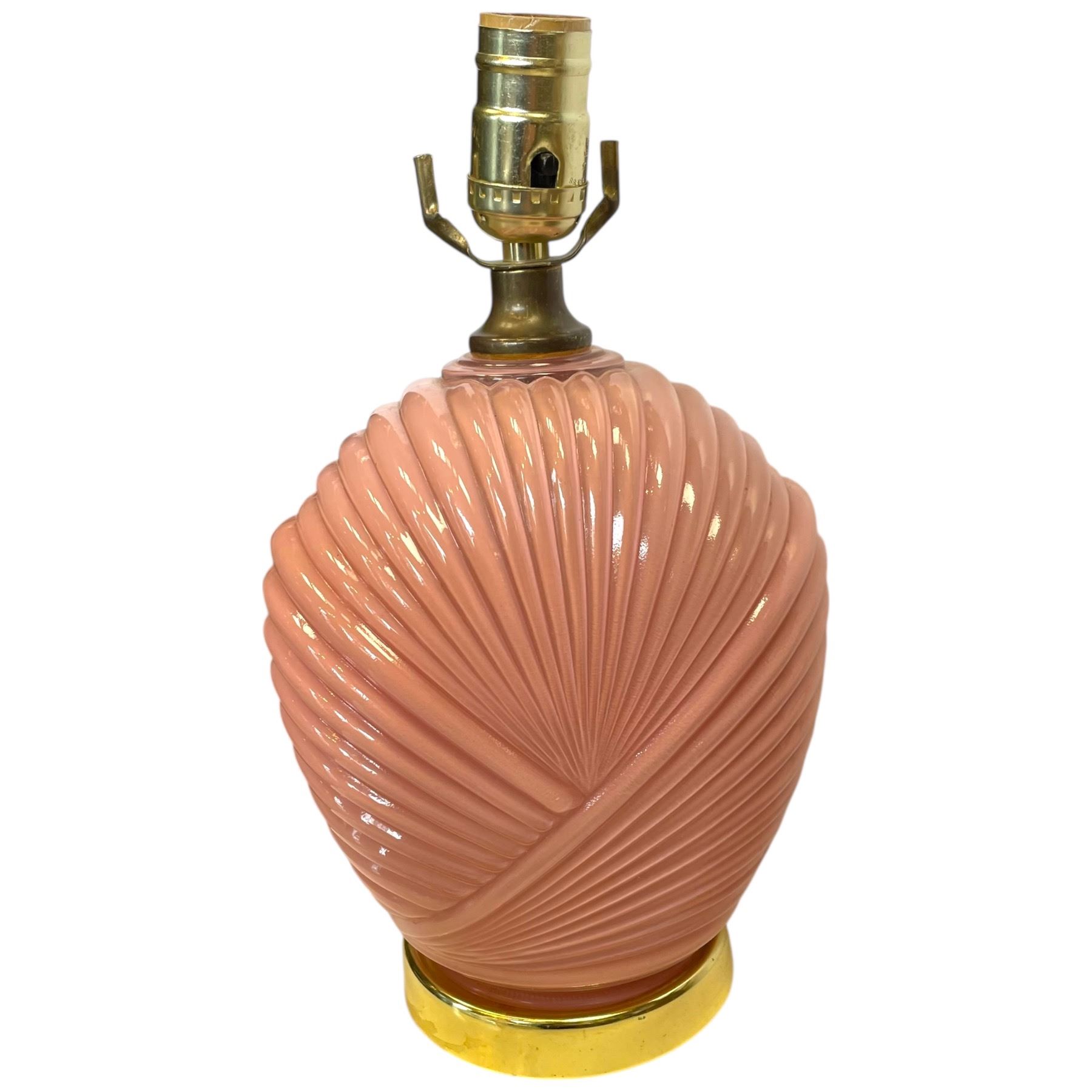 This lot includes a pink shell-shaped table lamp, a clear glass decanter with wide base and narrow neck, and a figural miniature oil lamp with a distinctive base shape. Additional decor features a small watering can planter and other decorative tchotchkes. Items are as pictured.