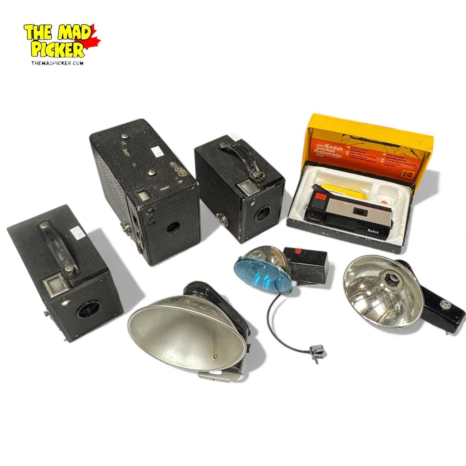 Collection of Vintage Box Cameras, Polaroid Pocket Instamatic and Flashes