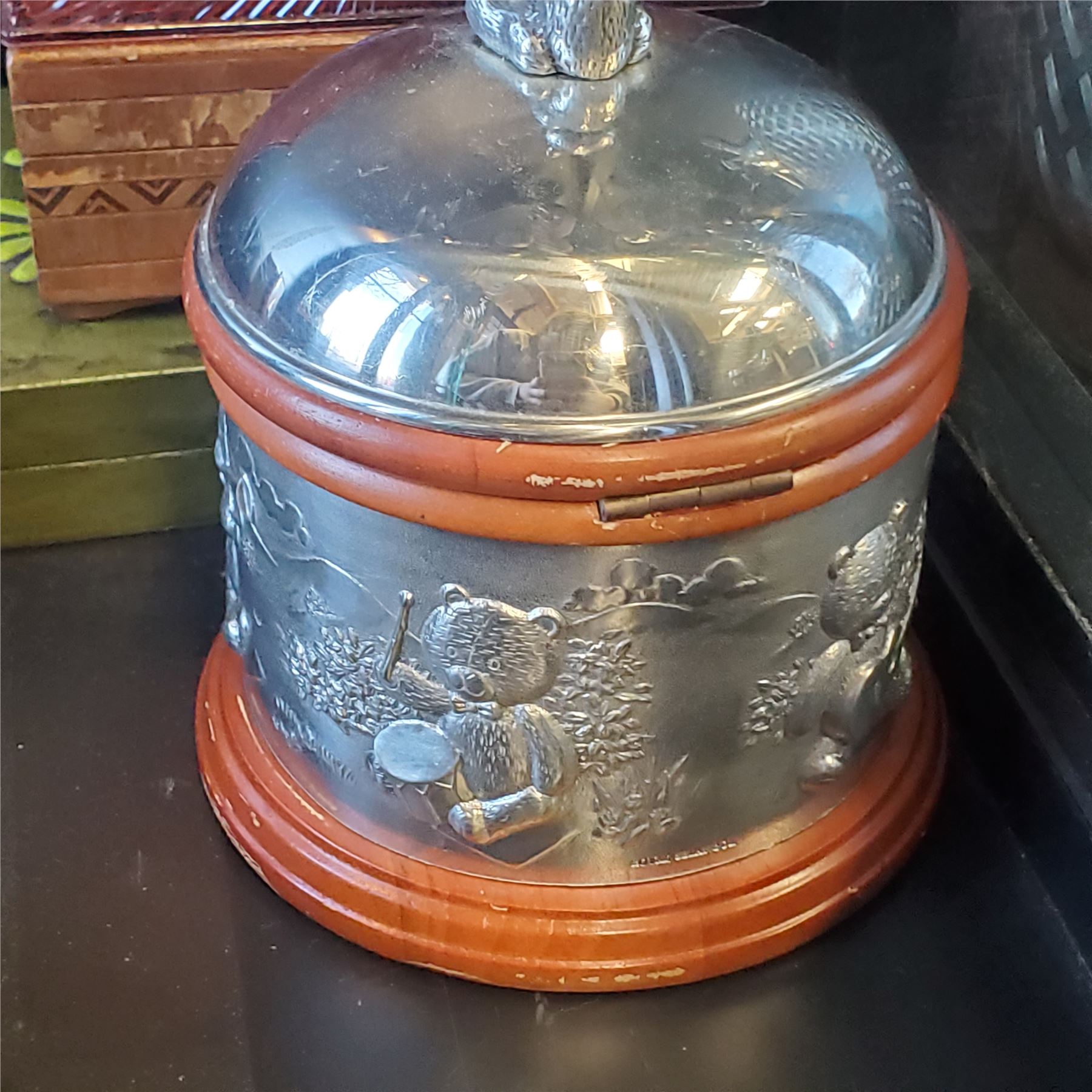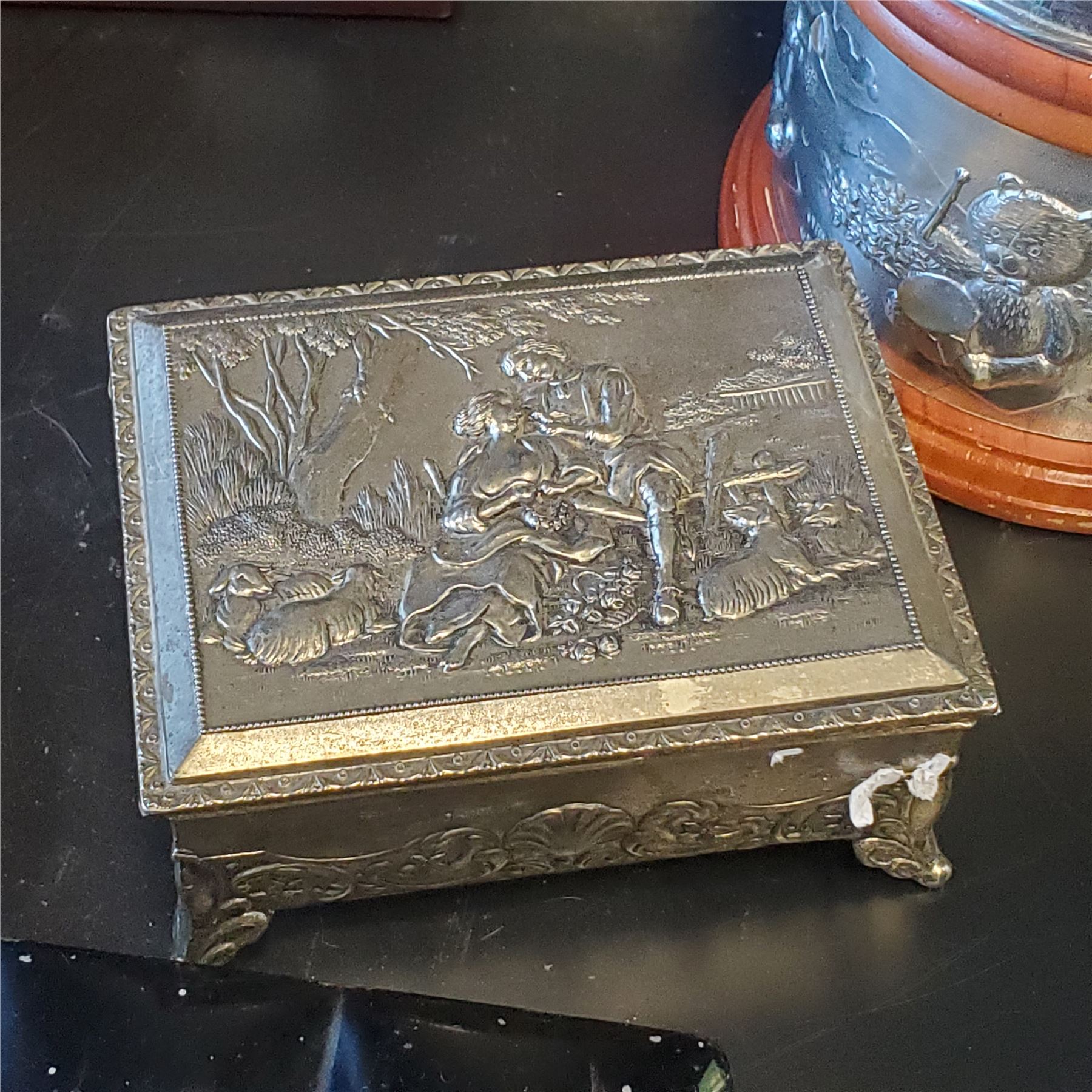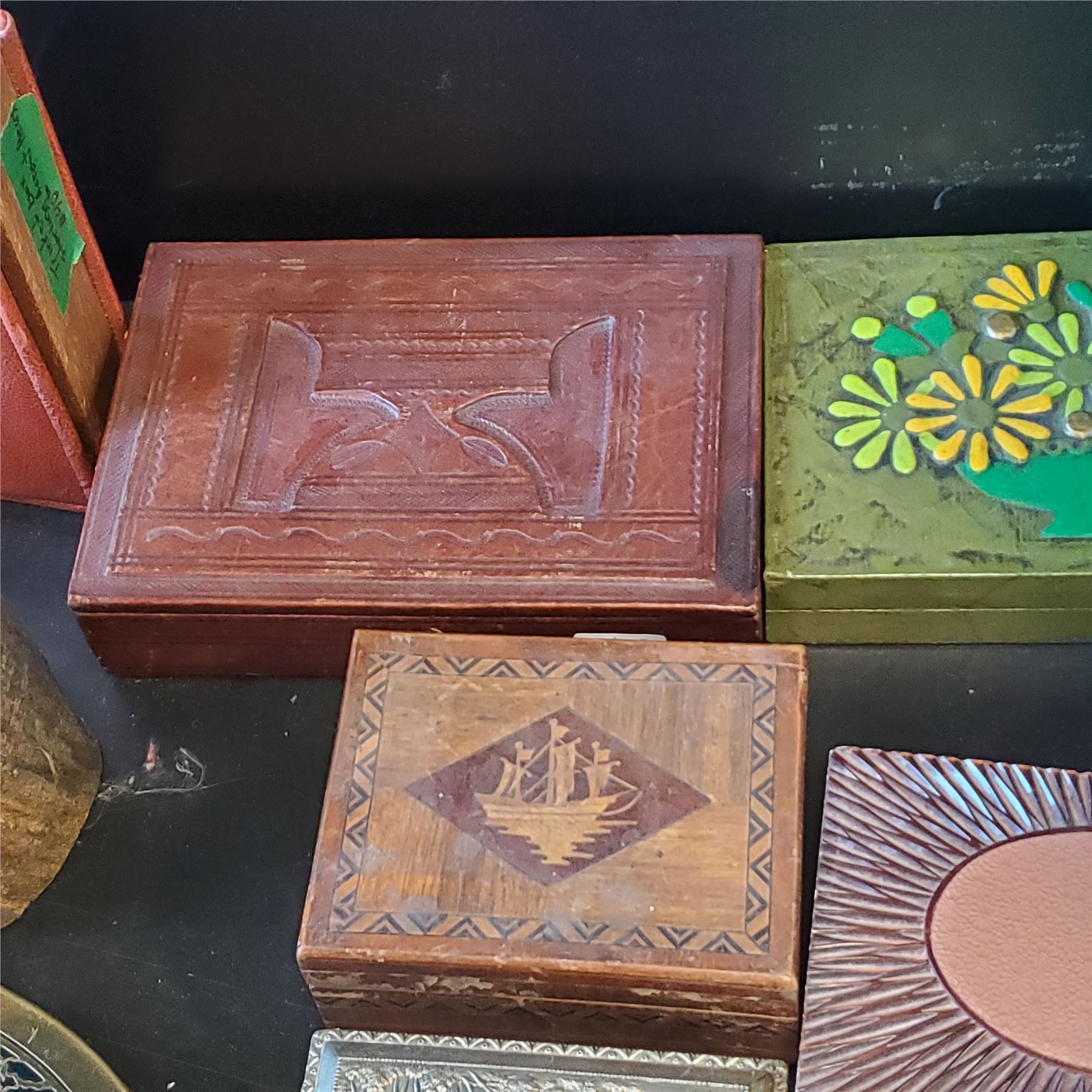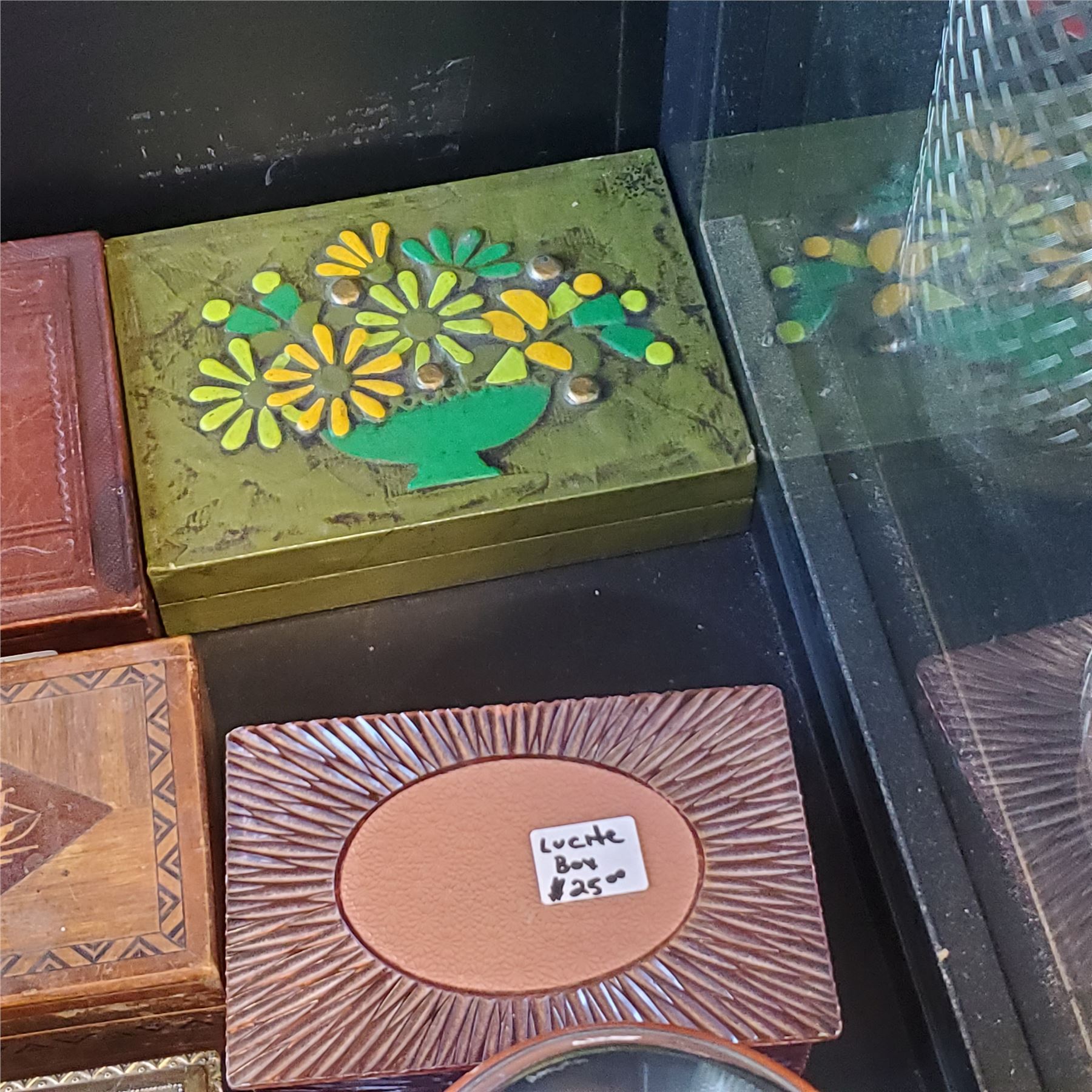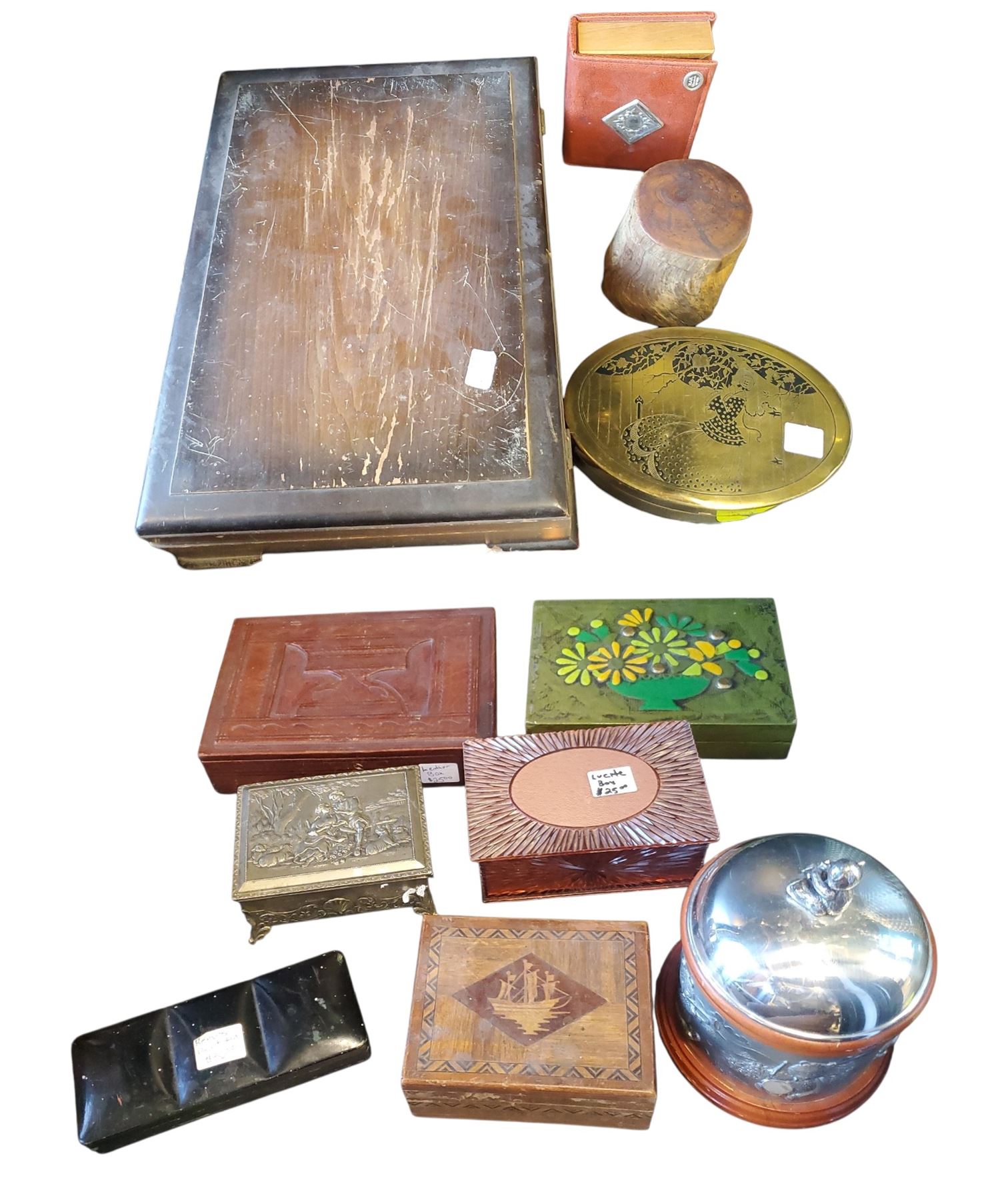 Collection of vintage boxes crafted from various materials including brass, wood, tin, lucite, enamel, pewter, and more. Includes assorted sizes and designs for decorative or functional use. Item is as pictured.