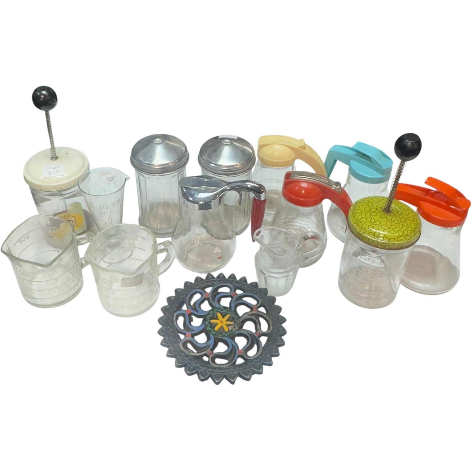 A collection of vintage kitchen collectibles including syrup dispensers, measuring cups, sugar containers, choppers, and additional items. Items show age-appropriate wear. Item is as pictured.