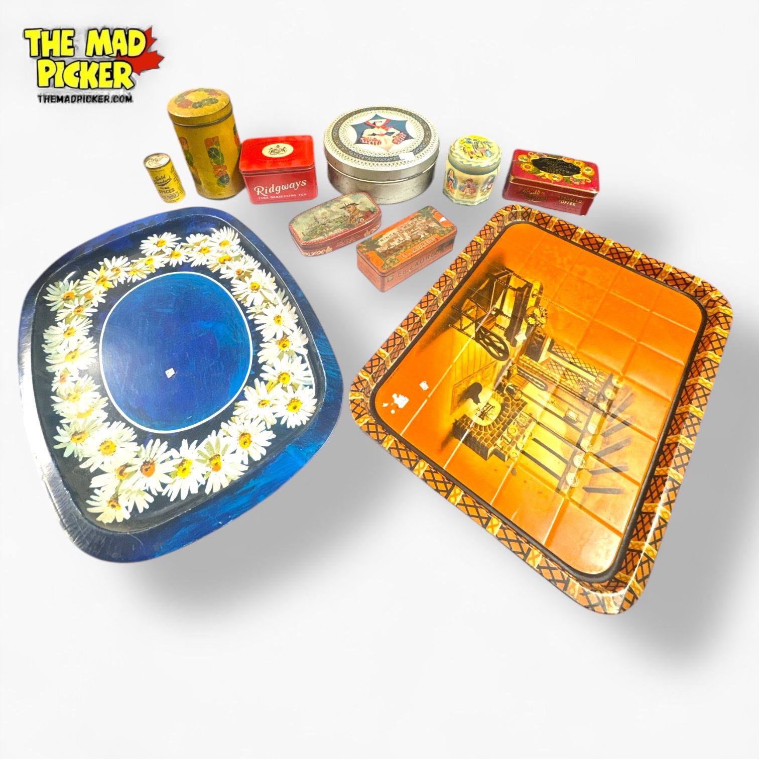 Vintage collection featuring advertising tins and trays from Ridgways Tea, Maison Lyons Toffee, Verkades, and others. Likely mid-20th century. Includes assorted toffee and tea-themed designs. Made of metal with colorful graphic logos, suitable for display or collecting.