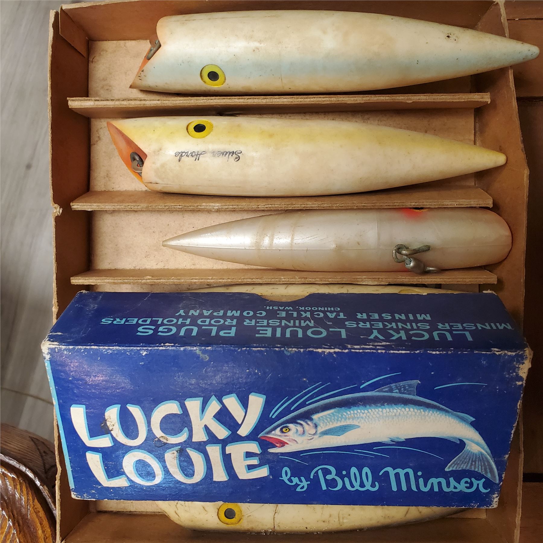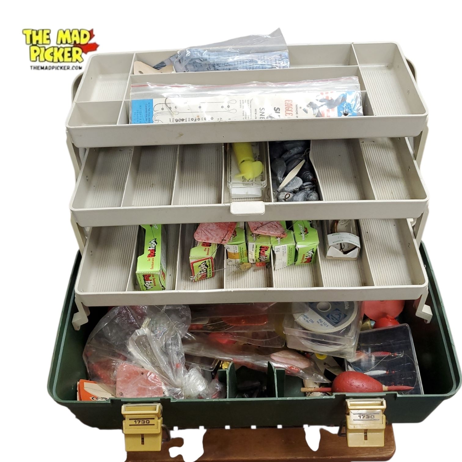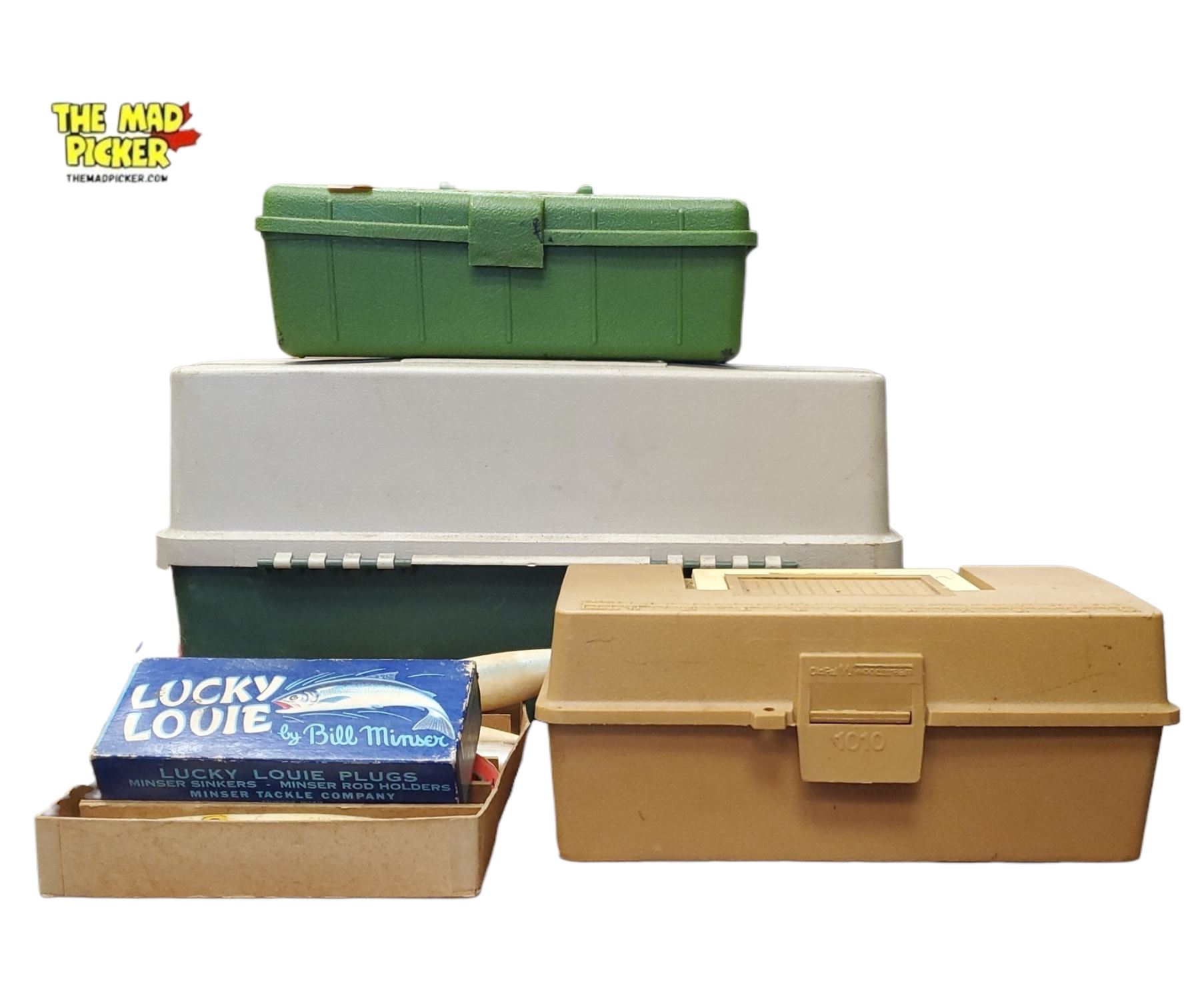 A collection featuring classic Plano tackle boxes and a package of Lucky Louie fishing plugs. Plano tackle boxes are known for their durable design and utility for organizing fishing equipment, while Lucky Louie plugs are renowned for their effectiveness in fishing, particularly for salmon and other game fish.