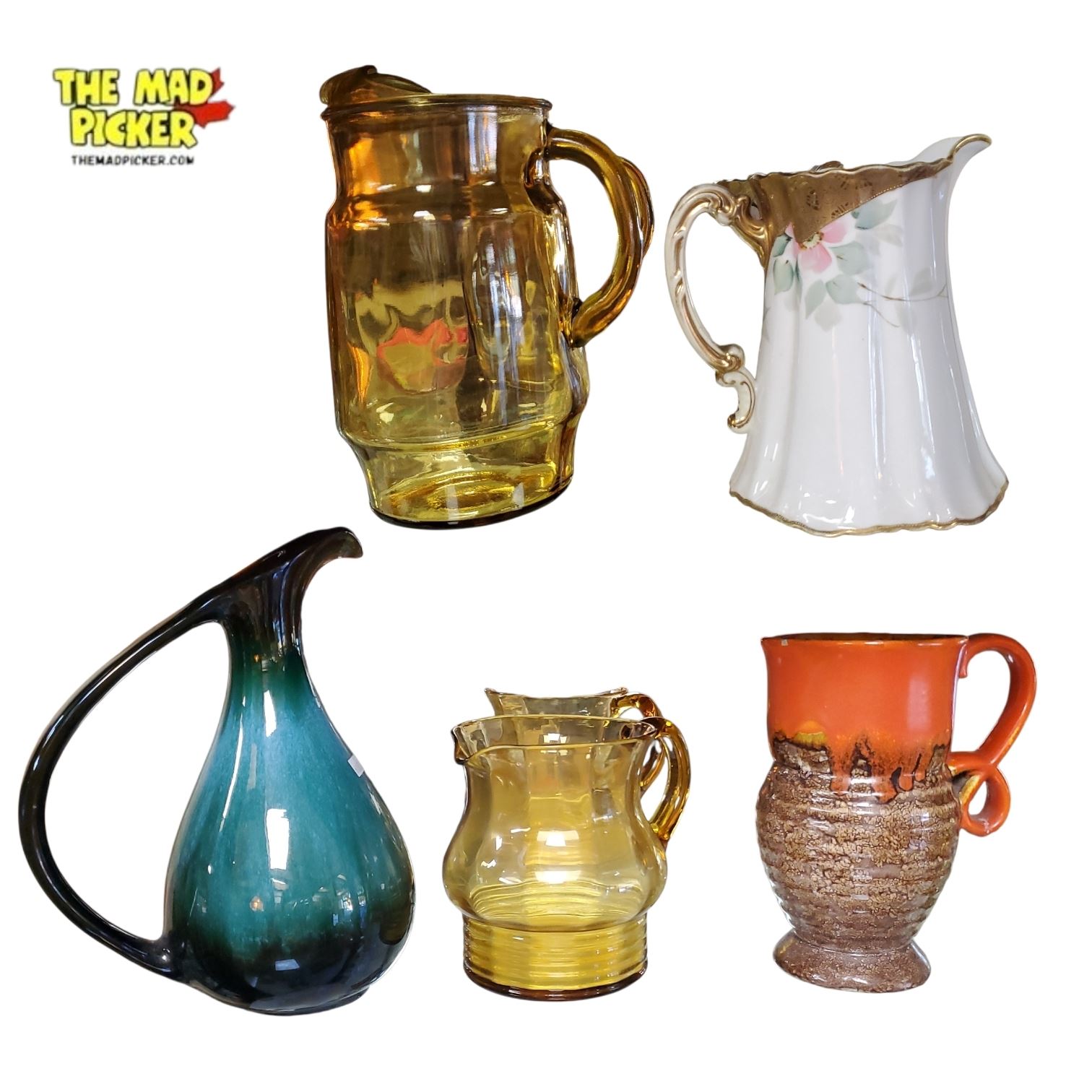 A mixed collection of vintage and antique pitchers. Includes a tall amber glass hand-blown pitcher, possibly Victorian; a white porcelain pitcher with floral details; a blue and black art glass ewer; a small amber crackle glass pitcher, and an orange and brown crackle glass pitcher, likely 1960s-70s art glass by Pilgrim, Blenko, or Kanawha.