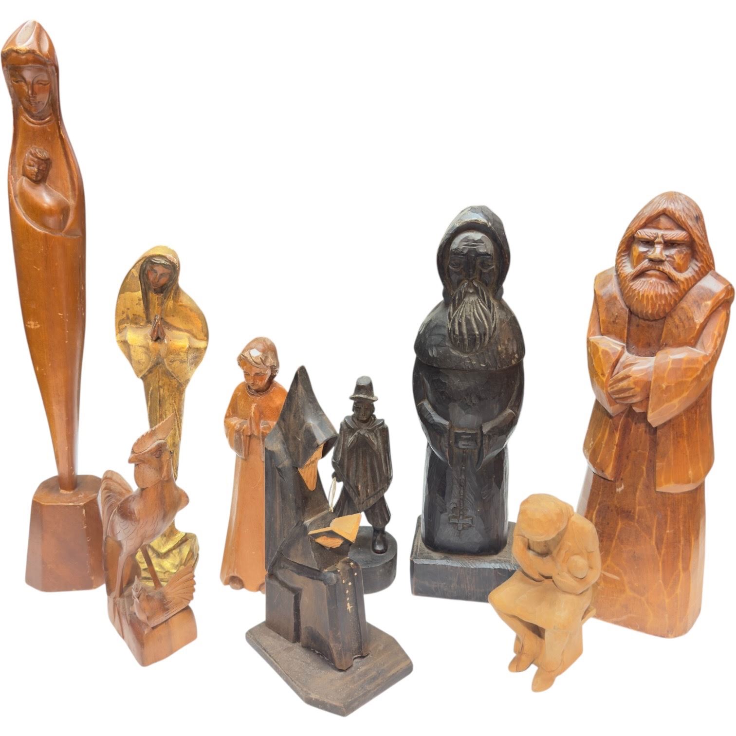 Collection of 9 wood carved folk art figurines. Includes various designs and intricate detailing. Tallest piece measures 16.5-Inch. All pieces are handcrafted and unique. Item is as pictured.