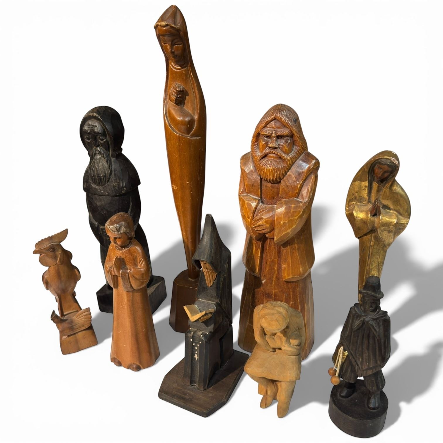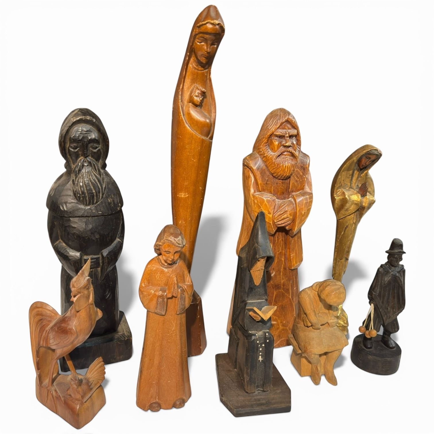 Collection of Wood Carved Folk Art Figurines 9 Pieces Tallest 16.5-Inch