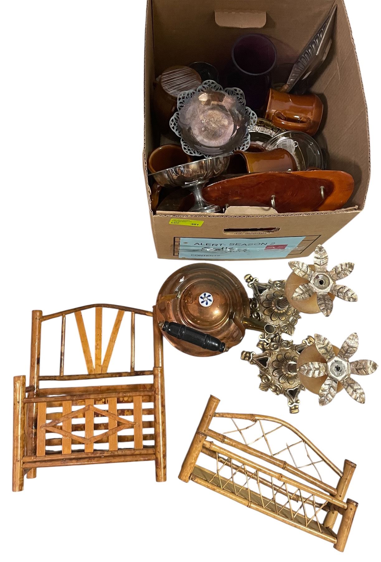 Collection of vintage candle holders, copper kettle, key holders, etc.