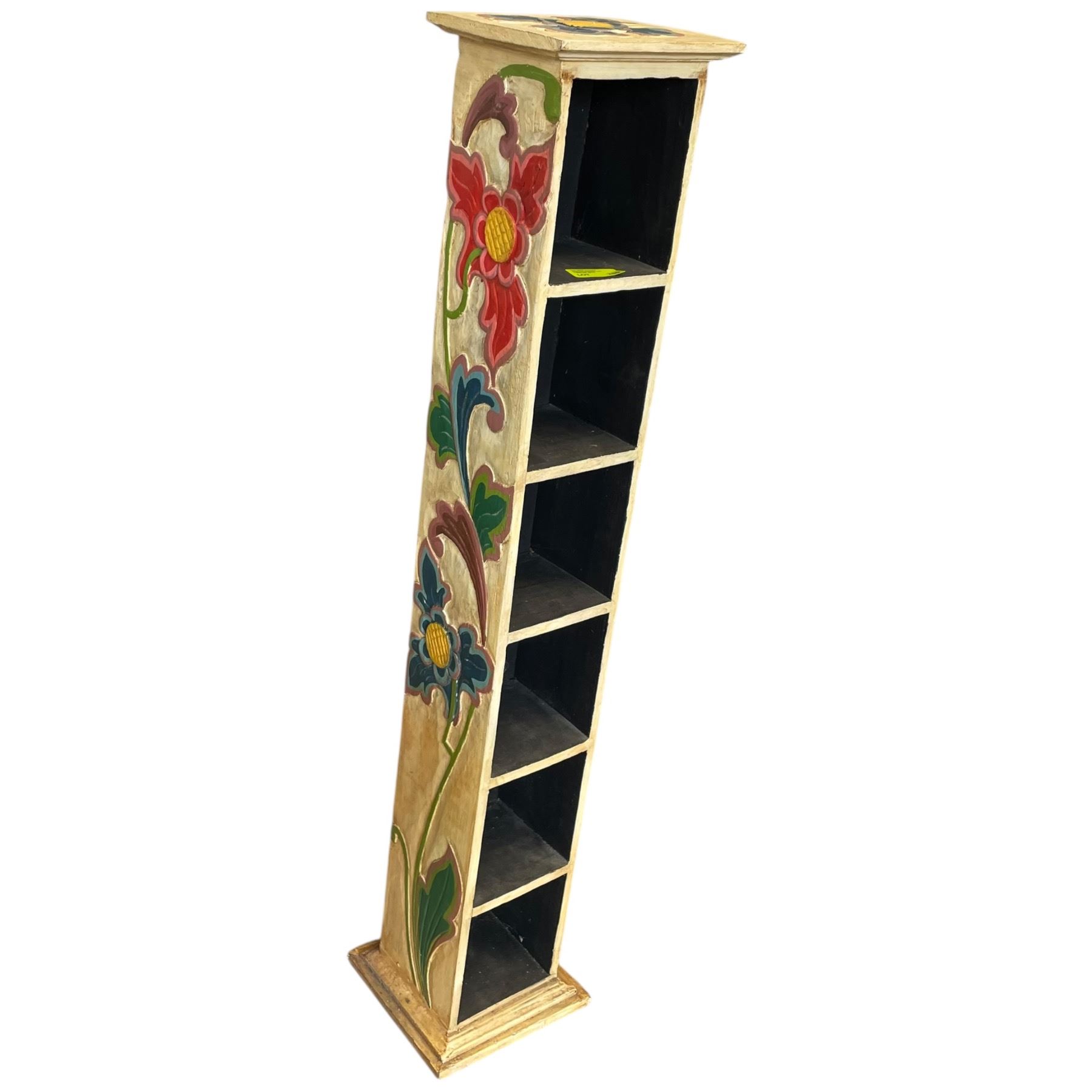 Contemporary folk art floor standing bookcase featuring a carved and hand-painted floral motif. Measures 8x7.5x45-Inch. Wooden construction with decorative detailing throughout. Suitable for books or decorative items. Item is as pictured.