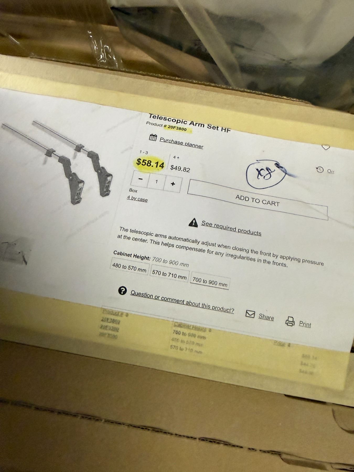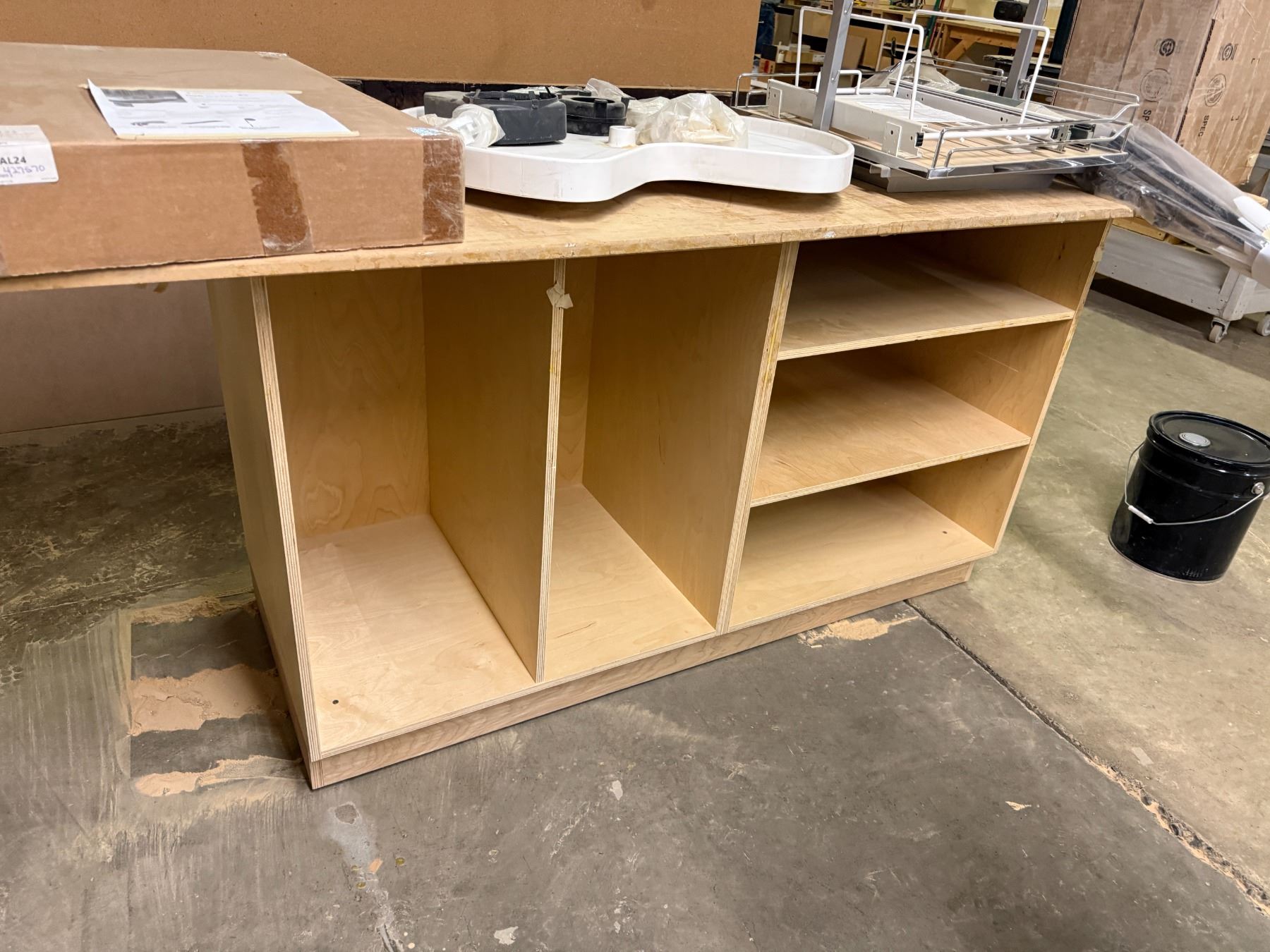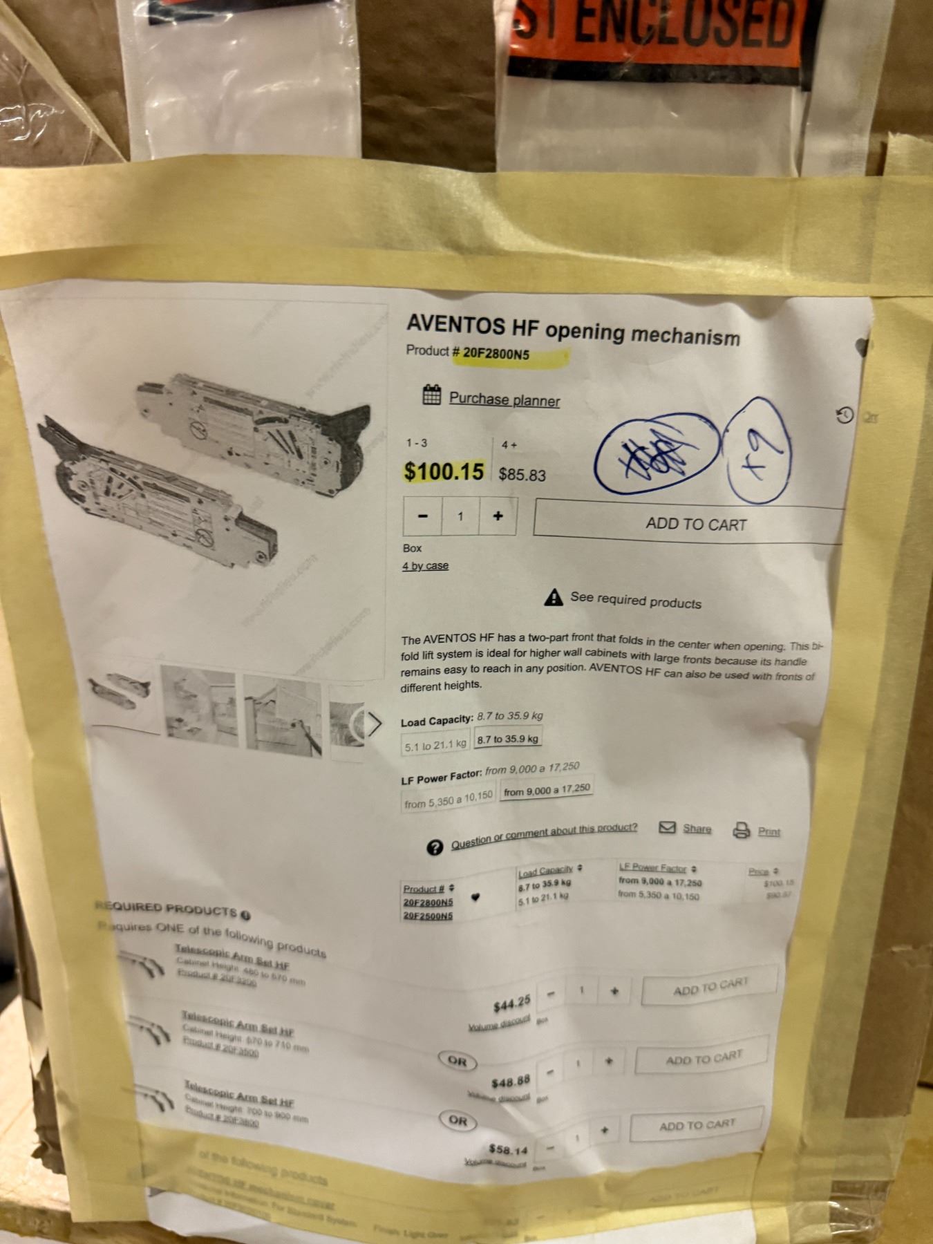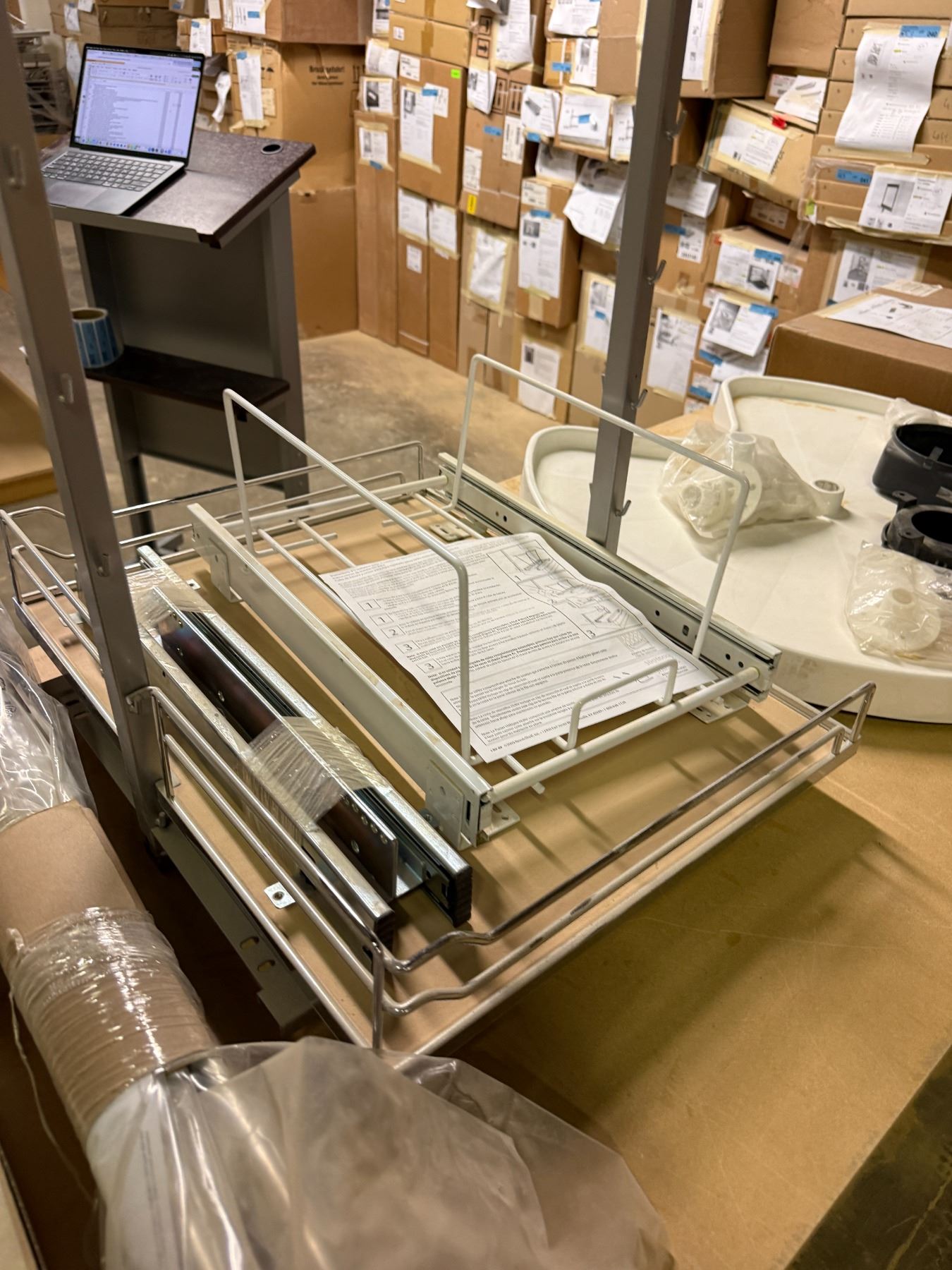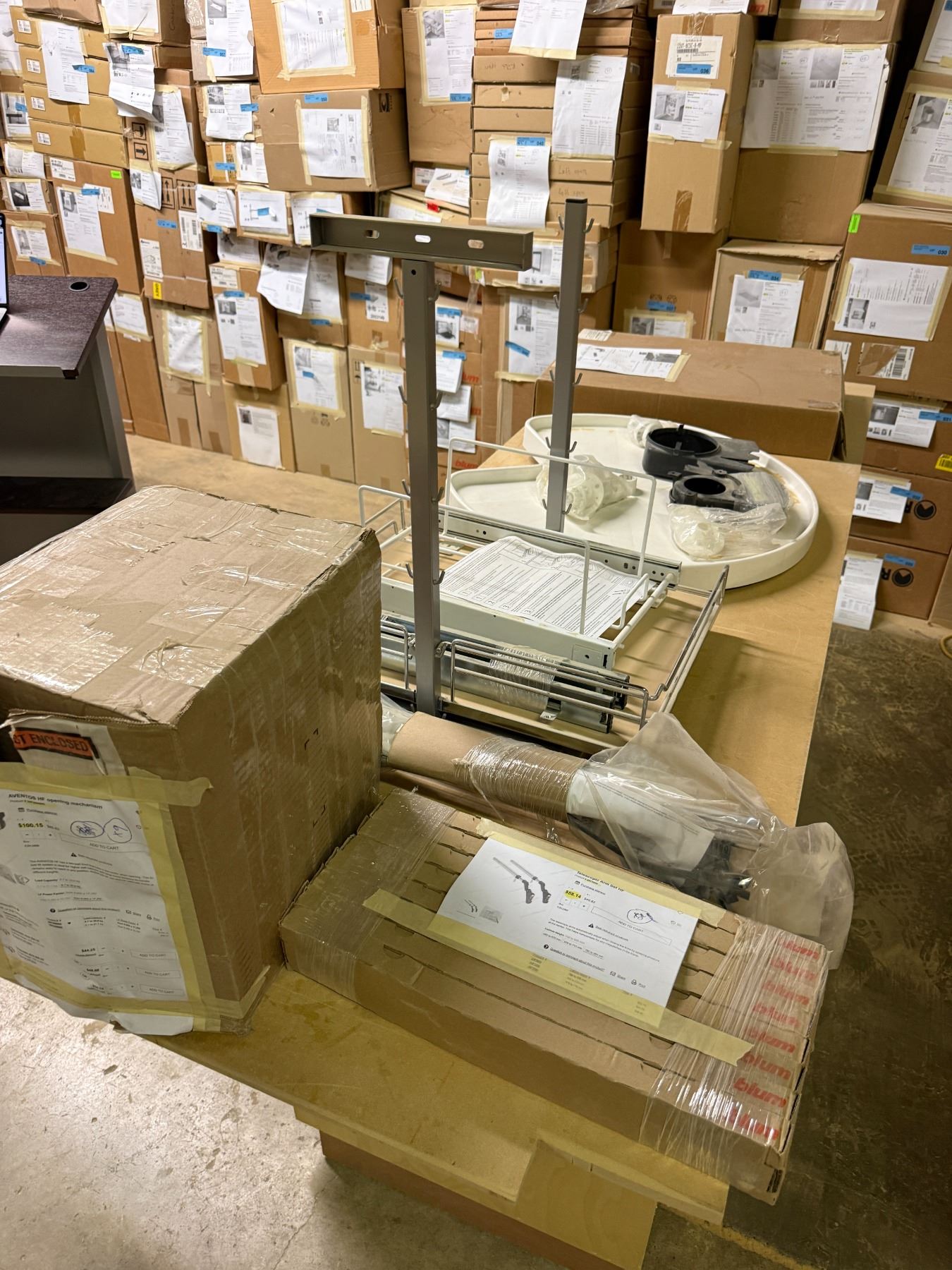 Contents of table - Rev-A-Shelf Aventos Opening mechanisms (x9), Tandem slid Stabilistation (x4), Lazy susan tray, undermount basket & wood vaneer tambour door - Approx. Value = $1,275