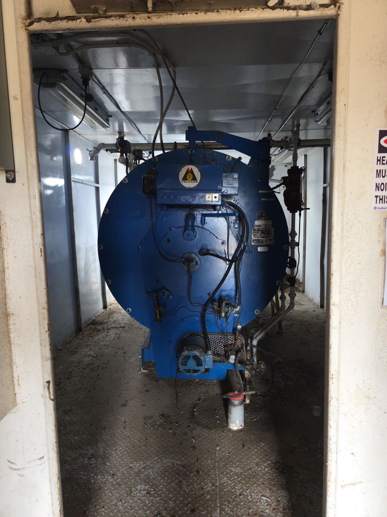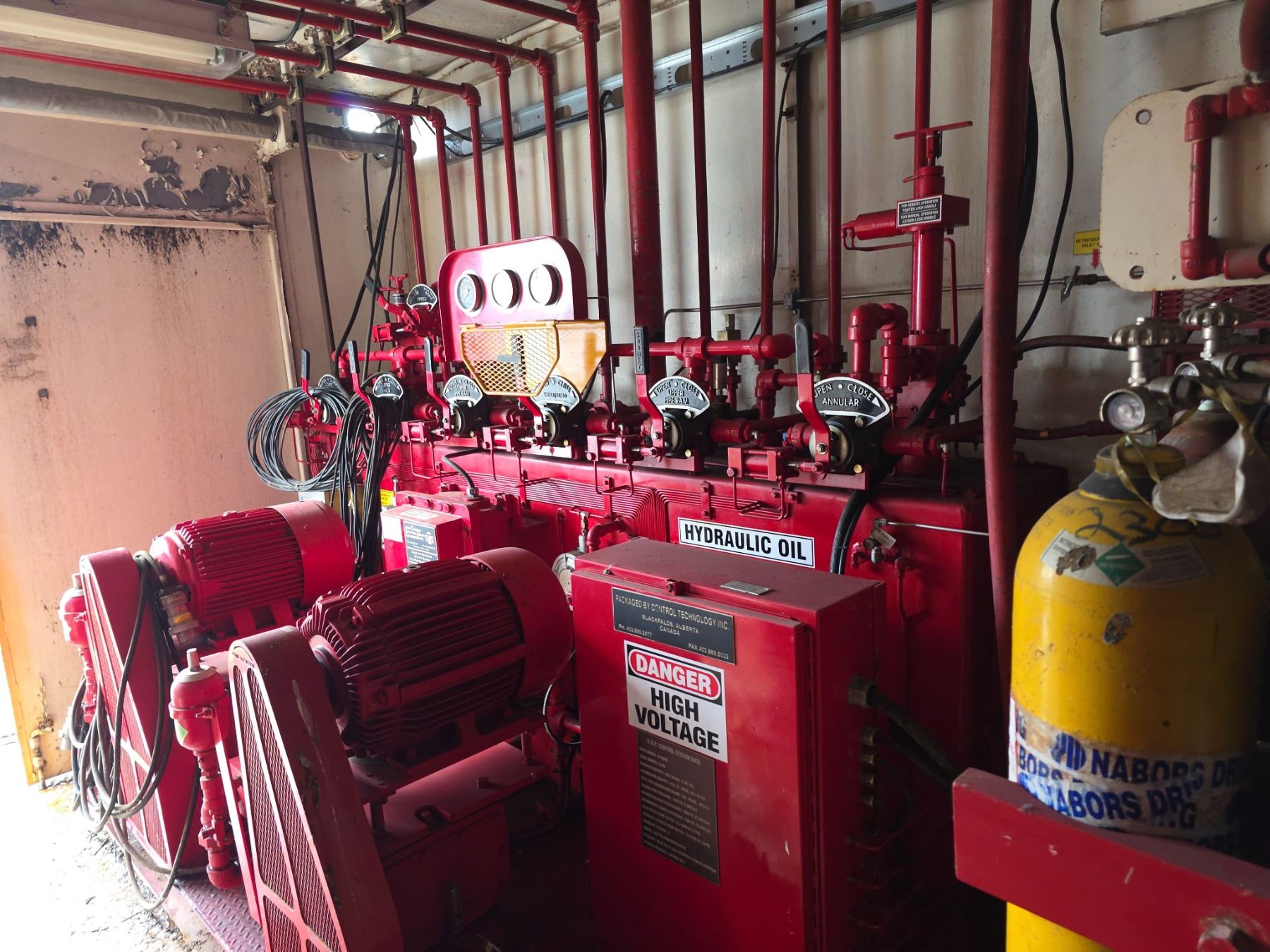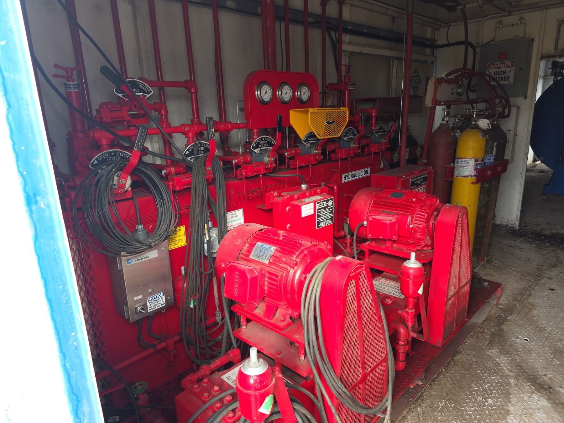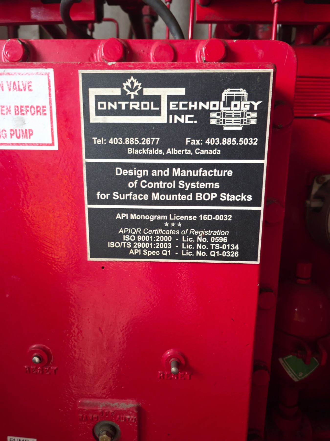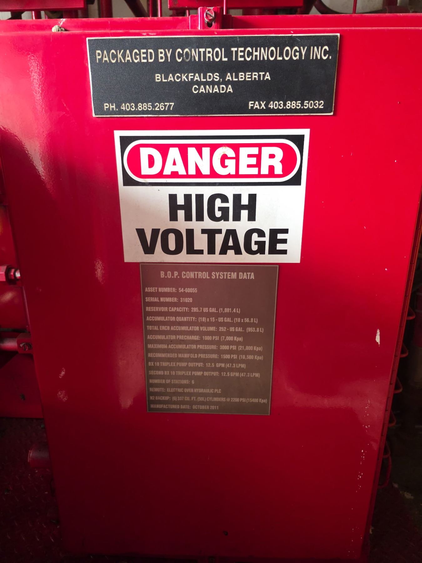 Control Technology Inc. mobile blow out prevention control unit w/ 285g boiler. 18x58.8L Accumulator Volume, 1,000psi accumulator pre charge (3,000psi maximum pressure), 953.8L Total ERCB Accumulator volume, 1,500psi manifold pressure, 6 stations, 12.5gpm triplex pump (and backup), electric over hydraulic,