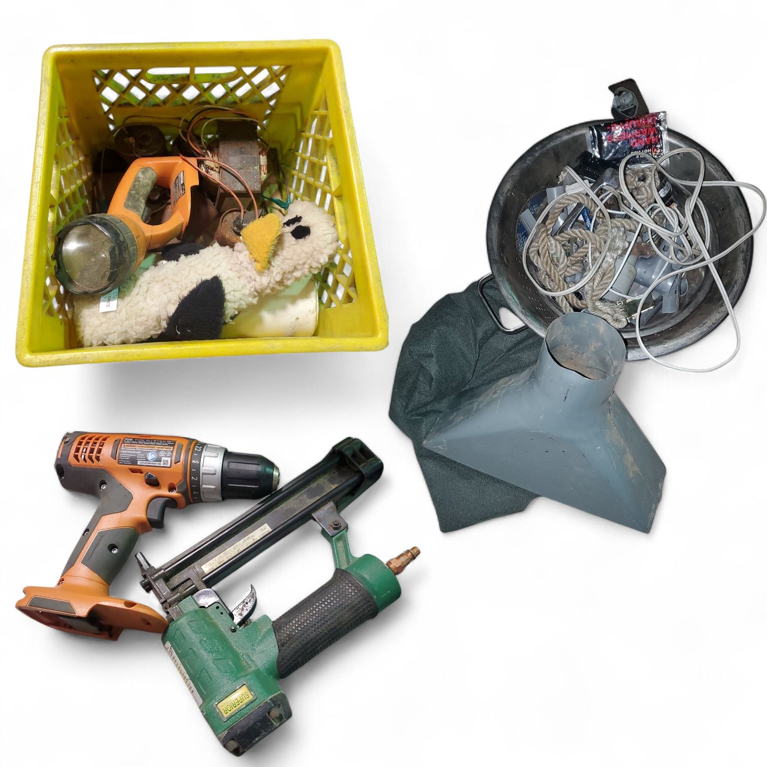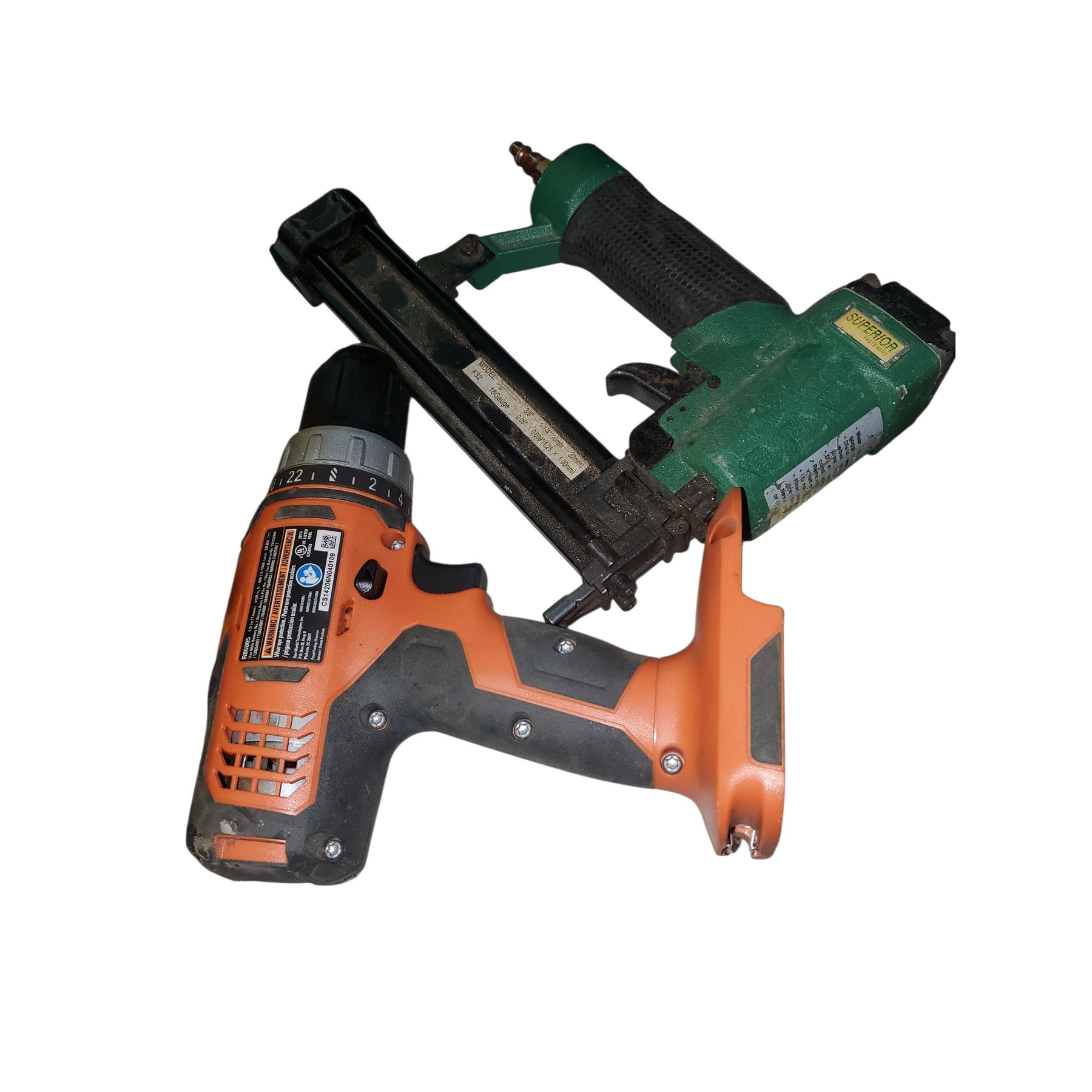 Cordless Drill (Model: R86005), Nail Gun, and Misc Items