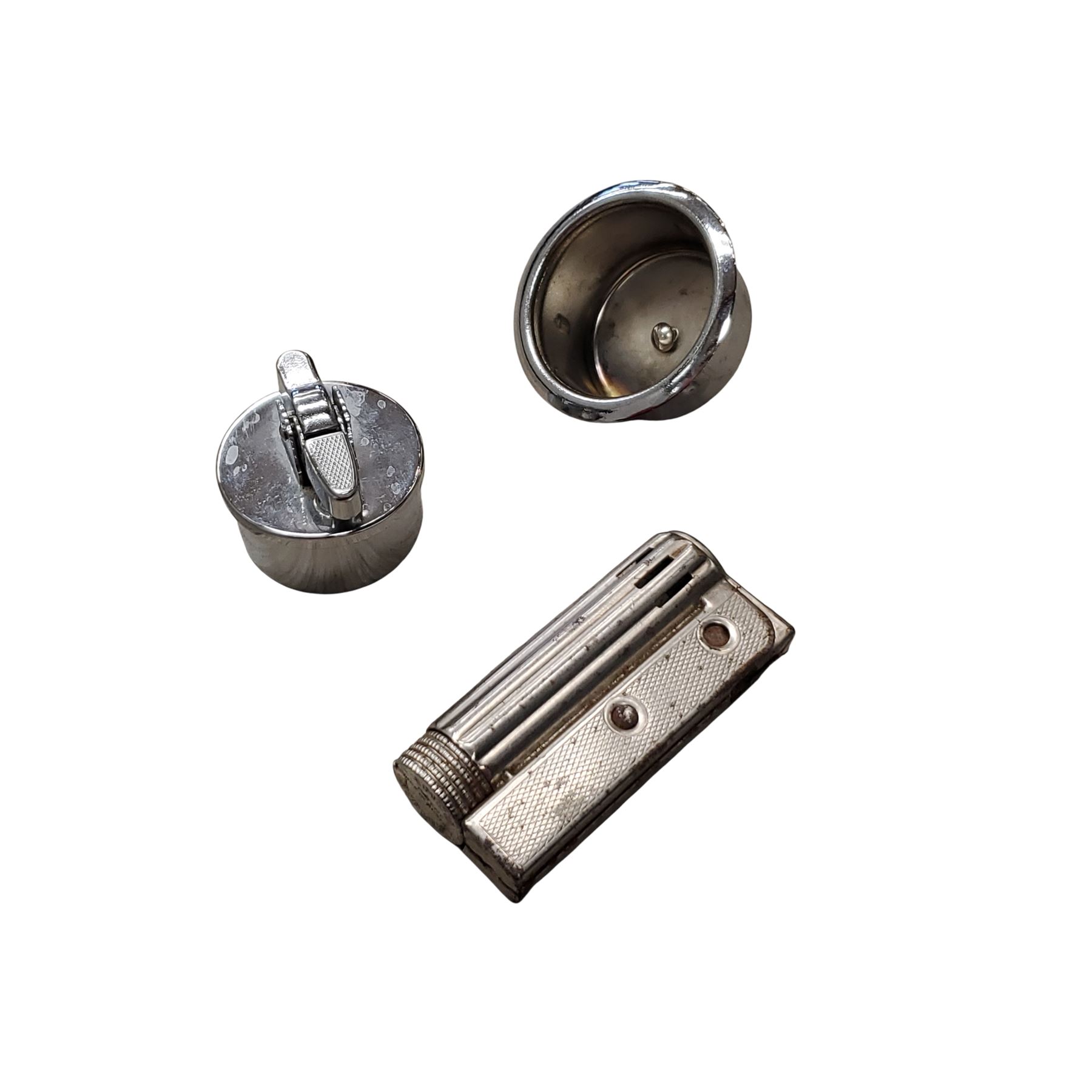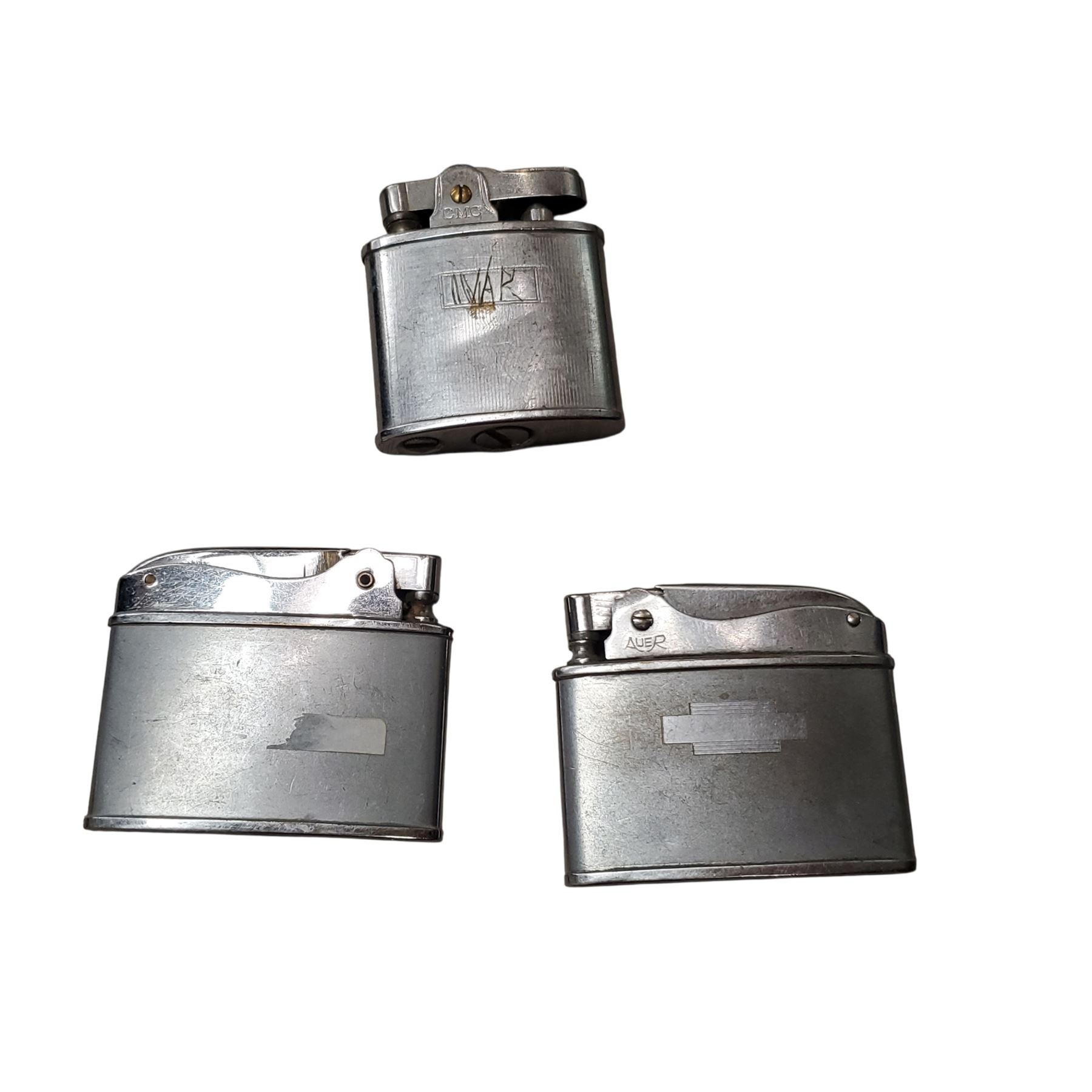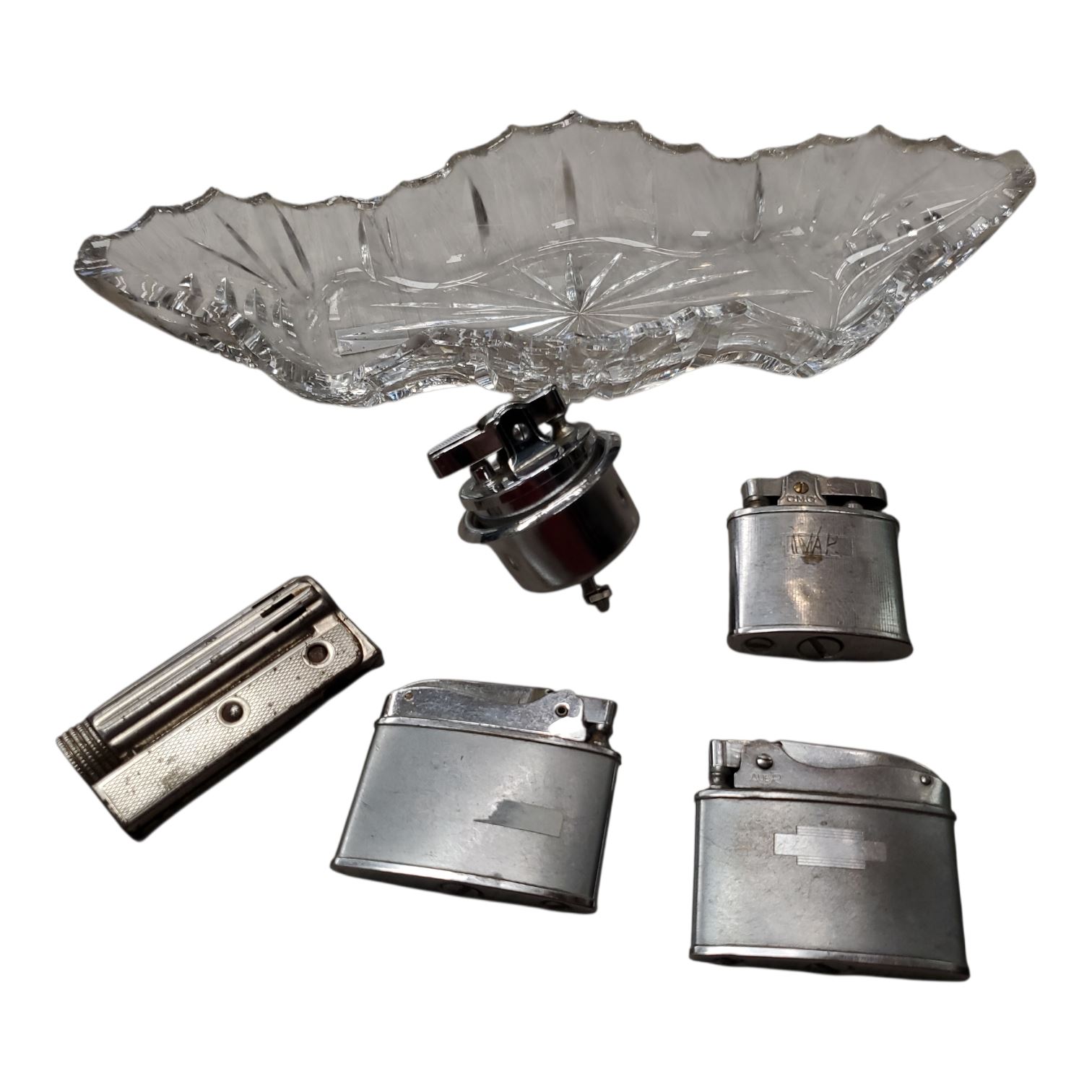 Cut glass bowl containing four vintage lighters of various brands: Auer, IMCO Triplex, Continental, and Nisco. Combination features metal-bodied lighters in different designs. A unique collectible set, showcasing mid-20th-century lighter craftsmanship.